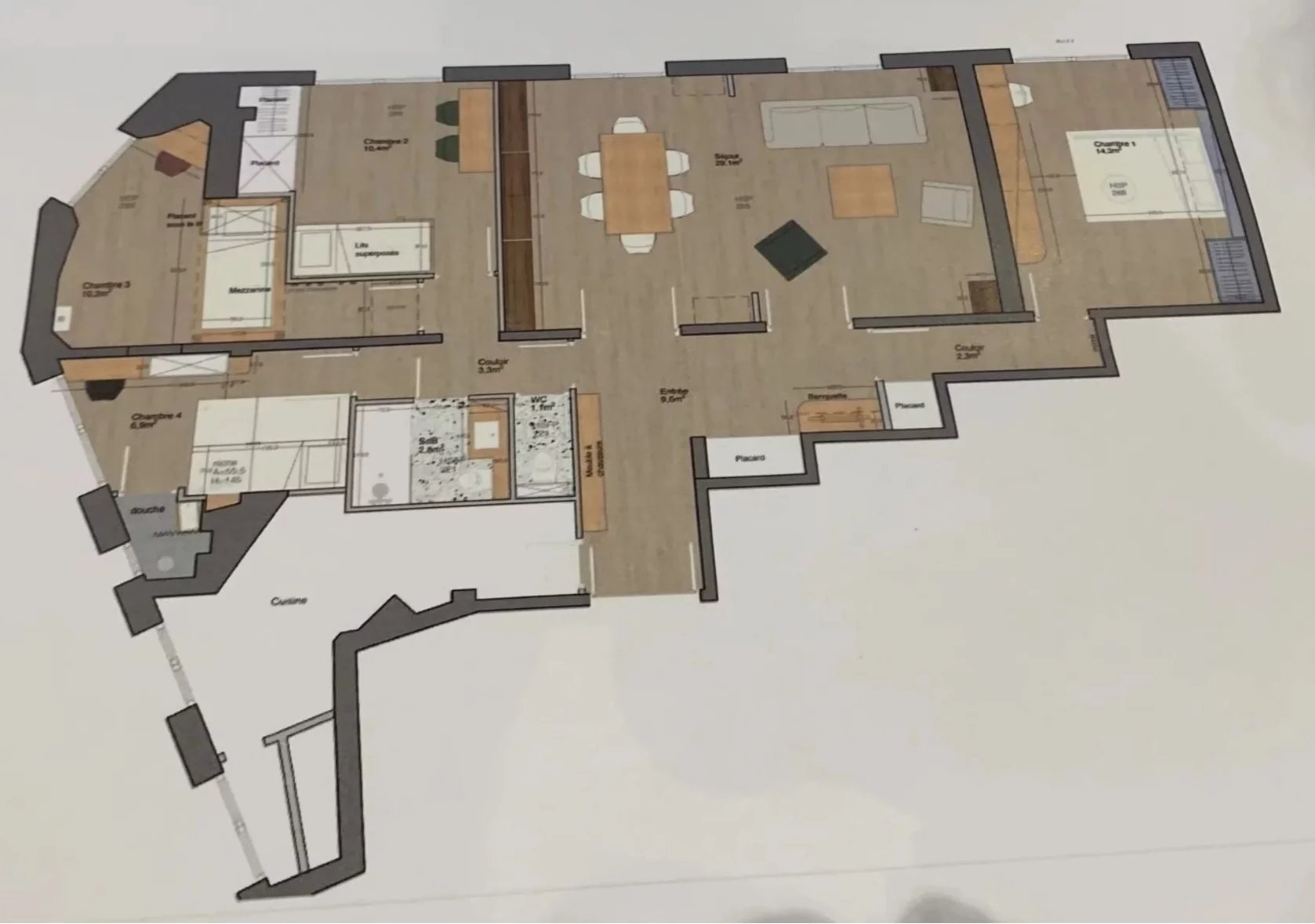 Il se compose d'une entrée avec placards donnant sur un double séjour de 29m², une cuisine séparée aménagée de 10m², 4 chambres, 1 salle de bain, 1 salle d'eau et 2 toilettes. Volets dans toutes les pièces. Une Cave de 5m²