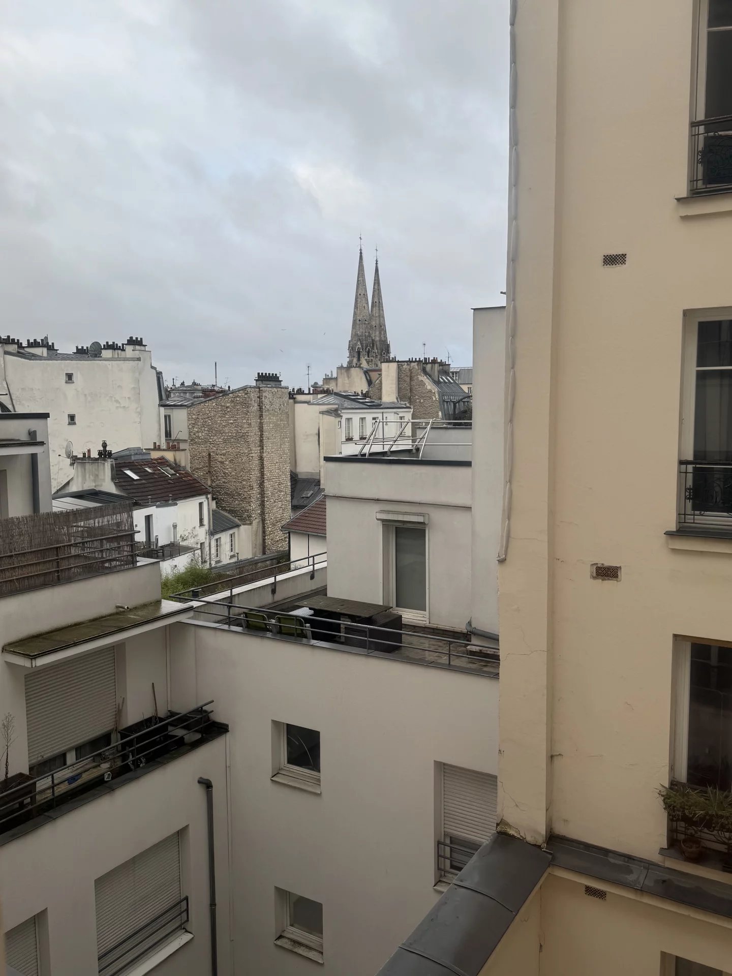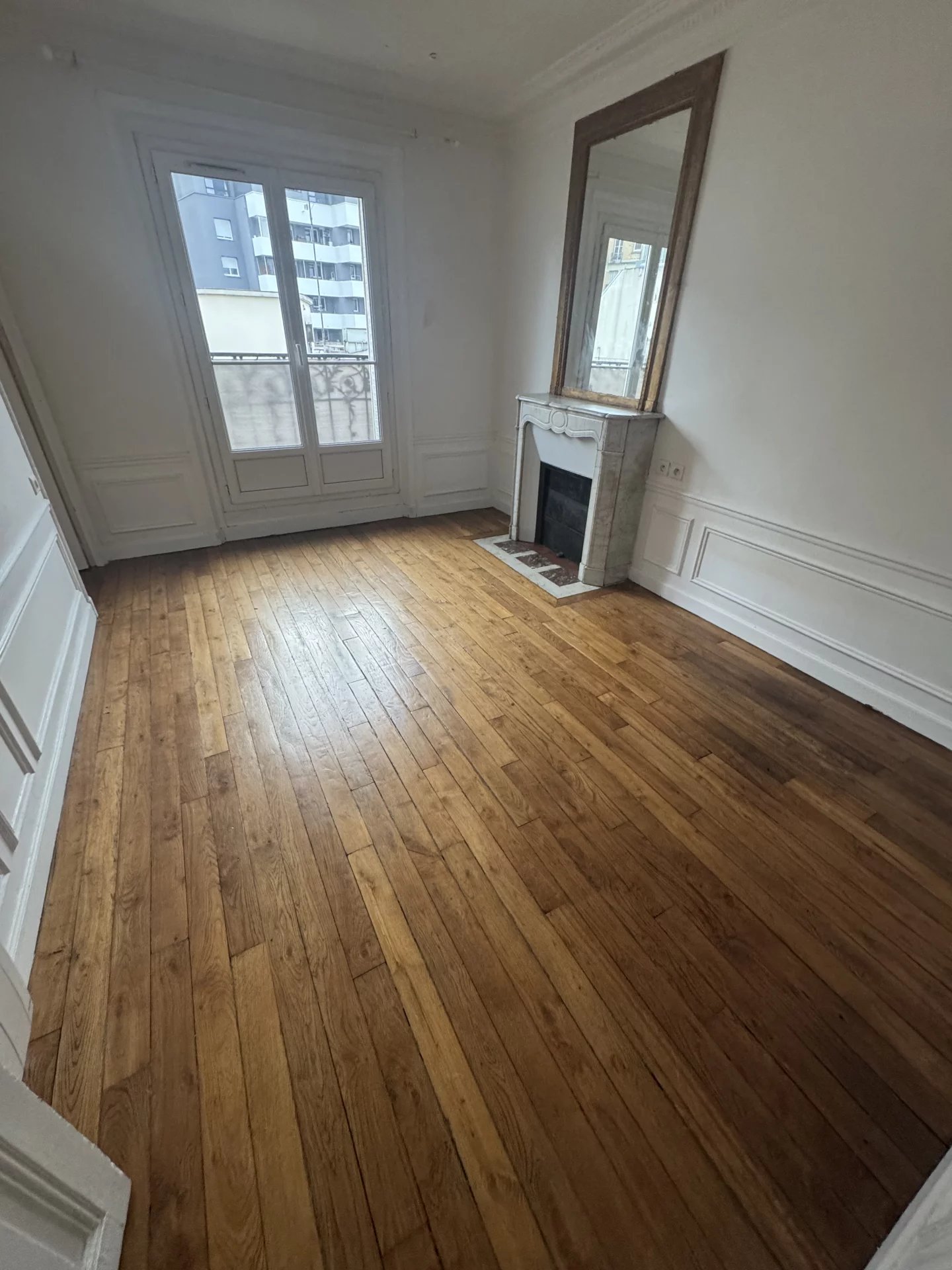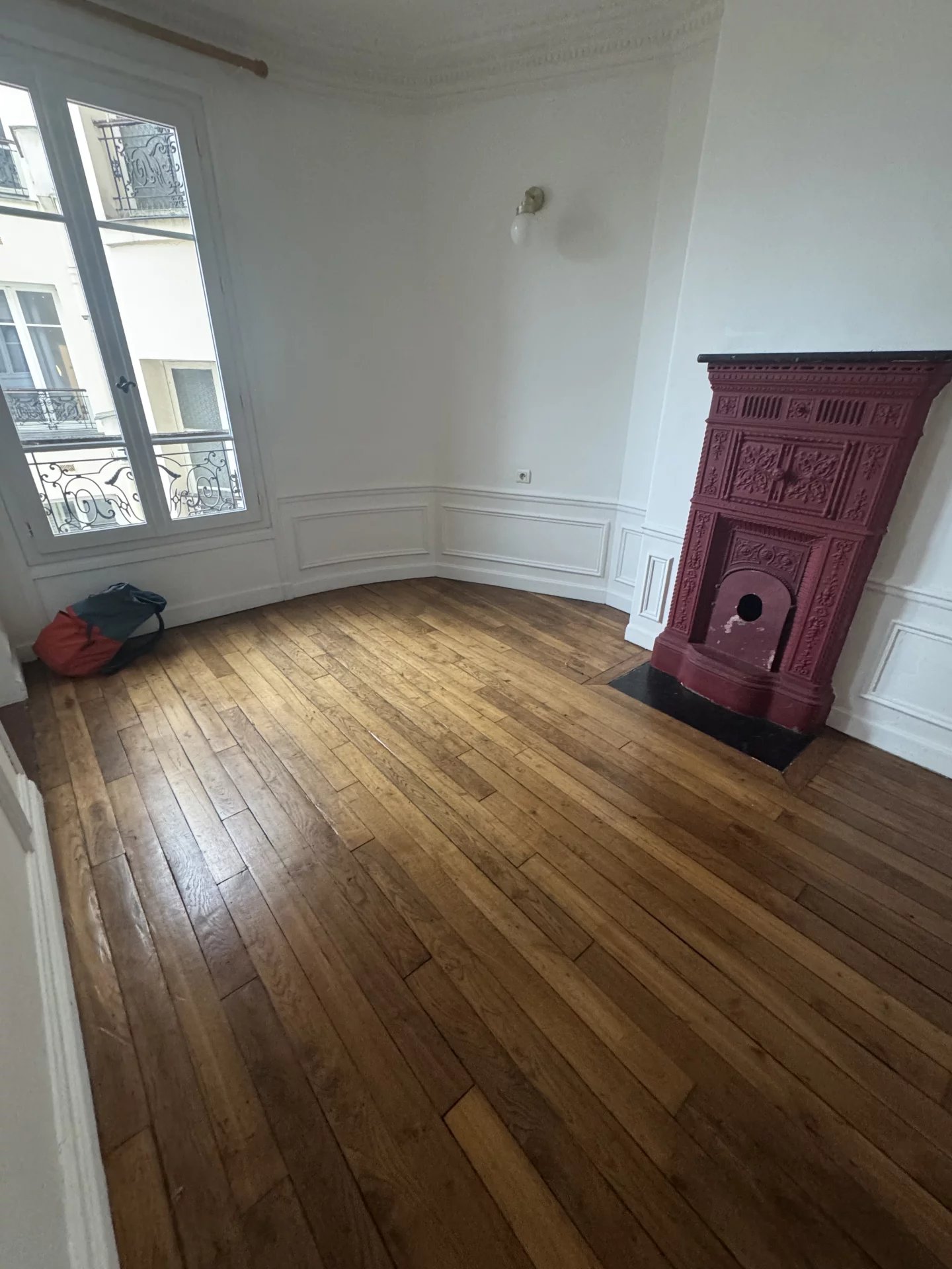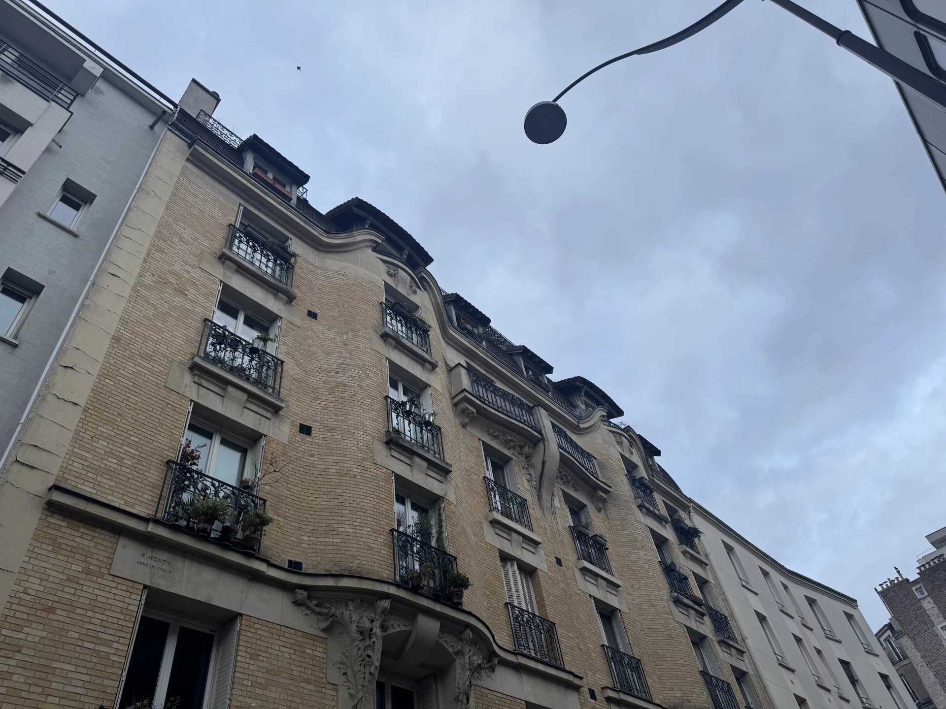 Entre Jourdain et Place des Fetes, au 4eme étage sans ascenseur dans un bel immeuble en briques, un appartement de 3 pièces de 45m², traversant, composé d'une entrée, une salle d'eau avec WC, deux pieces avec balcon coté rue, vue dégagée, et une cuisine ouverte sur une piece de vie coté cour. parquet, cheminées. Une cave. Immeuble propre.