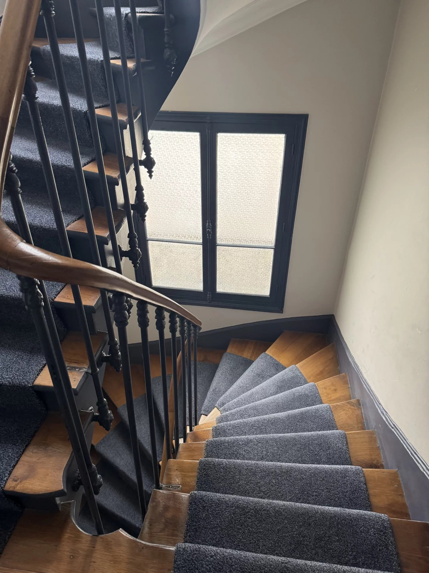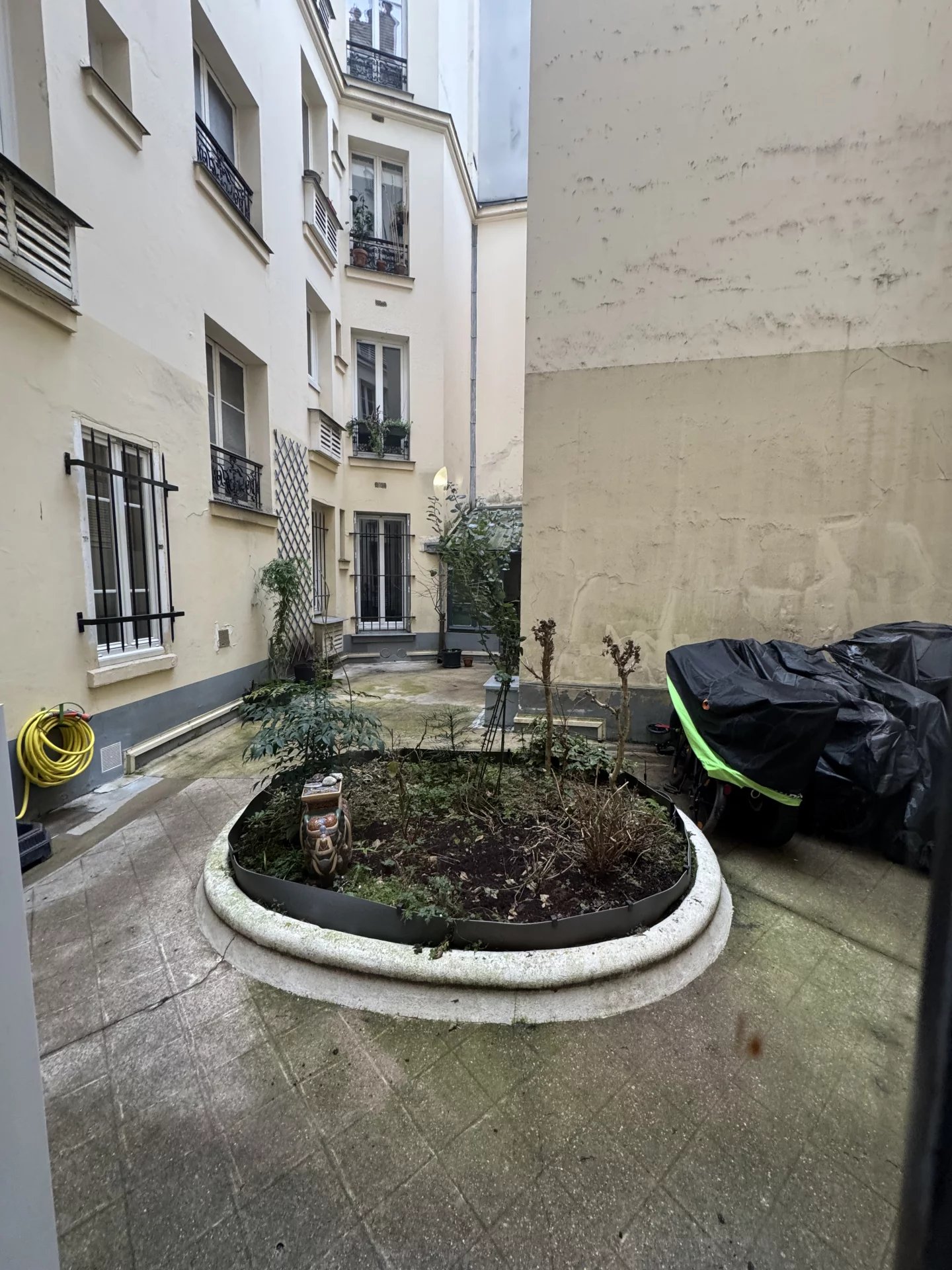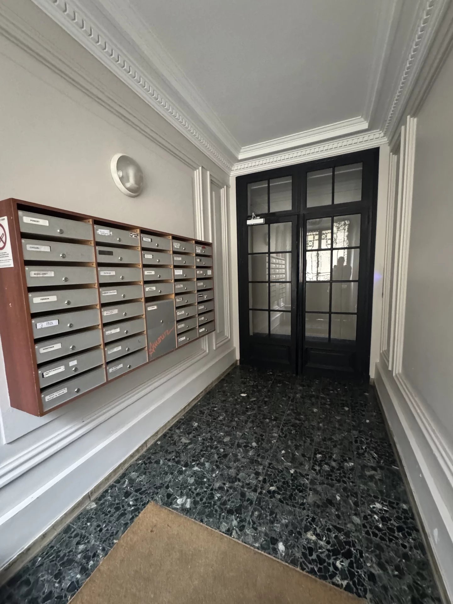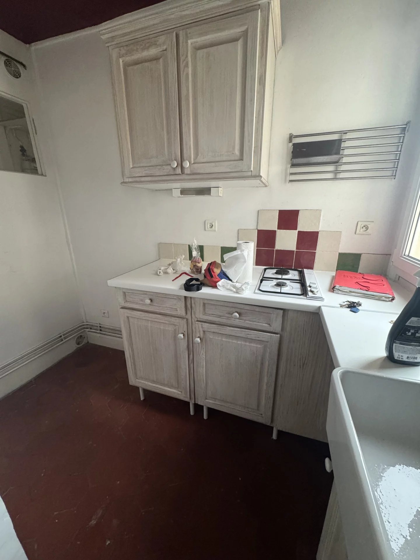 Entre Jourdain et Place des Fetes, au 4eme étage sans ascenseur dans un bel immeuble en briques, un appartement de 3 pièces de 45m², traversant, composé d'une entrée, une salle d'eau avec WC, deux pieces avec balcon coté rue, vue dégagée, et une cuisine ouverte sur une piece de vie coté cour. parquet, cheminées. Une cave. Immeuble propre.