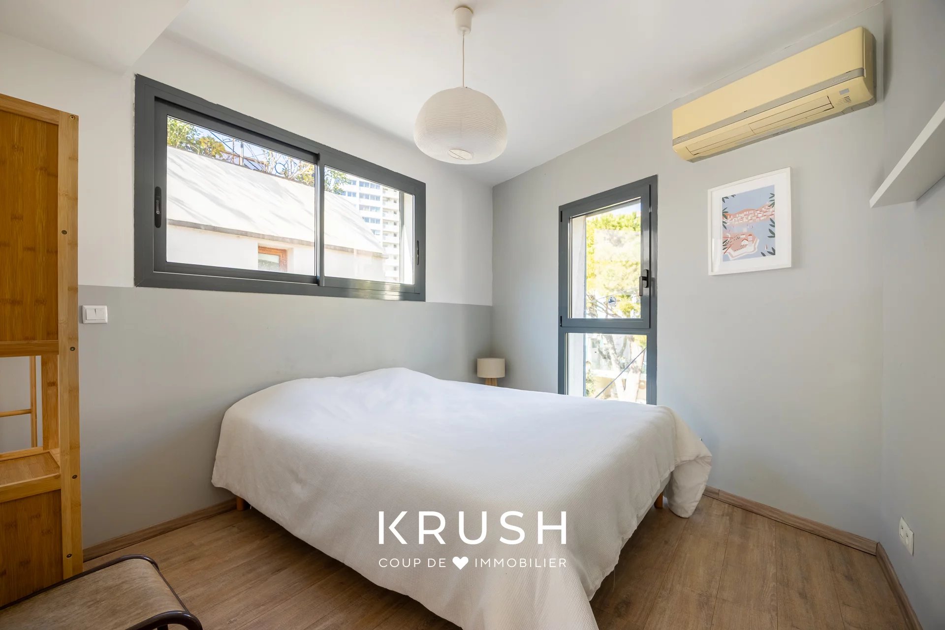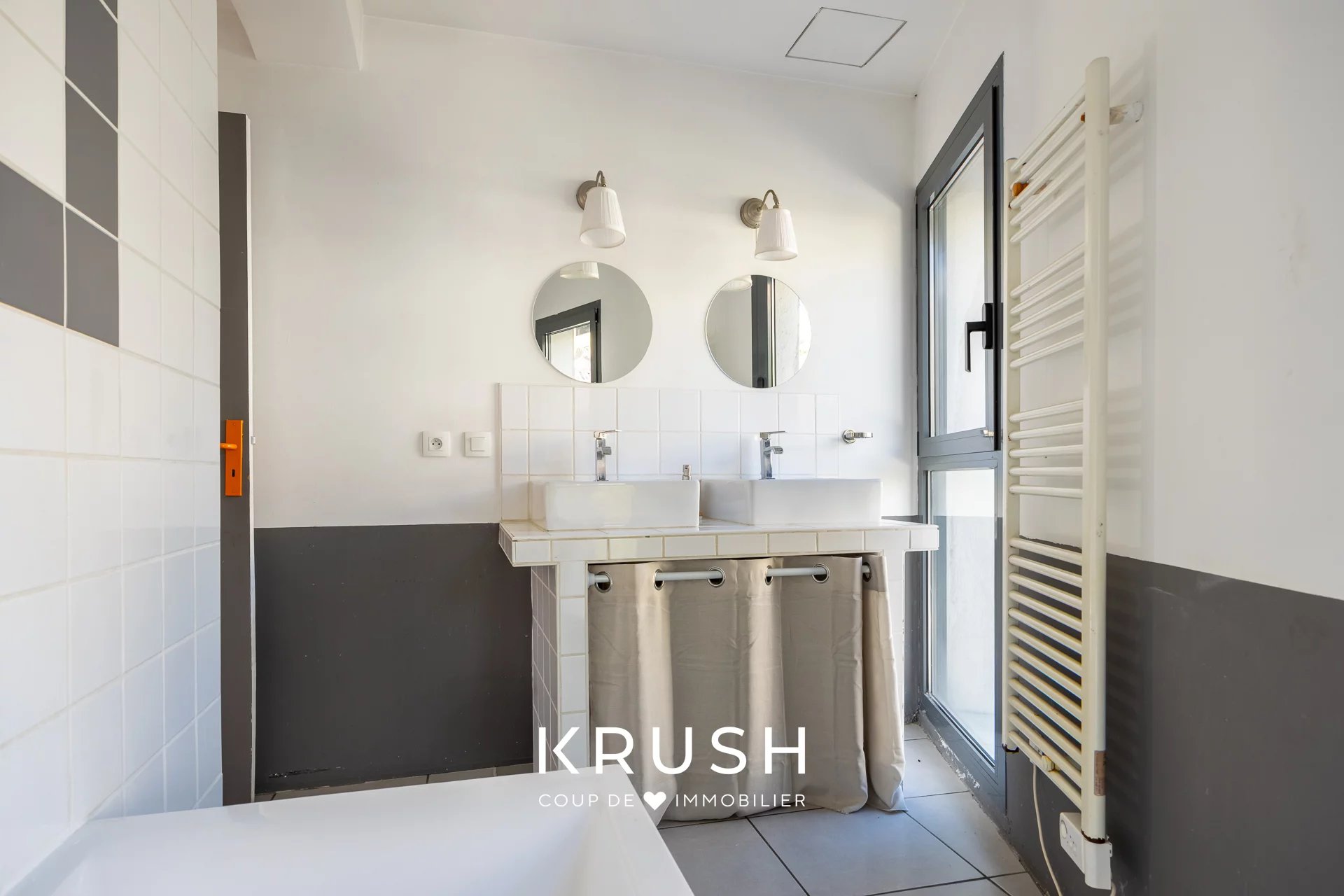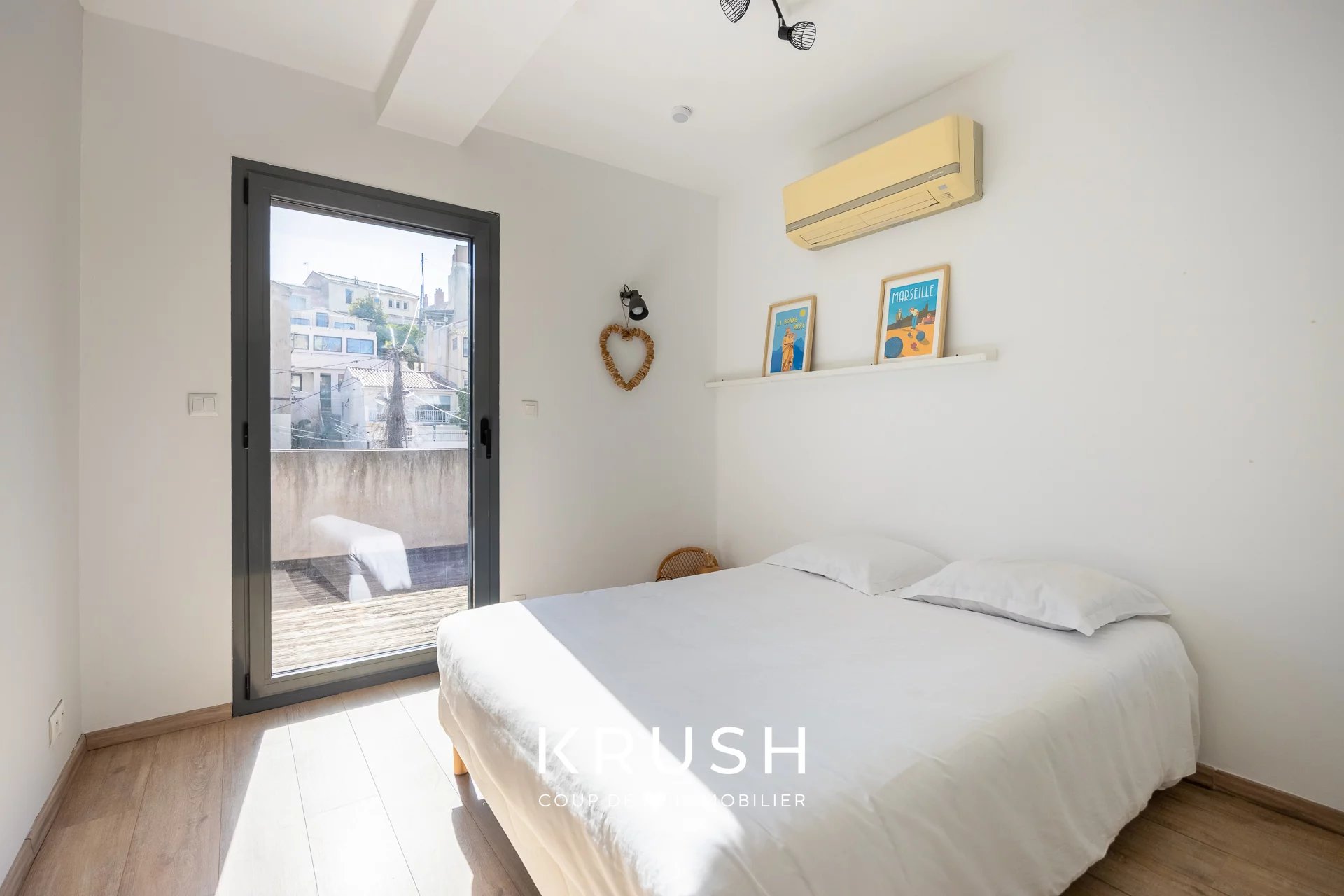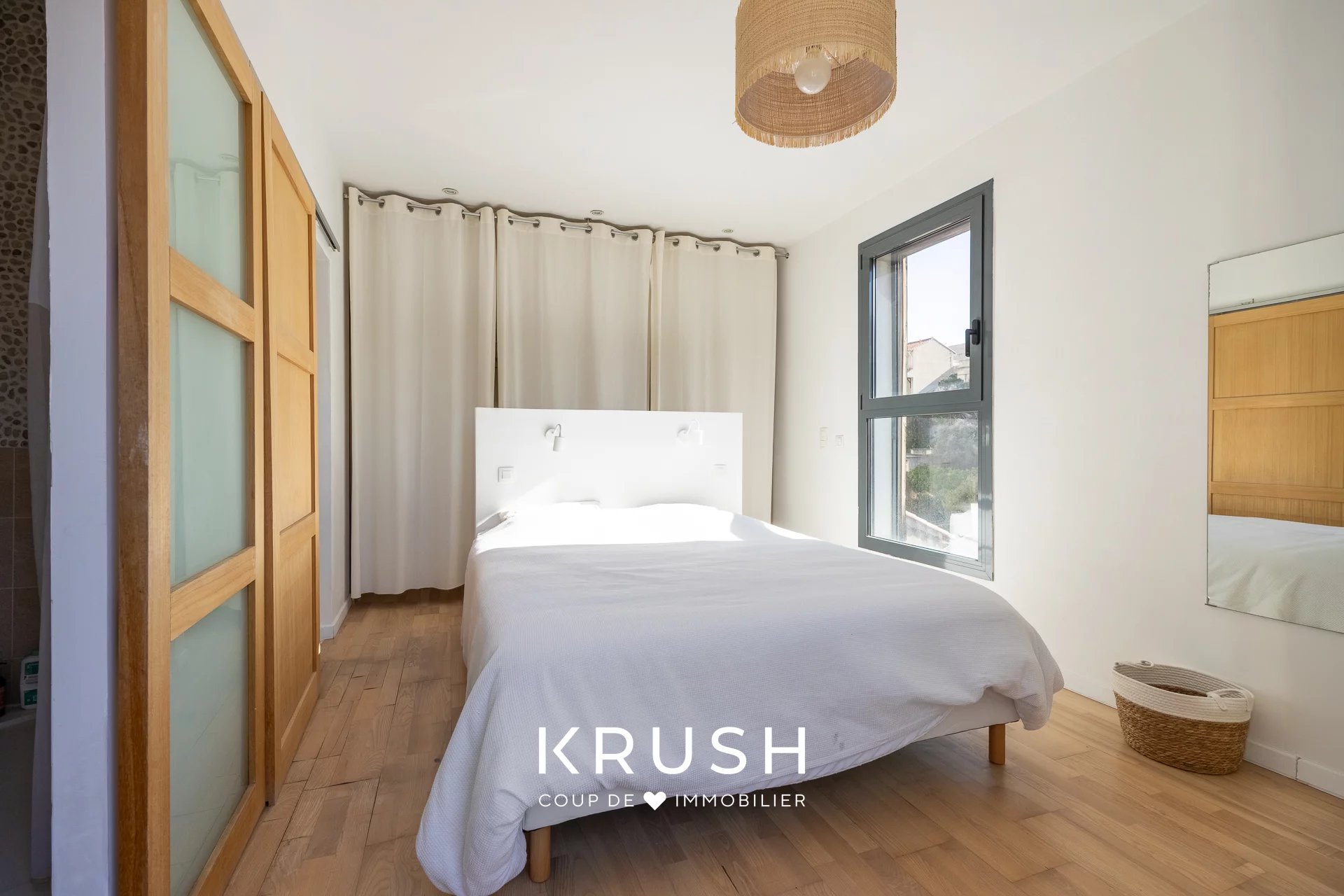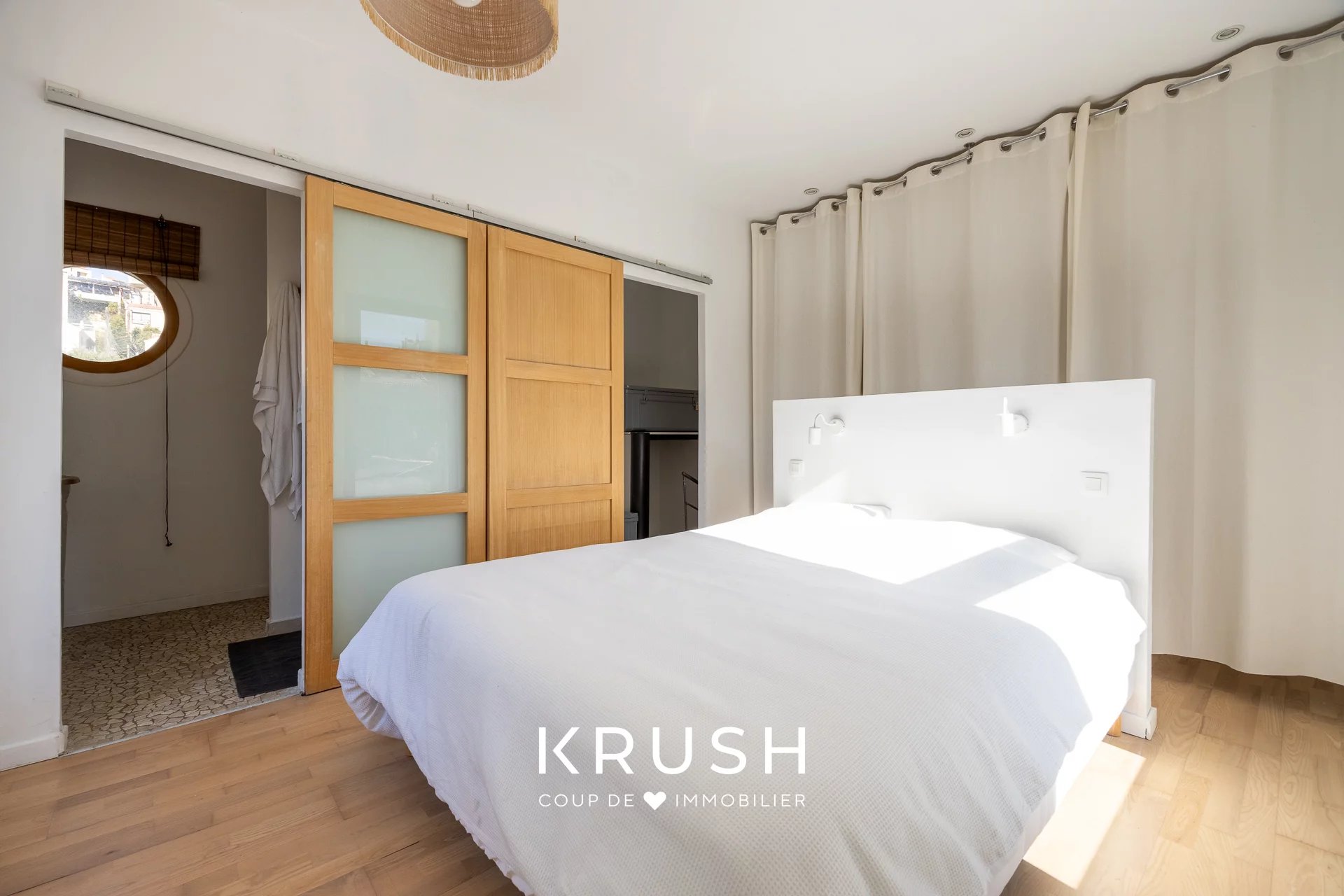 Au dernier étage, la suite parentale occupe l’espace comme un refuge suspendu. Elle s’ouvre sur un toit-terrasse offrant une vue panoramique à couper le souffle. La mer, le ciel, les toits marseillais. Un spectacle permanent, intime et spectaculaire à la fois.