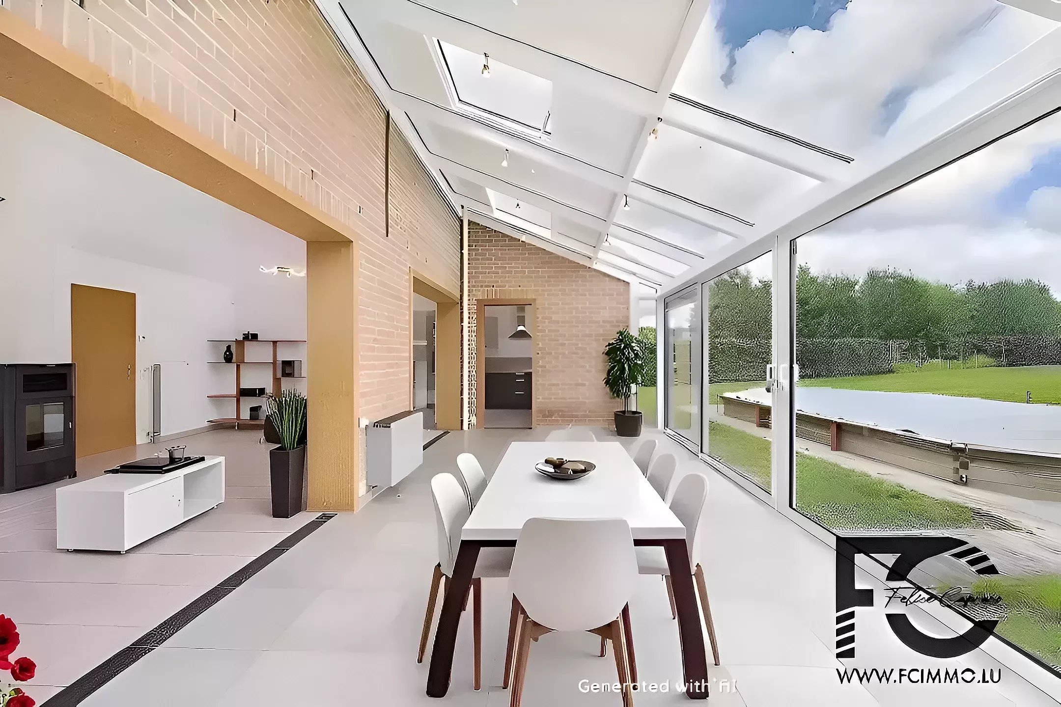 Véranda vitrée avec spots, offrant un accès direct au jardin et à la piscine