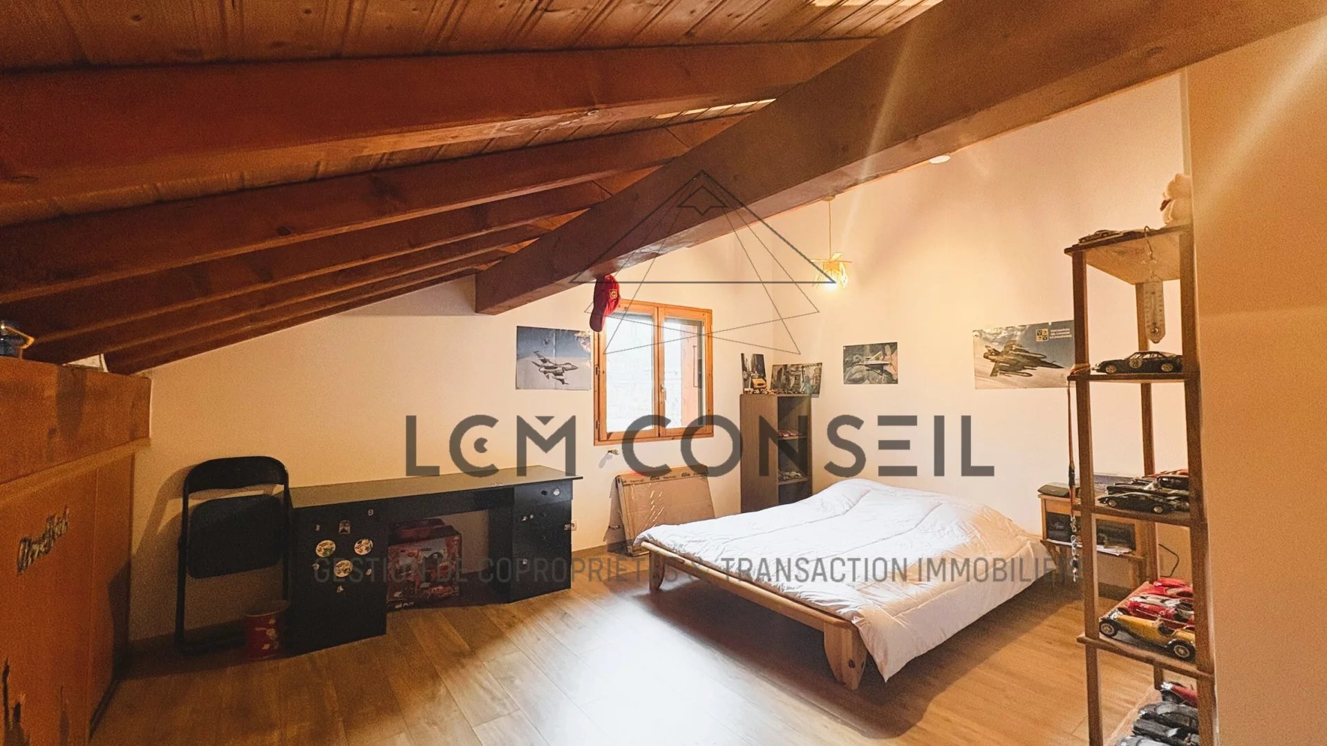 À l’étage : 4 chambres mansardées, salle de bains et WC.
