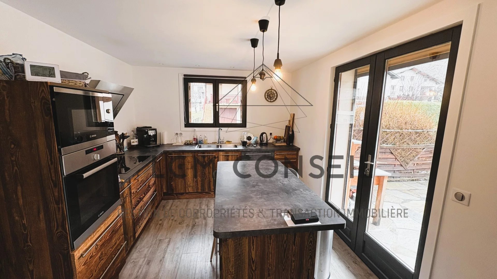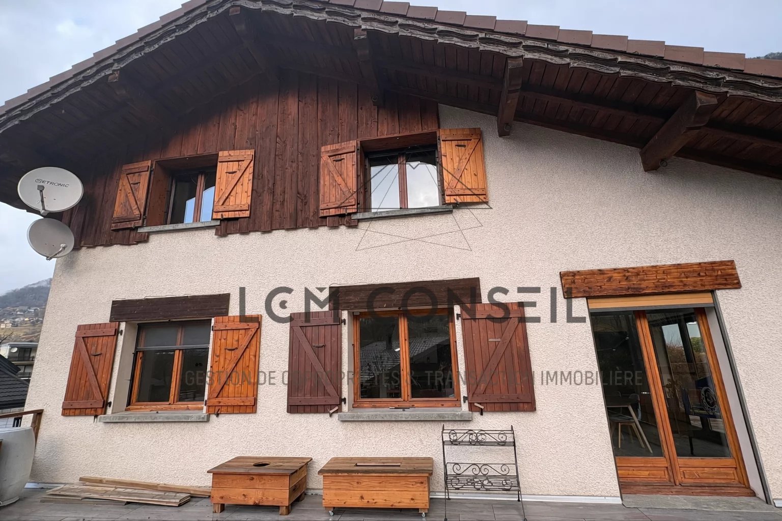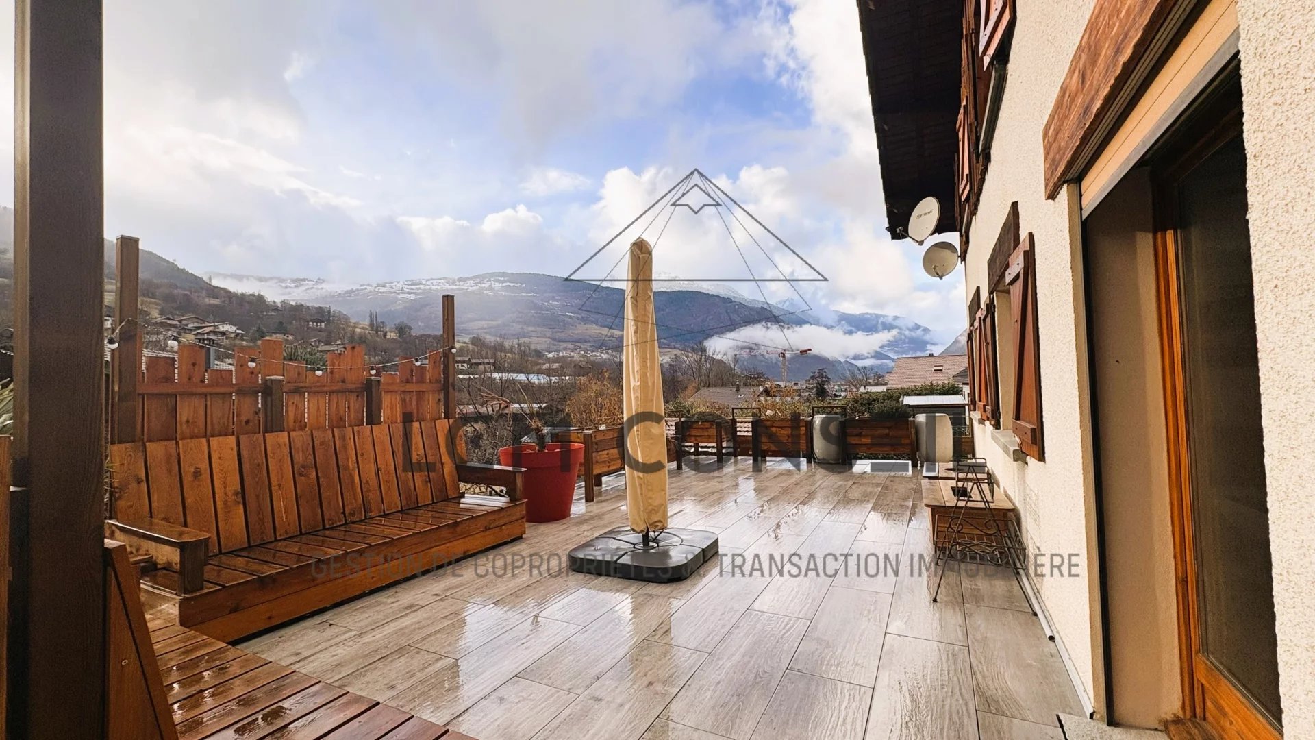 Extérieurs soignés : piscine 8x4 avec volet roulant, deux terrasses dont une avec vue Lauzière, cuisine d’été, carport et stationnement 5 véhicules.