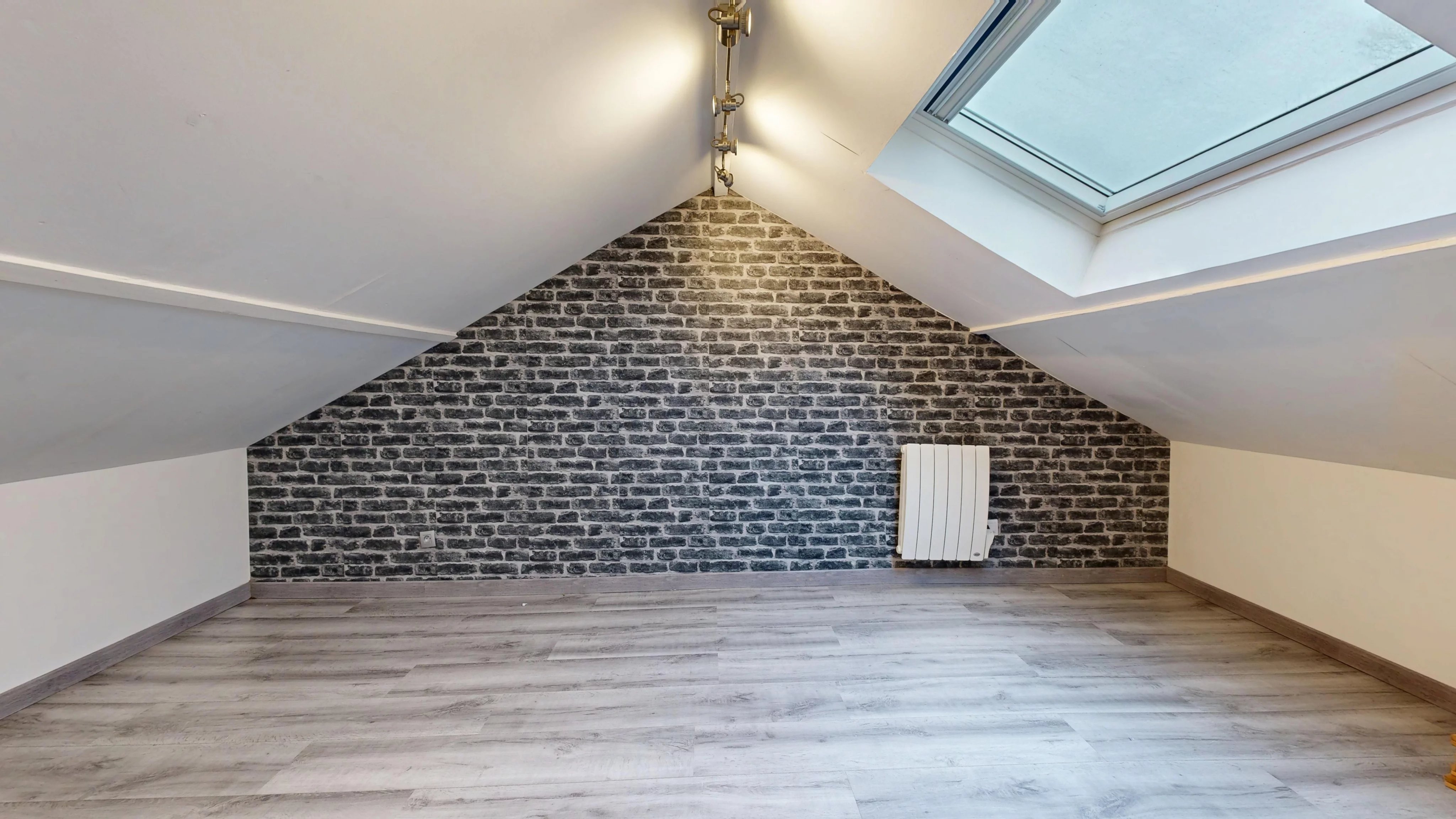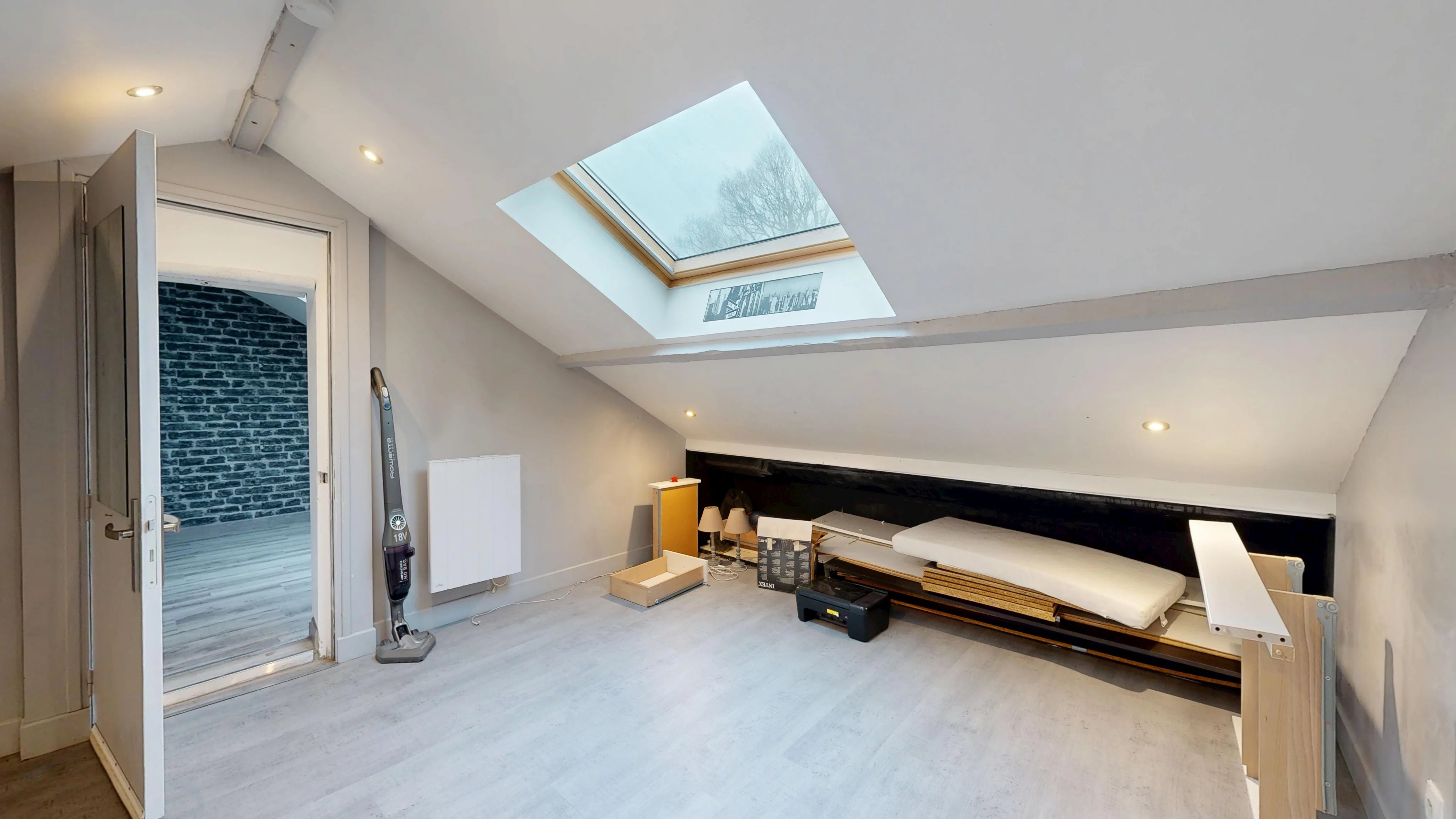 Au premier étage : un dégagement desservant trois chambres de belle taille, une salle d’eau avec WC ainsi qu’un bureau donnant accès aux combles aménagés en deux pièces mansardées, offrant la possibilité de créer une quatrième chambre.