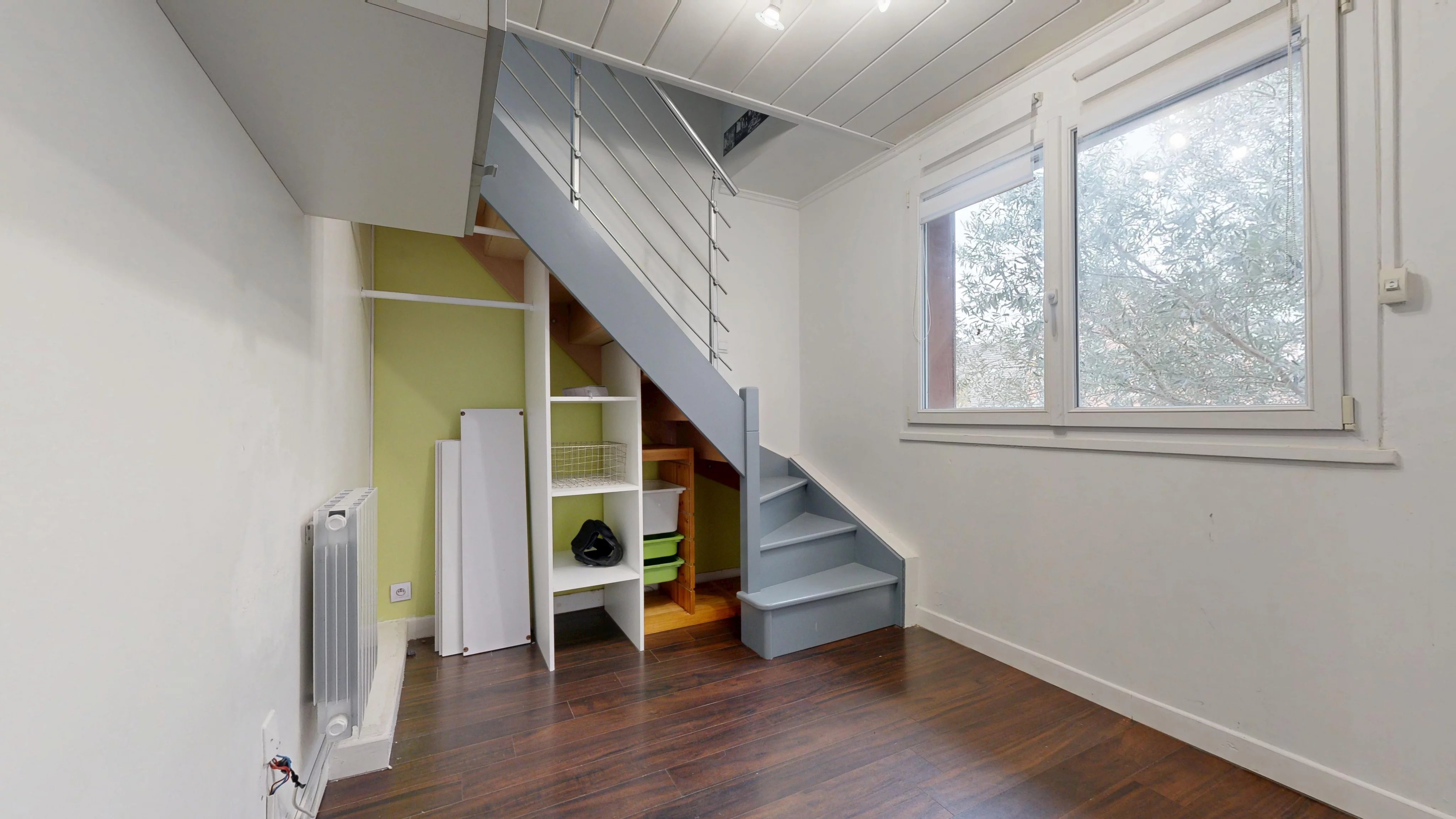 Au rez-de-chaussée : une entrée avec placards, un salon-salle à manger avec cuisine américaine donnant un accès direct au jardin. Un WC avec coin buanderie complète ce niveau.
