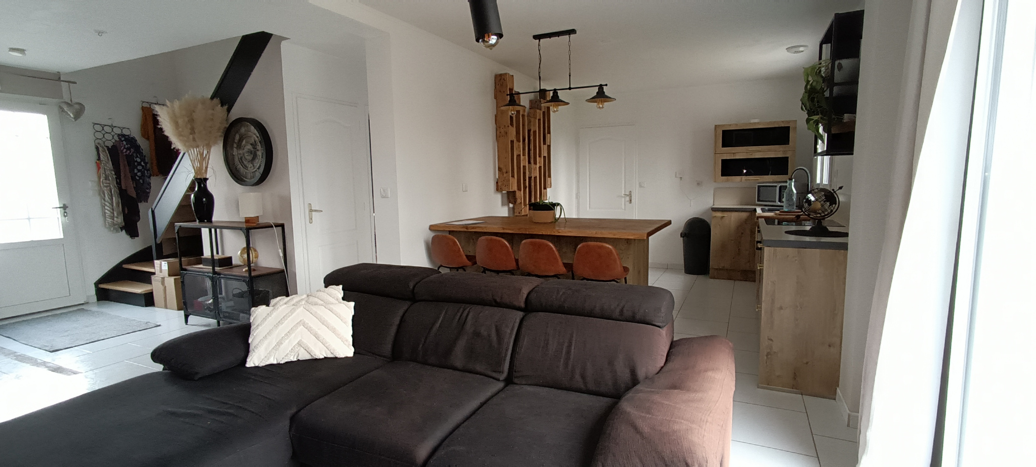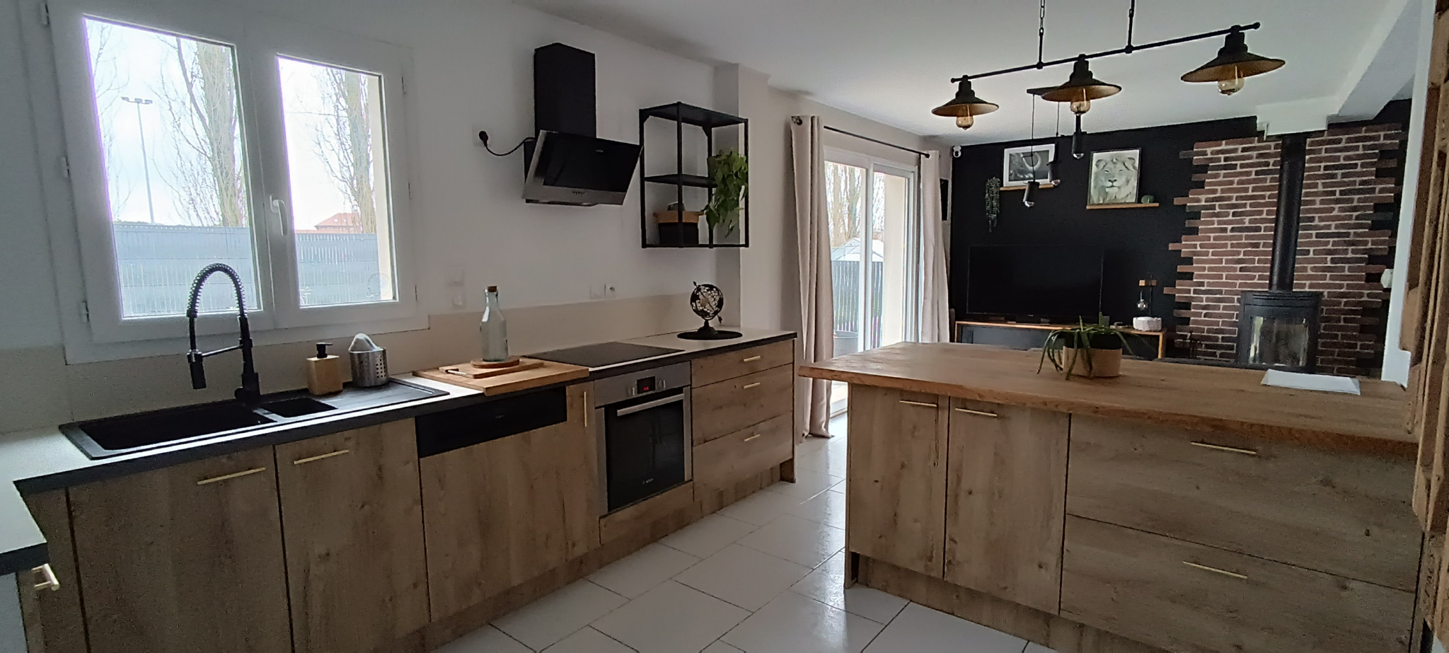 Le rez-de-chaussée dévoile un séjour chaleureux et lumineux, animé par un poêle qui crée instantanément une atmosphère cosy. La cuisine équipée, ouverte sur la pièce de vie, invite aux moments de partage. Une chambre de plain-pied, idéale pour recevoir ou télétravailler, ainsi que des WC, complètent ce niveau.