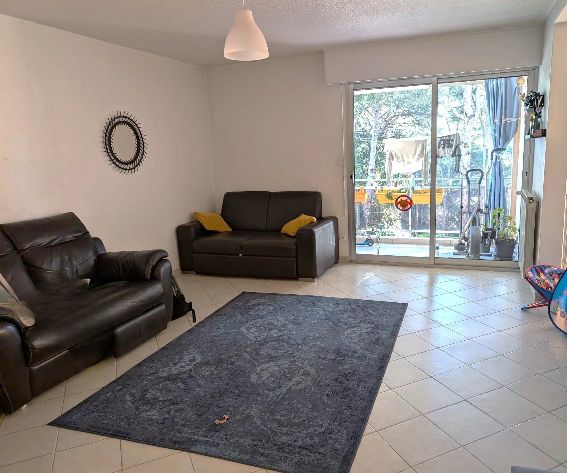 - Il se compose d’un salon et d’un séjour pouvant être transformé en chambre, d’une cuisine indépendante, de deux chambres, d’une salle de bains, de WC séparés et d’un large balcon donnant sur les jardins de la copropriété.