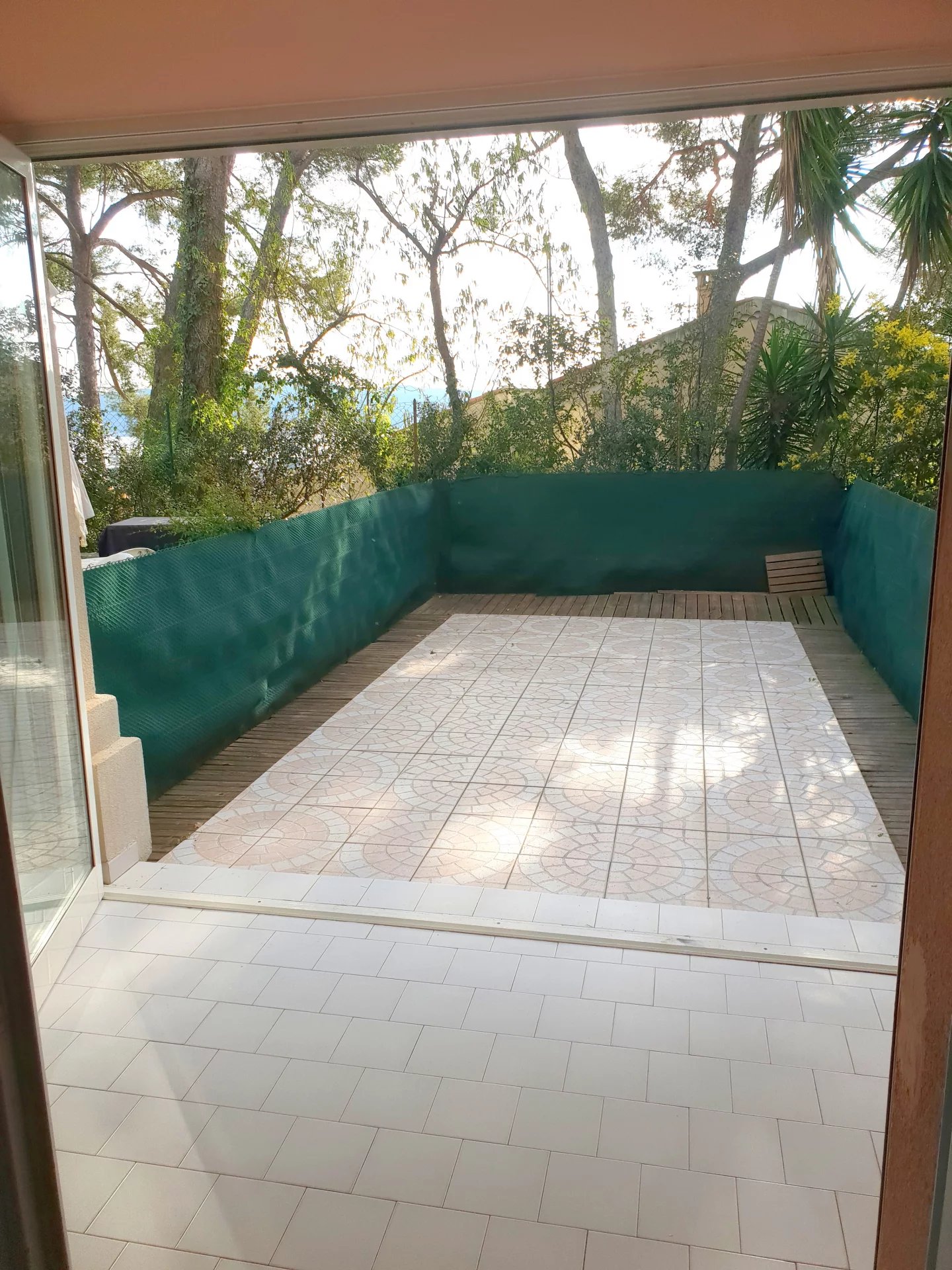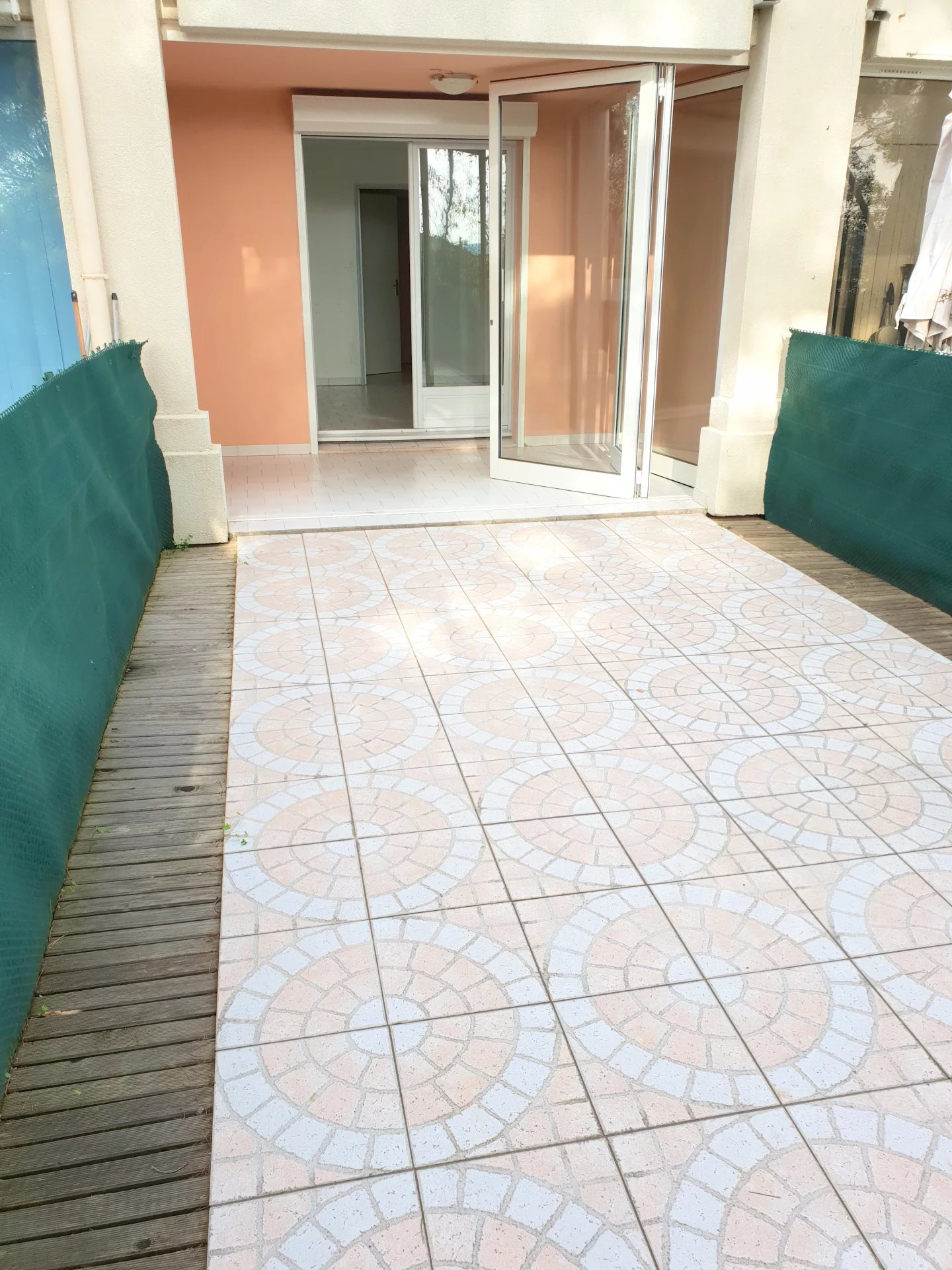 Quartier l'Evescat résidence Marines de Tamaris, beau studio en rez de jardin. Entrée, séjour avec coin cuisine, salle de bain avec wc, véranda, jardin, loué avec une place de parking privative. Disponible au 01/03/2026