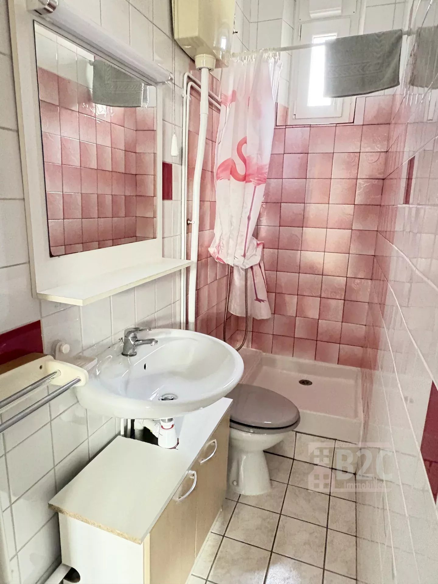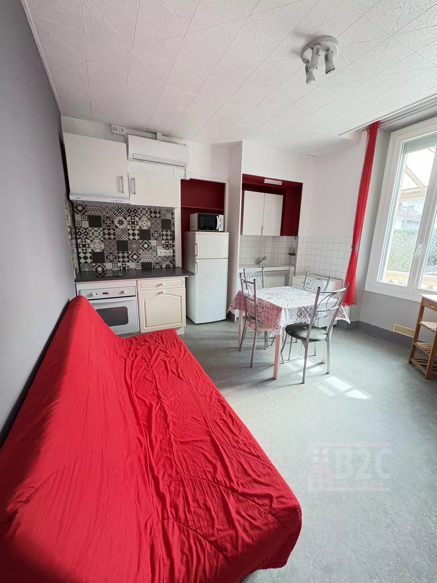 Il comprend une entrée, une pièce de vie (avec canapé convertible, table et chaises), une cuisine aménagée (plaque de cuisson, four, hotte, frigo, meuble sous évier), une chambre (avec placard) et une salle d'eau avec douche, lavabo, wc.