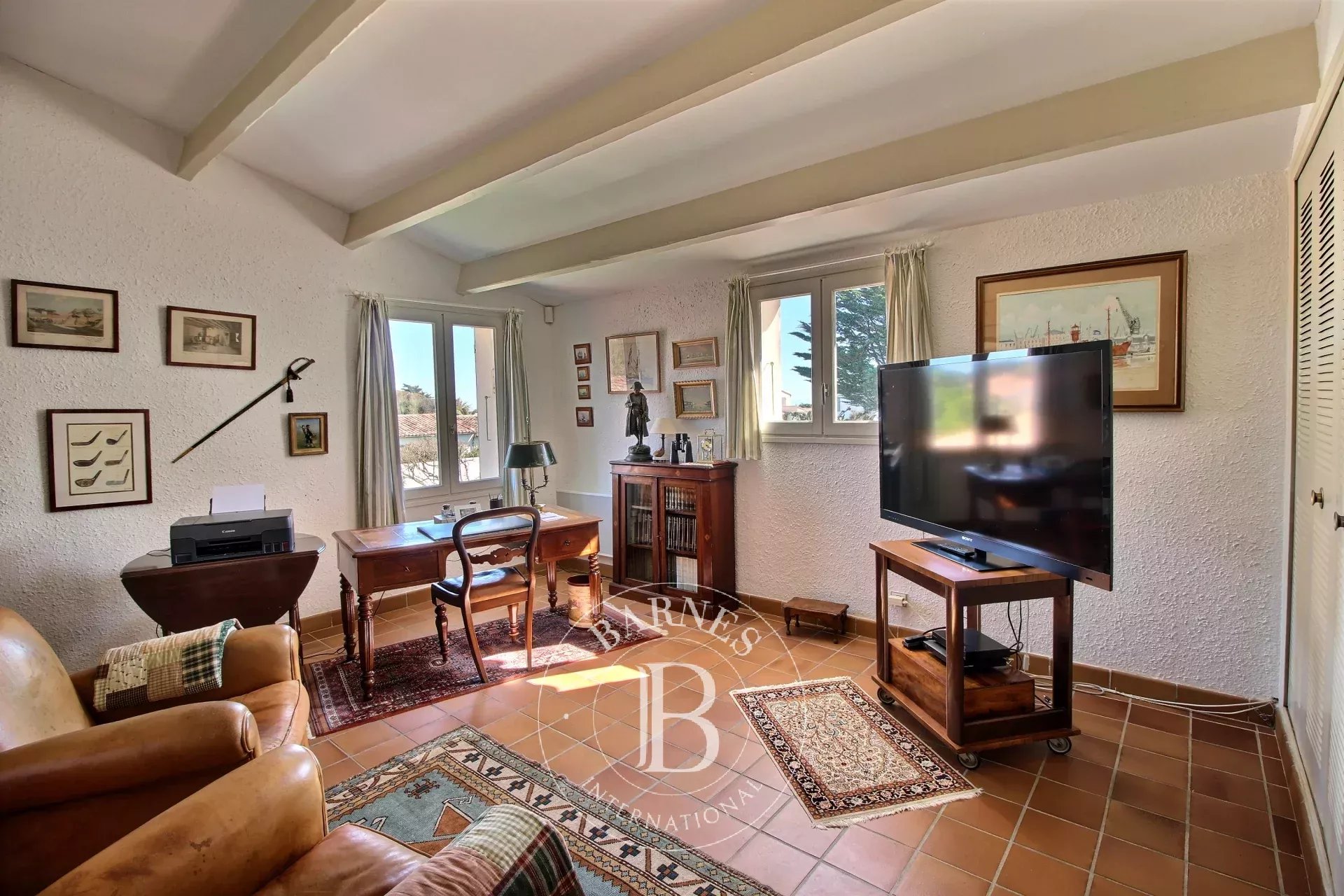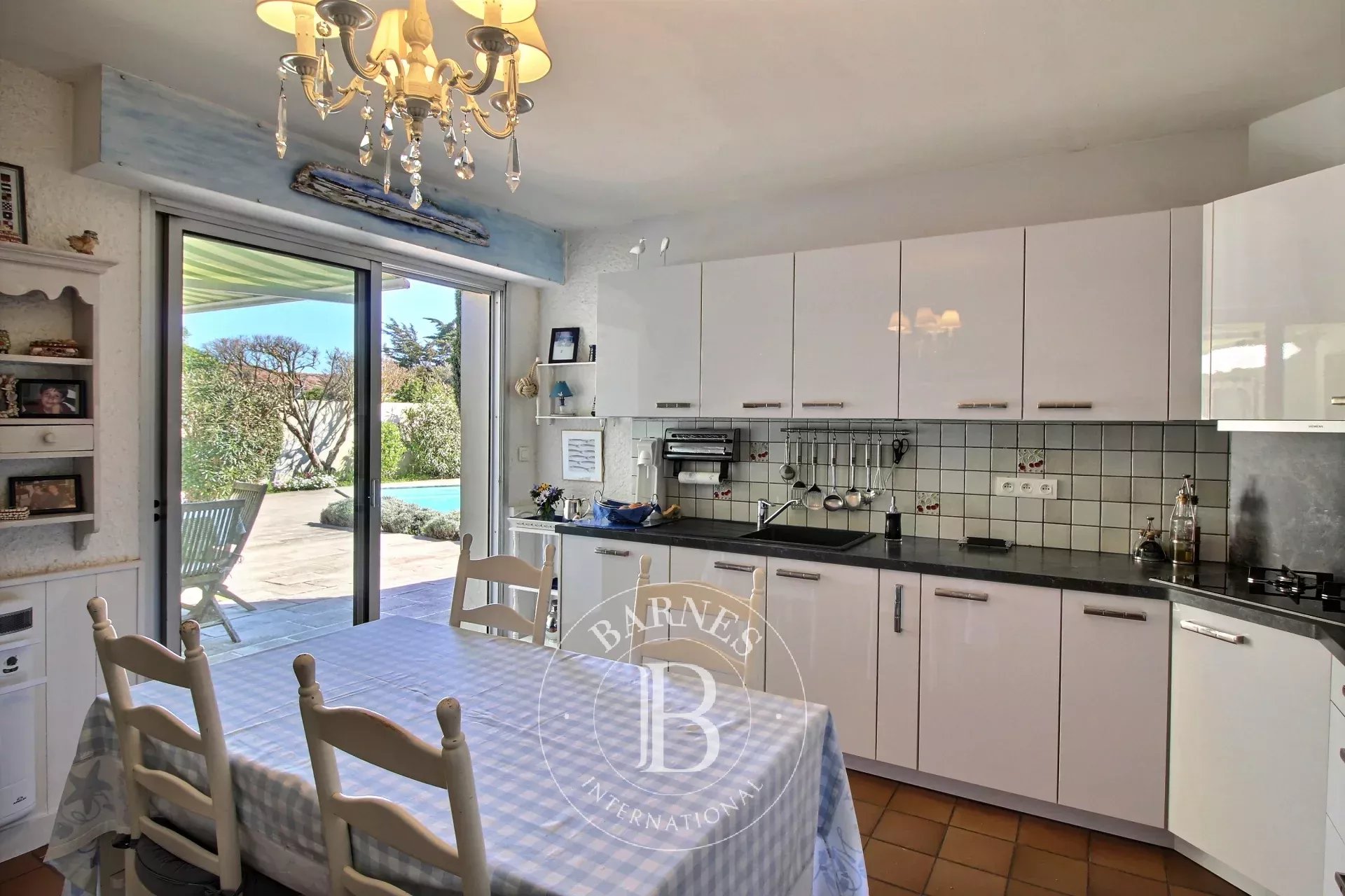 Idéalement située à deux pas de la mer, maison d'environ 165 m2 habitables sur une parcelle de plus de 1200 m2 offrant une entrée avec placards, un séjour avec une cheminée, une cuisine aménagée et équipée avec cellier et cave à vin. Trois chambres et deux salles d'eau/bains complètent l'ensemble dont deux au rez-de-chaussée. Un grand bureau pouvant accueillir une quatrième chambre avec un aperçu mer. Jardin avec terrasse, pergola et piscine, garage et stationnements sur la parcelle.