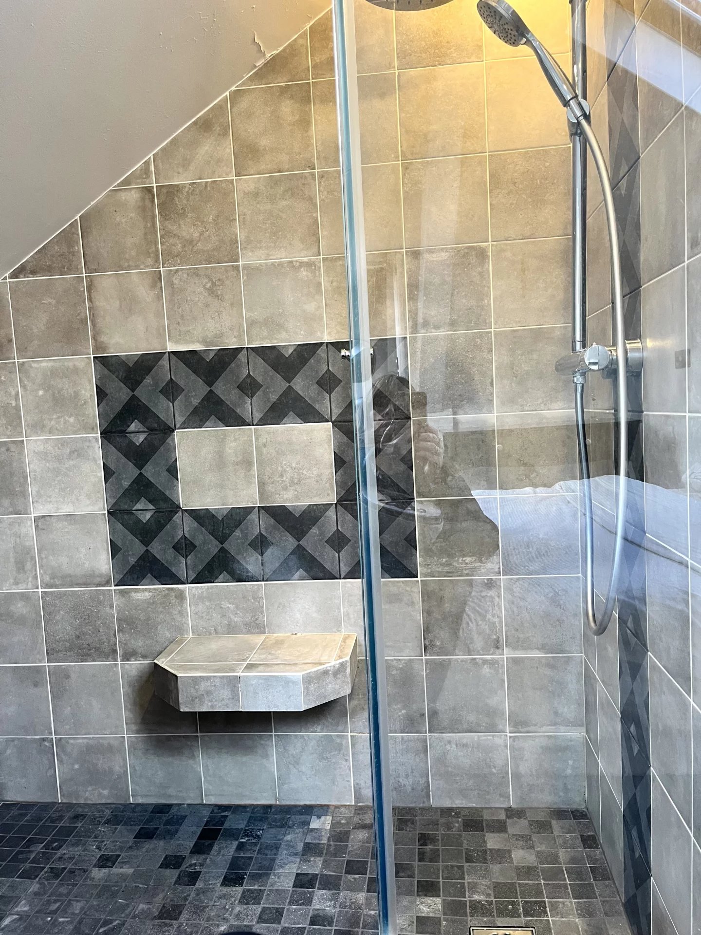 -à l'étage, la chambre aménagée de très nombreux rangements, la douche à l'italienne et les toilettes séparées avec fenêtre.