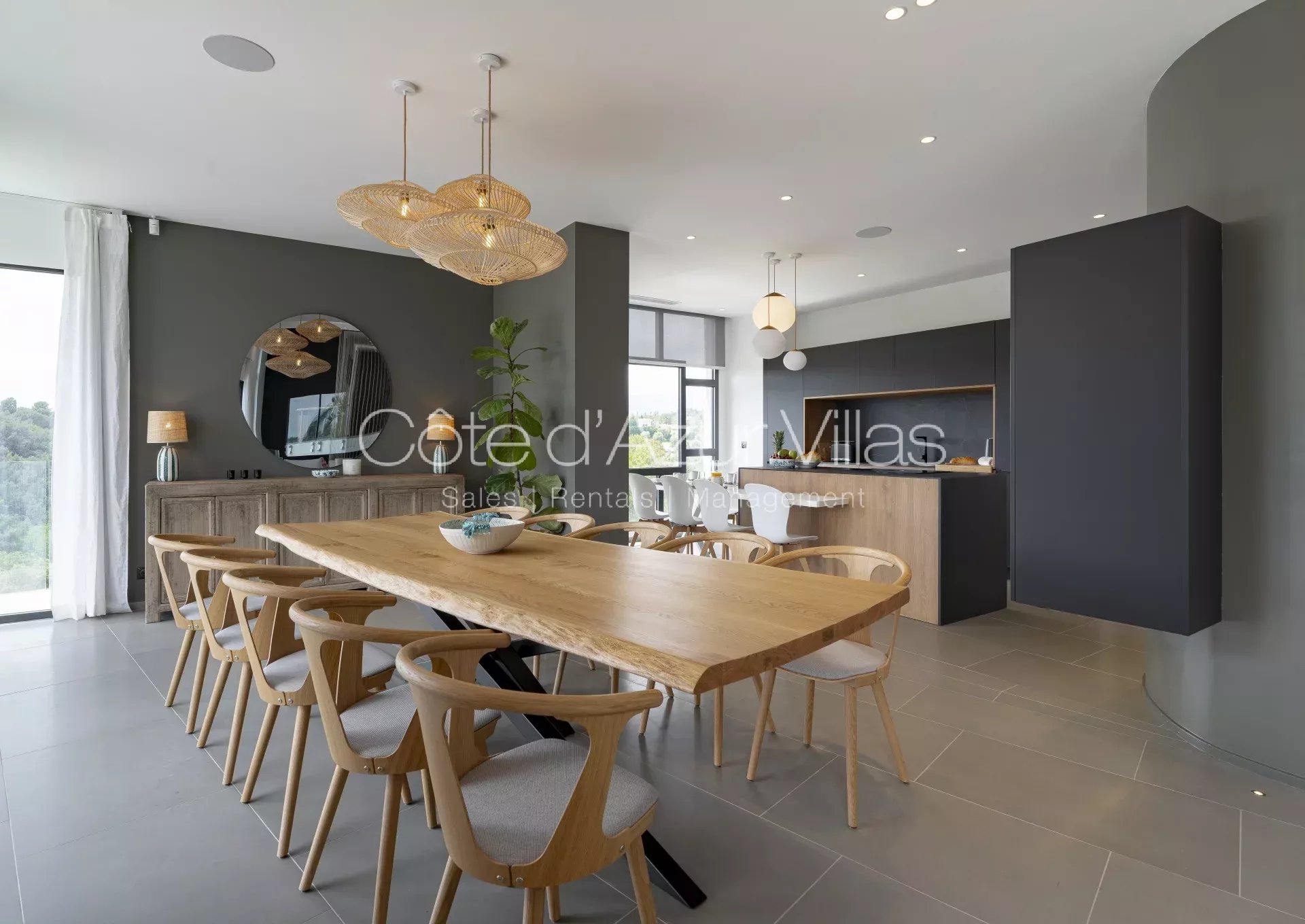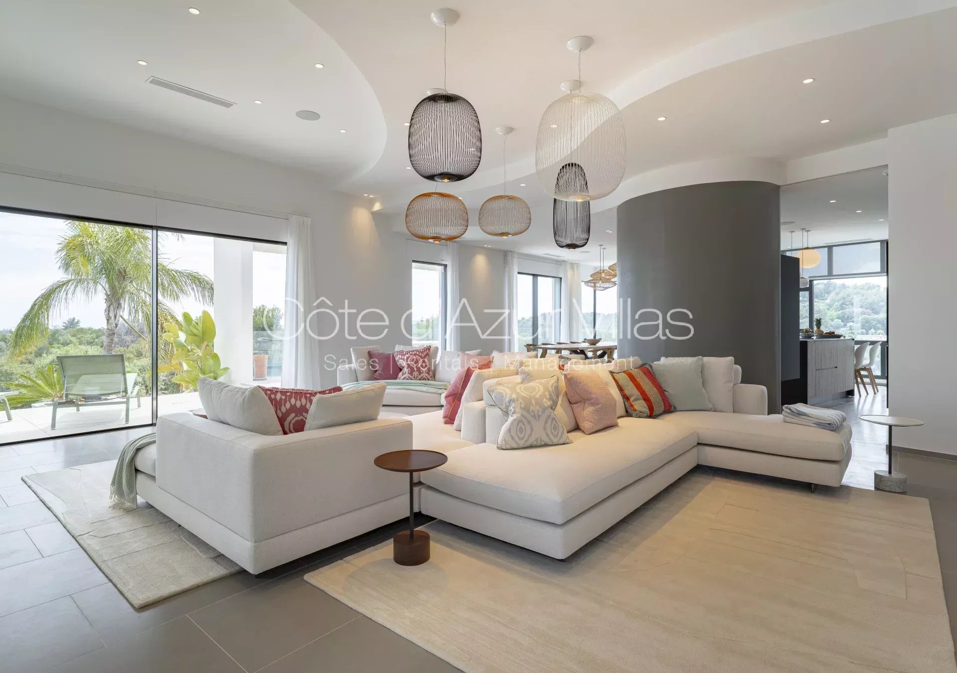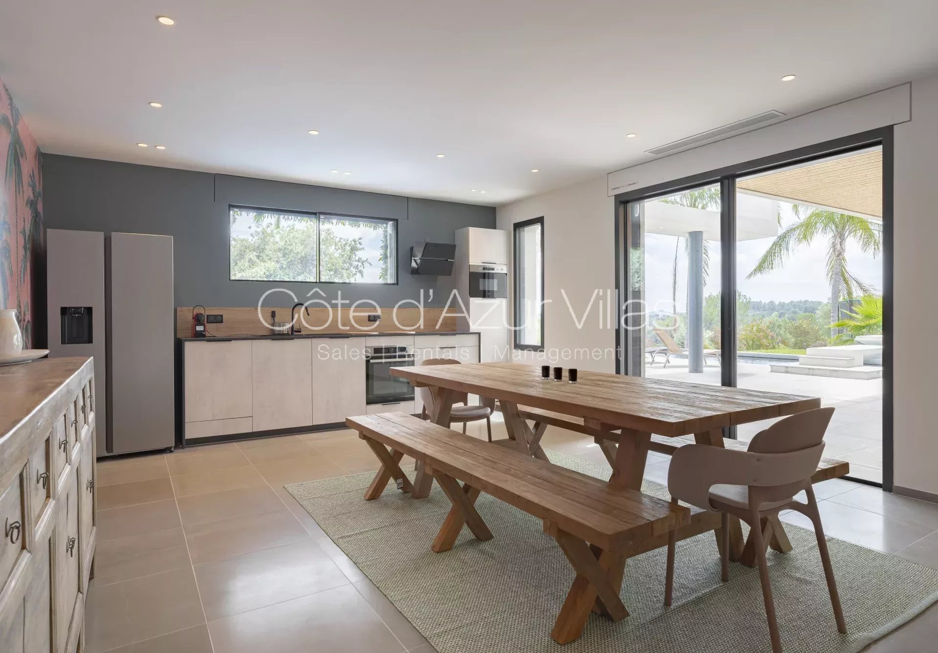 De grandes baies vitrées s’ouvrent sur une terrasse spacieuse surplombant le jardin paysager et la piscine, offrant une parfaite continuité entre intérieur et extérieur.