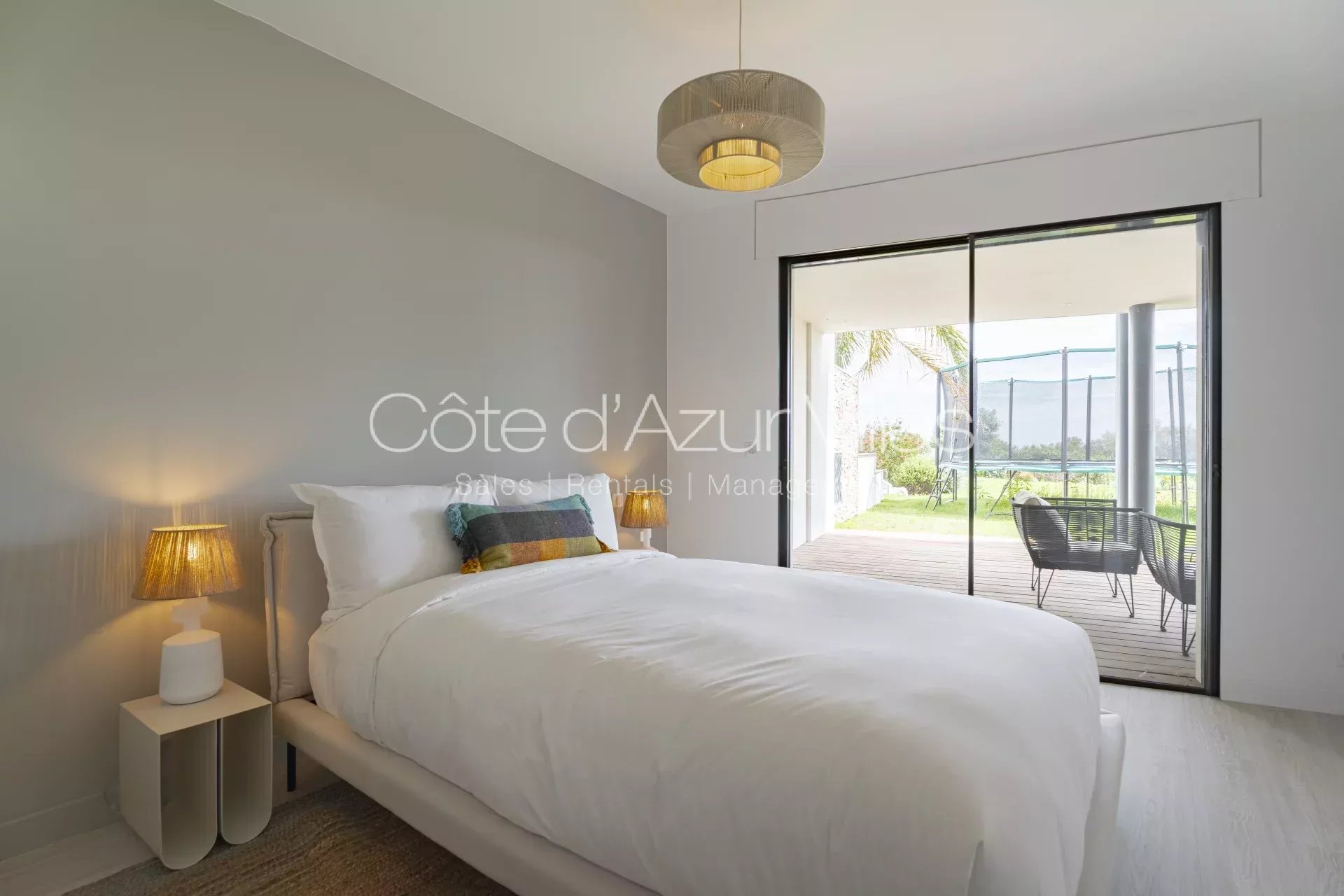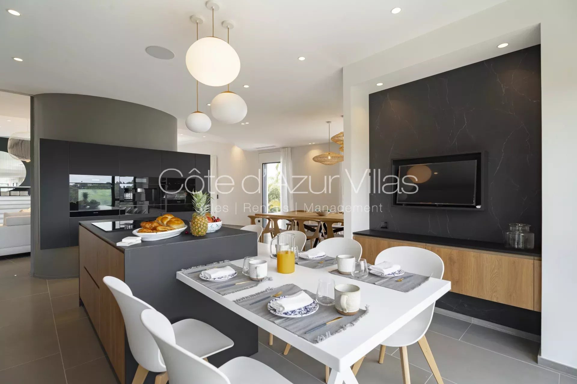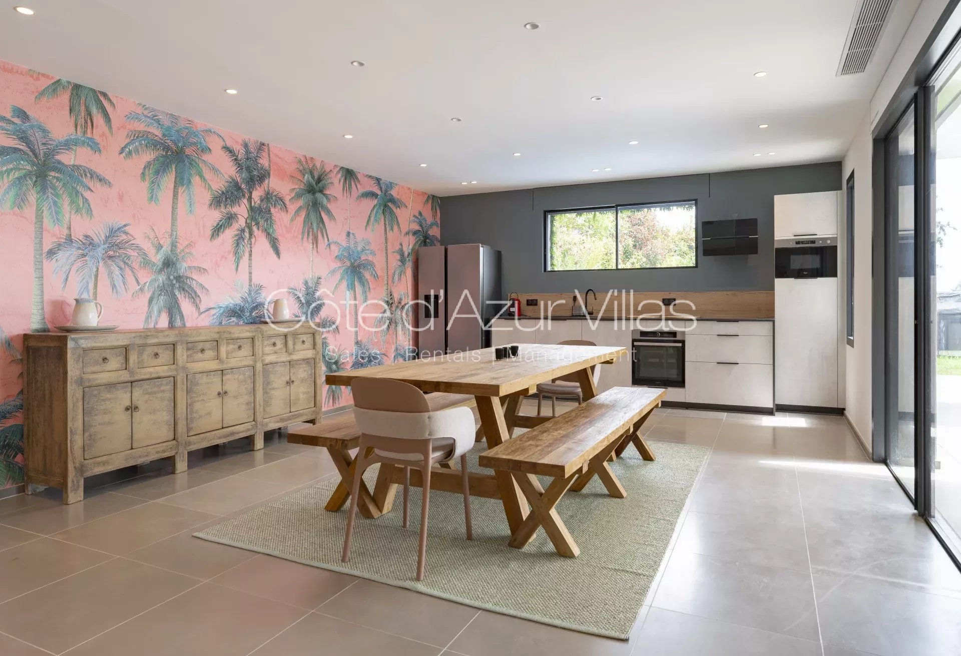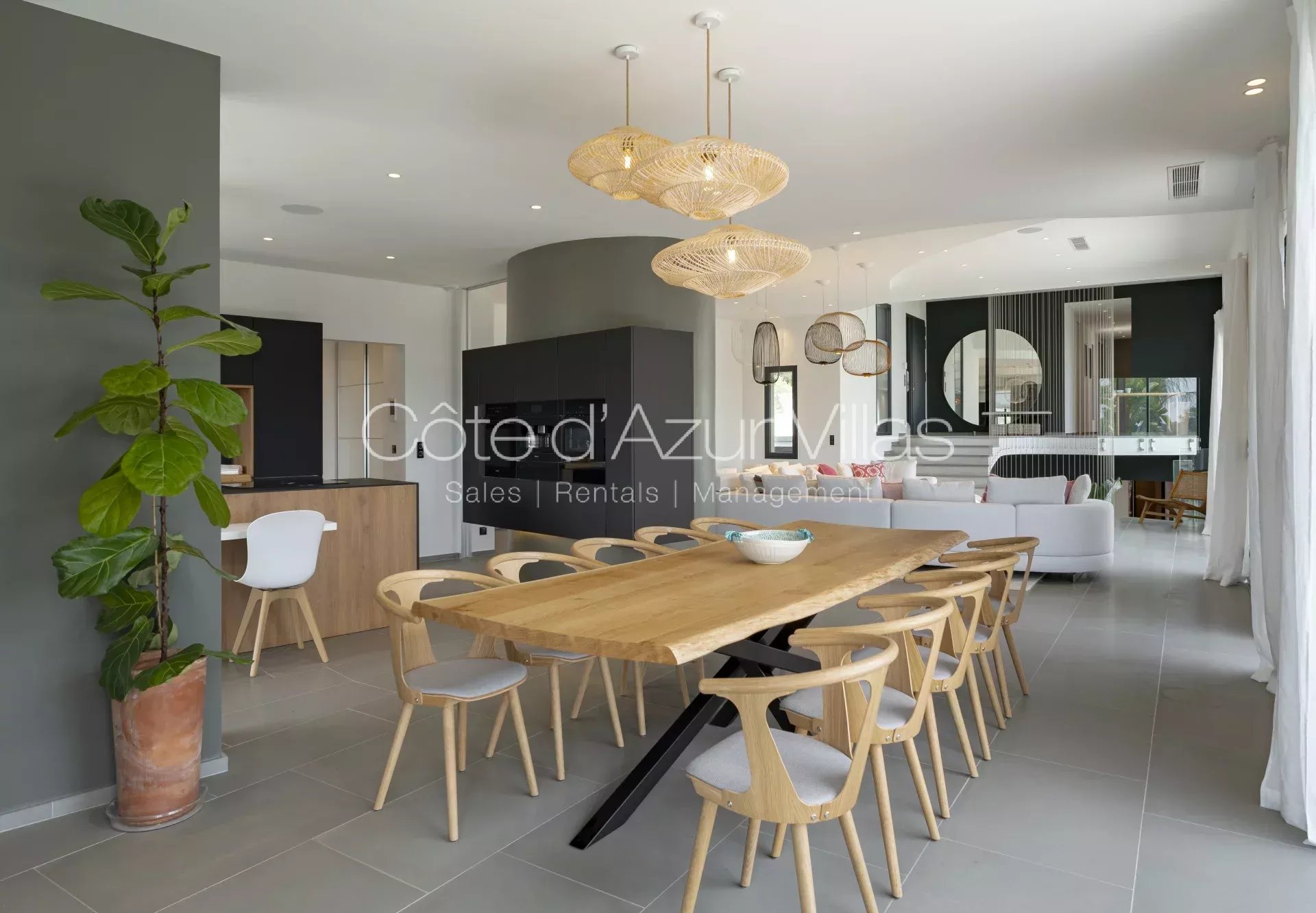 De grandes baies vitrées s’ouvrent sur une terrasse spacieuse surplombant le jardin paysager et la piscine, offrant une parfaite continuité entre intérieur et extérieur.