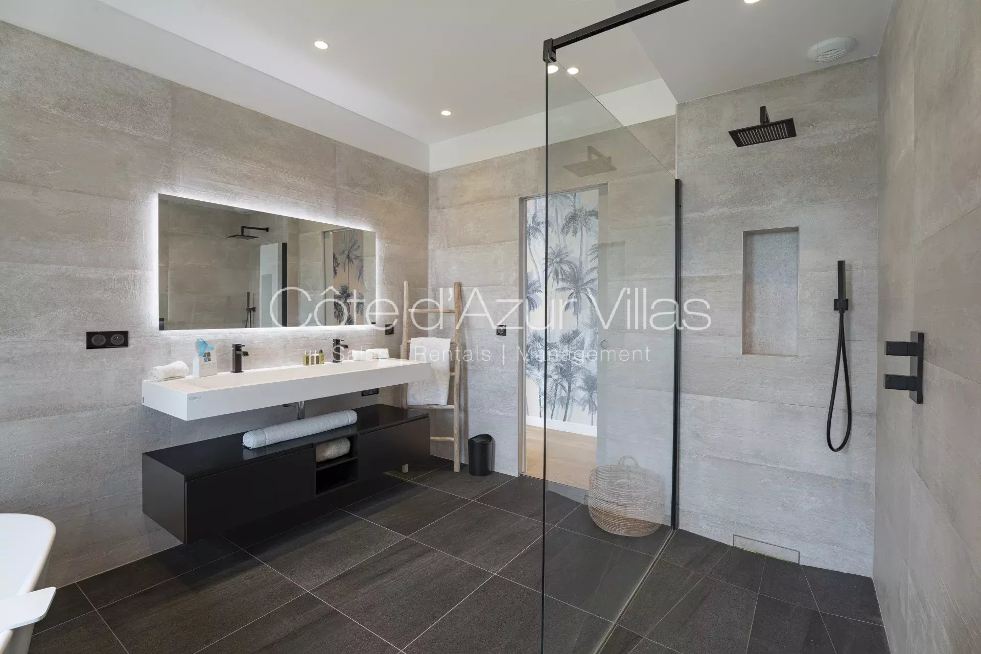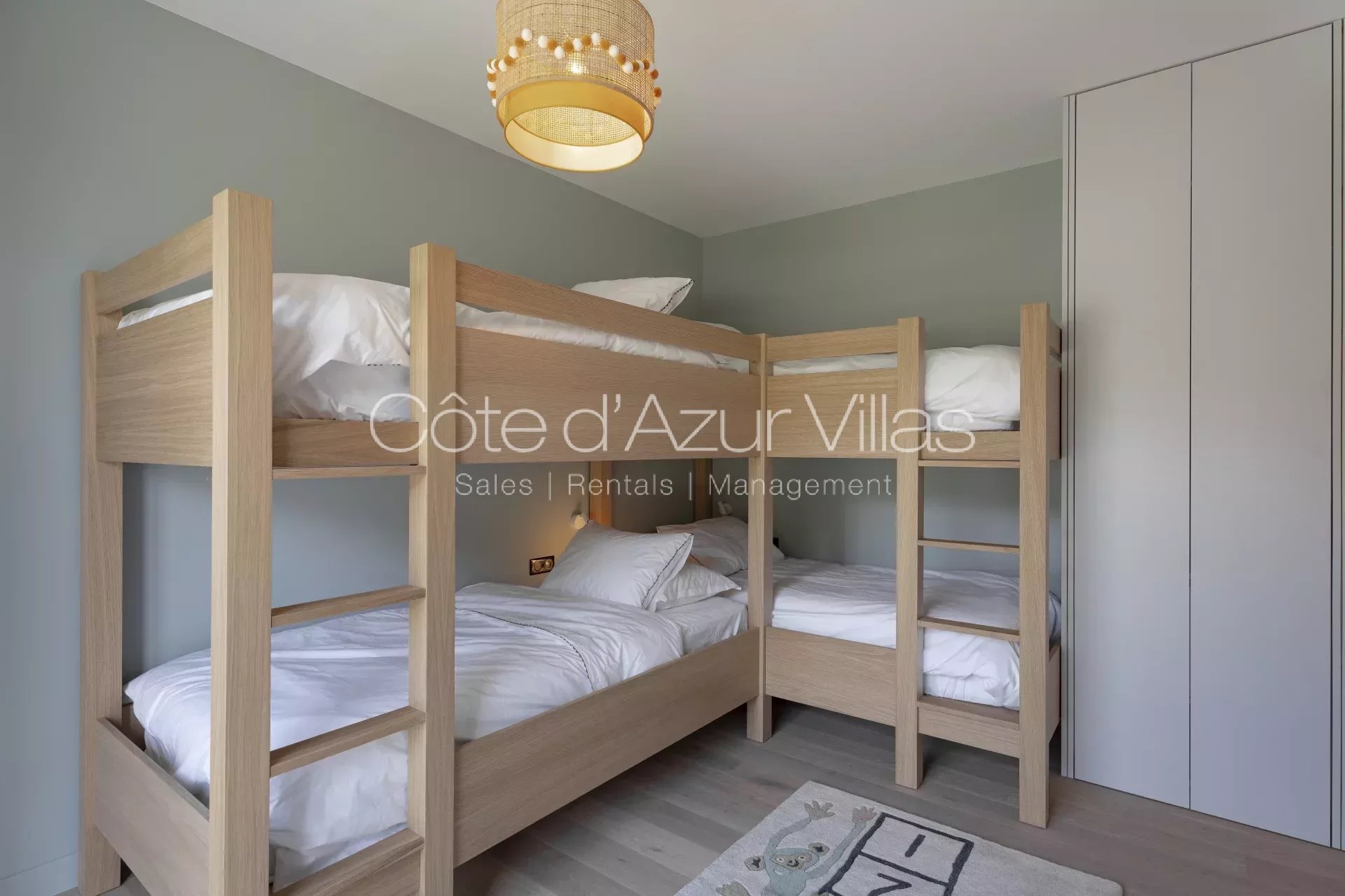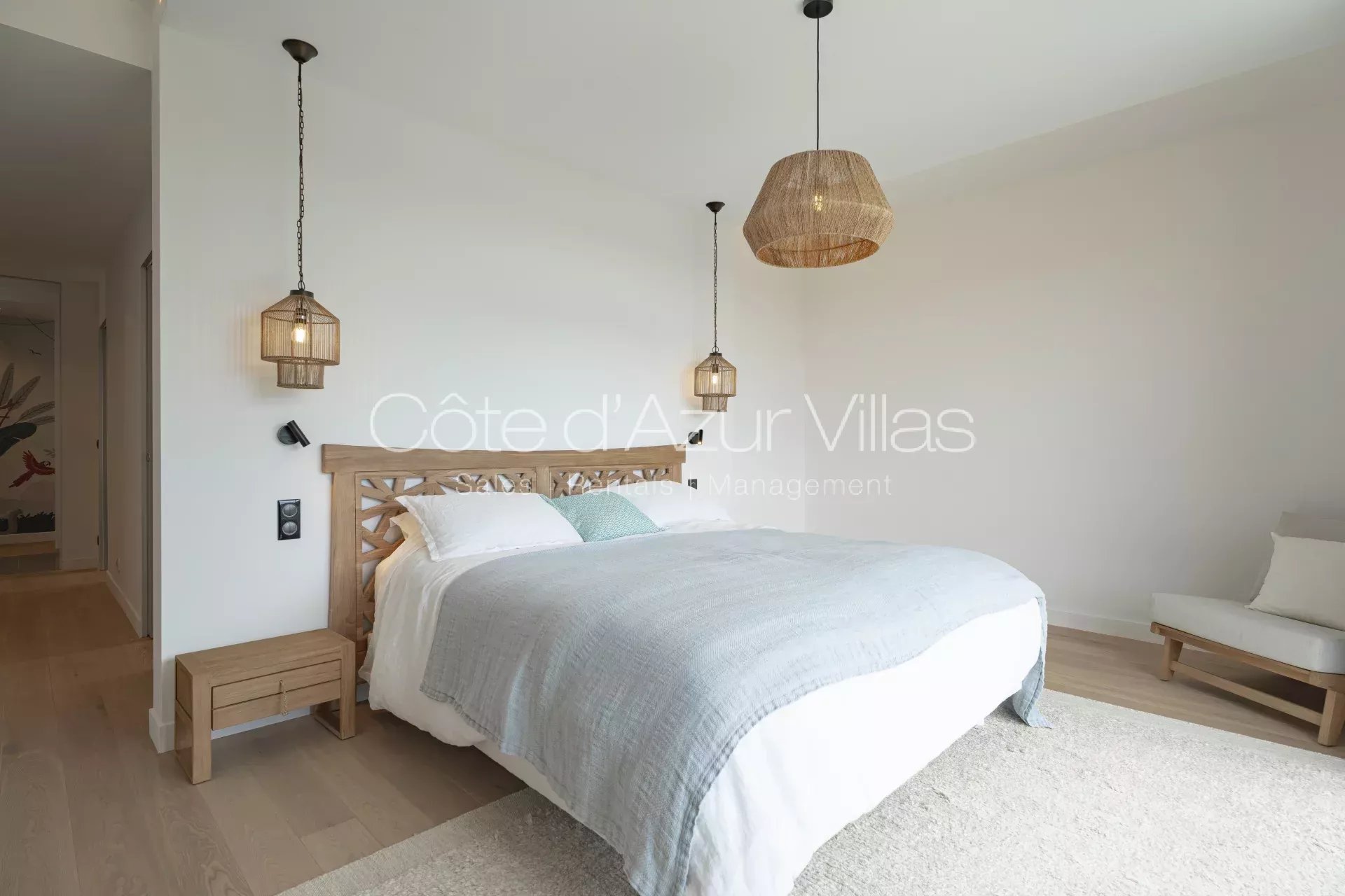 Au premier étage se trouvent 4 chambres, toutes avec leur salle de bain en-suite. La suite parentale bénéficie d’un grand dressing, d’une salle de bains attenante et d’un balcon privé offrant une vue spectaculaire sur le jardin et la mer.