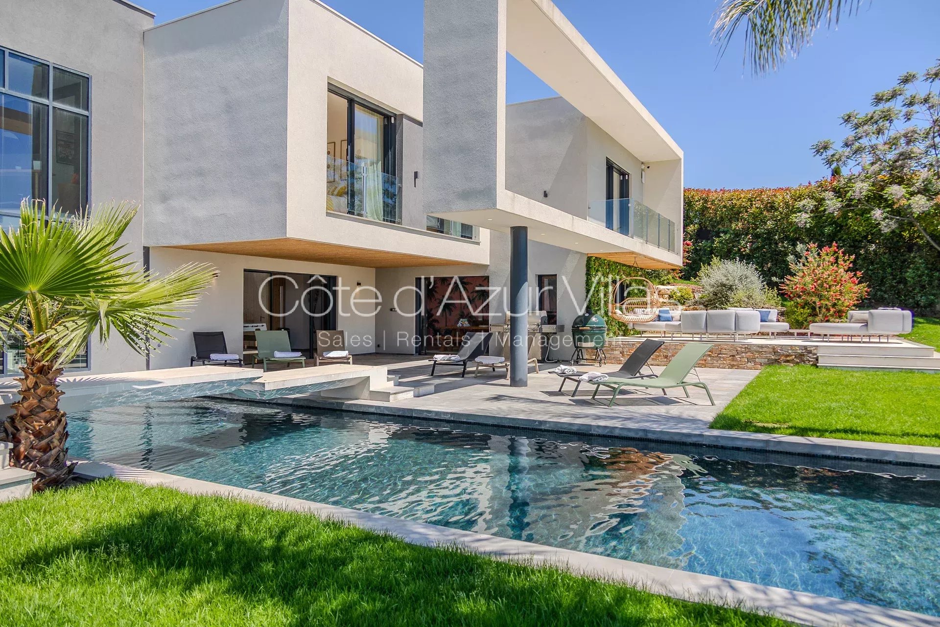 La cuisine d’été s’ouvre sur l’espace piscine avec un élégant salon extérieur et un espace barbecue. De nombreuses chaises longues entourent la piscine au sel à débordement, équipée d’une couverture de sécurité.