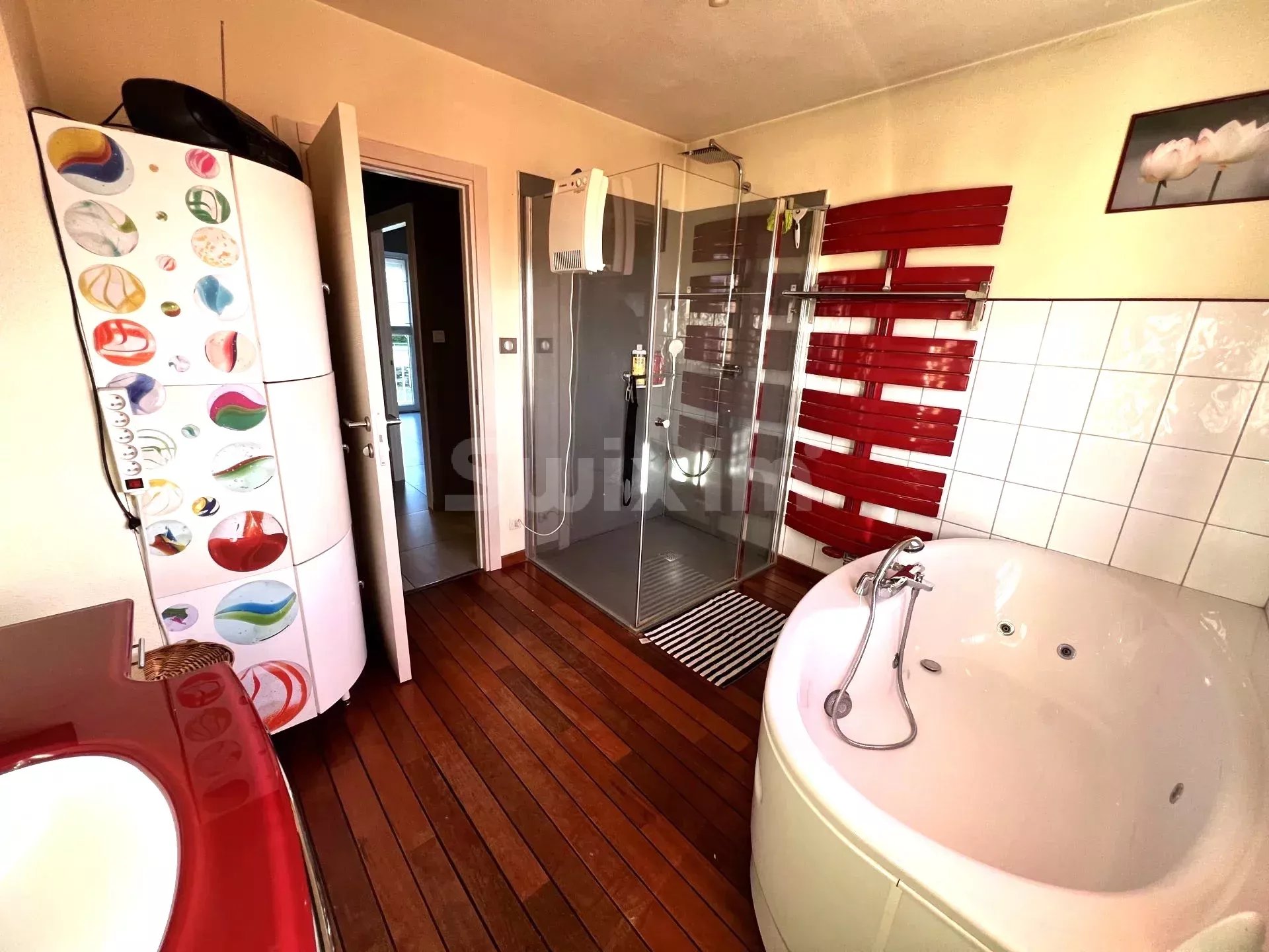 Côté nuit, la maison propose plusieurs chambres confortables ainsi qu’une salle de bains spacieuse avec baignoire et douche, complétée par une douche à l’italienne plus récente et des WC suspendus. De nombreux travaux ont été réalisés : isolation renforcée, électricité refaite, menuiseries PVC double vitrage, volets roulants, VMC, et équipements énergétiques performants incluant pompe à chaleur, chaudière bois et chauffe-eau thermodynamique. Toutes les portes intérieures ont également été remplacées, apportant une touche moderne et soignée à l’ensemble.