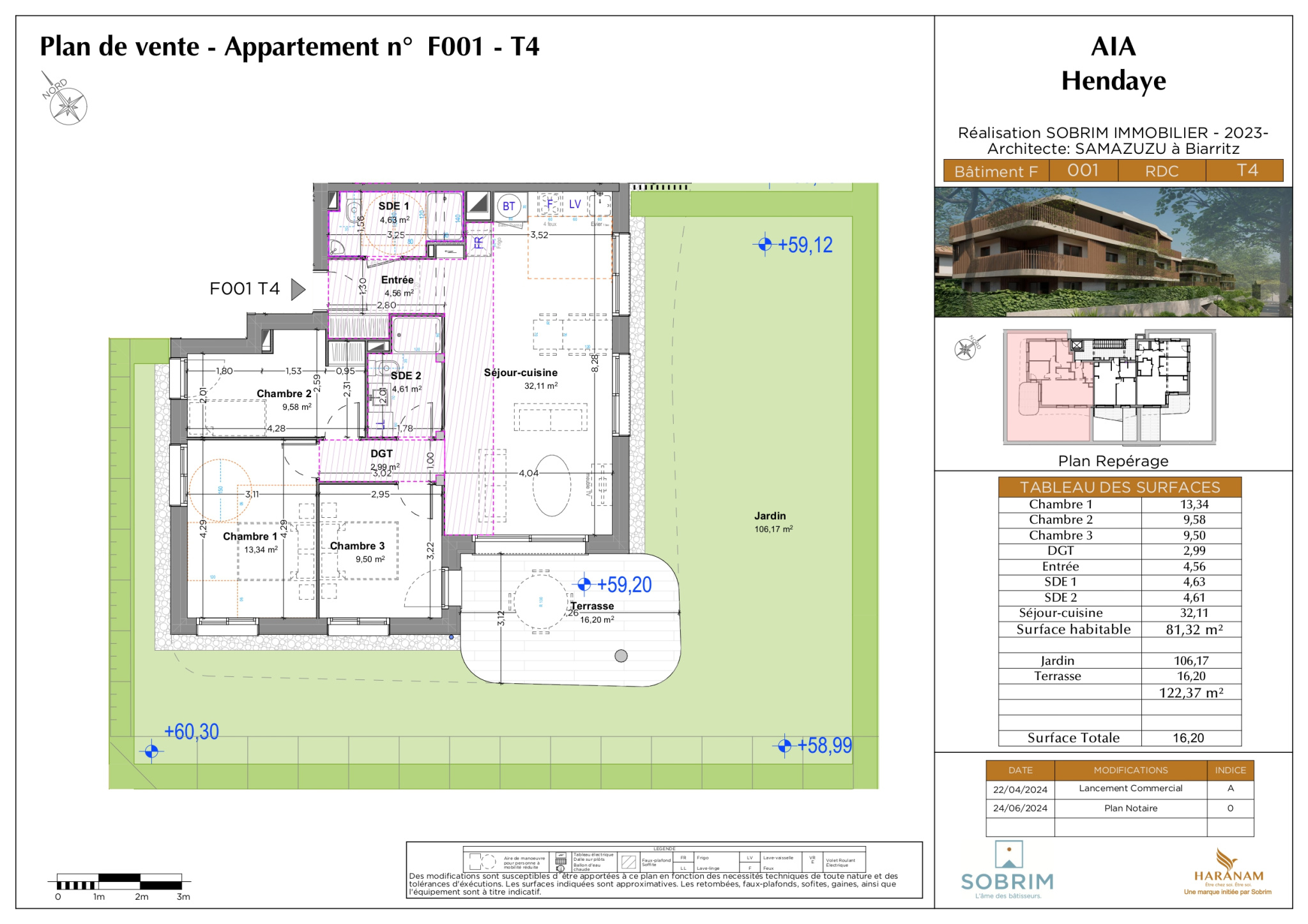 Dans la résidence AIA à Hendaye, découvrez cet appartement T4 de 81,13 m2, situé en rez-de-jardin d'un programme immobilier neuf. Ce logement bénéficie de terrasses d'une surface totale de 16,78 m2 ainsi que d'un jardin privatif de 106,17 m2, offrant un espace extérieur exceptionnel, idéal pour profiter pleinement de l'ensoleillement tout au long de la journée. Les terrasses et balcons arrondis sont non seulement esthétiques, mais aussi fonctionnels, servant de protections solaires.