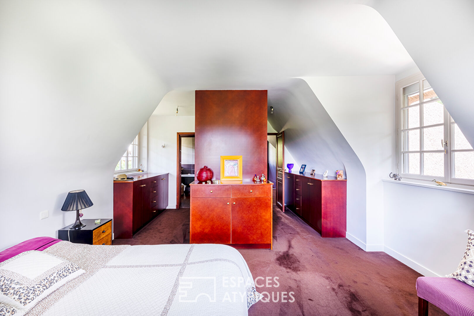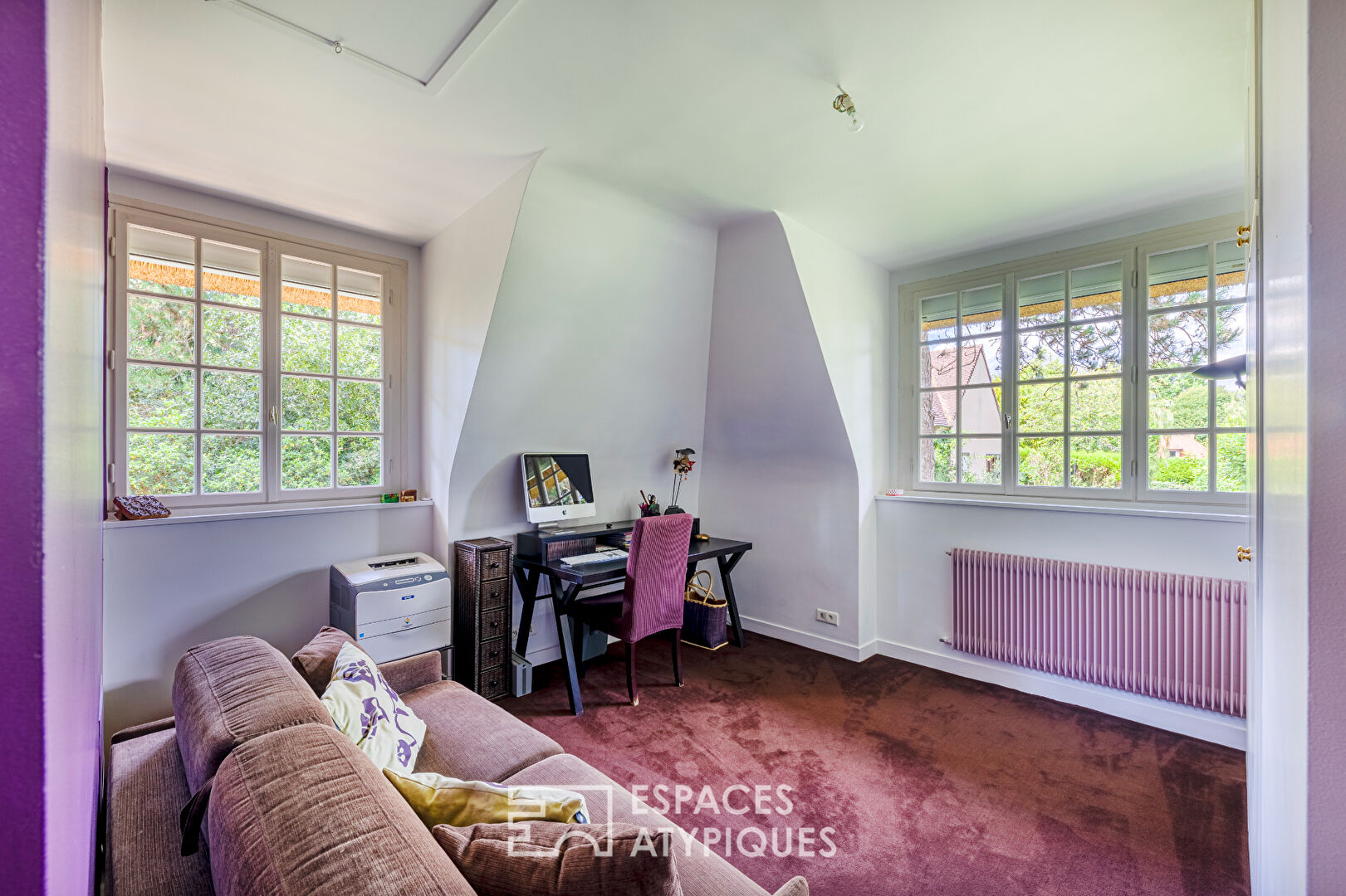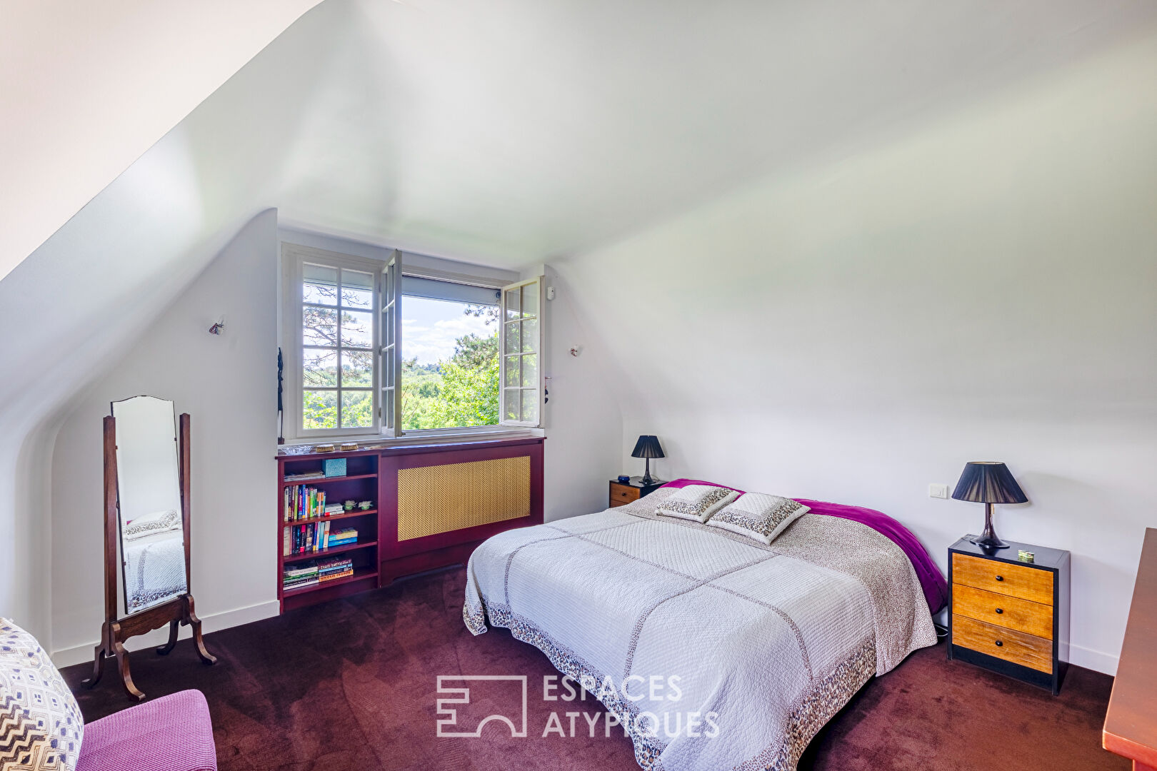 Située quartier des Gressets, dans un environnement paisible et verdoyant, cette chaumière de 182 m² (276,22 au sol) offre une atmosphère sereine et idyllique, parfaite pour ceux qui cherchent à échapper à l'agitation de la ville. A seulement 9 min à pied de la gare de Bougival, elle est lovée dans son superbe jardin paysagé, clos, sans vis à vis, de 1.345 m². L'entrée dessert la salle à manger et sa grande cuisine ouverte et fonctionnelle tournées sur une terrasse exposée ouest. Le salon qui développe une surface de 41 m² profite d'une cheminée comme de la vue sur la terrasse et son jardin savamment organisé. Une jolie chambre de 15 m² avec sa salle d'eau attenante bénéficie de la terrasse exposée Sud/Est. L'étage se compose d'un palier qui distribue deux grandes chambres de 13 et 24 m² et se partagent une salle de bains avec douche. Puis, la suite parentale de 25 m² offre un espace généreux avec un dressing double et une salle de bains avec douche privative pour un confort optimal. Le sous-sol complet s'organise en buanderie de 15 m², une pièce de rangement de 16 m², une cave à vin et un garage carrelé de deux grands stationnements. Cette chaumière est idéale pour les familles, les couples ou les personnes cherchant un refuge paisible à la campagne entourée de chants d'oiseaux. La propriété offre un cadre naturel exceptionnel, avec des possibilités de jardinage et de détente en plein air. Une vie paisible tout en restant connecté à la ville ? Ne tardez pas à visiter cette perle rare ! Piscine envisageable (PLU en zone UGd). Ecoles maternelle et élémentaire à 4 min à pied, Collège Victor Hugo à 12 min à pied Gare de Bougival à 9 min à pied, CLASSE ENERGIE : D/ CLASSE CLIMAT : D. Prix moyen des énergies indexés sur les années 2021, 2022, 2023 abonnements compris 3260 et 4460 euros par an Contact : Sophie 07 61 00 52 78 Sophie STANDERA (EI) Agent Commercial - Numéro RSAC : 832411144 - Paris.