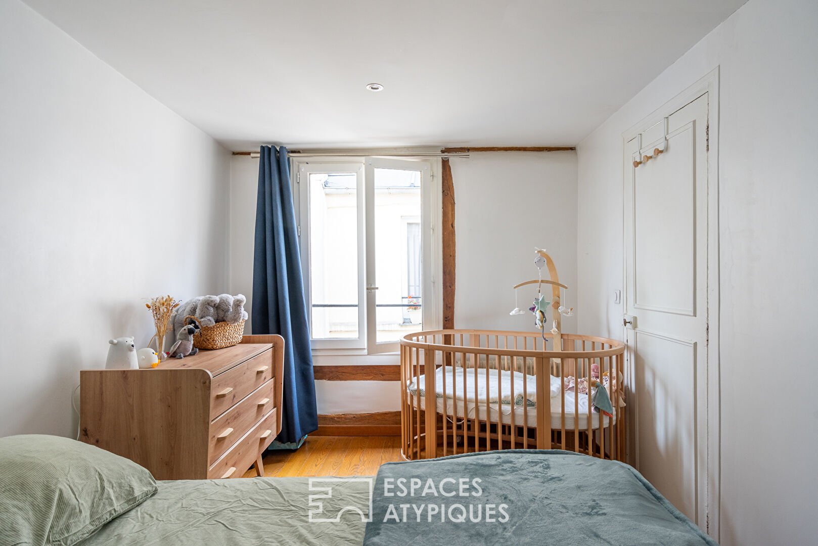 Situé au coeur du Haut-Marais, cet appartement de 46,63 m² Carrez (60 m² au sol) se trouve au cinquième et dernier étage d'un immeuble ancien bien entretenu. Avec ses poutres apparentes, son parquet en bois massif et ses tomettes d'origine, il offre tout le charme architectural typique du Marais. La lumière traversante et le calme absolu apportent une qualité de vie rare dans le quartier. L'entrée mène à une première pièce comprenant une cuisine semi-ouverte, équipée et optimisée avec un espace buanderie et de nombreux rangements sur mesure. L'ensemble est baigné de lumière grâce à un grand ouvrant de toit exposé plein sud. Le séjour de 25 m² s'étend derrière une verrière atelier qui dialogue élégamment avec les matériaux anciens. Une grande bibliothèque sur mesure structure l'espace et apporte une touche contemporaine parfaitement intégrée. Côté nuit, une chambre de 11,42m2 prend place au fond de l'appartement, entièrement au calme sur cour. Une salle d'eau avec WC complète l'ensemble. Ce bien rare, idéalement situé à deux pas de la rue de Bretagne, du Marché des Enfants Rouges, du Square du Temple et de nombreuses adresses prisées du Marais, bénéficie de tous les atouts du quartier : commerces de bouche, cafés, restaurants et vie culturelle. Les stations Temple et République, toutes proches, facilitent l'accès à l'ensemble de Paris. Bien soumis au statut de la copropriété. Métro : Temple, République. CLASSE ENERGIE : E/ CLASSE CLIMAT : E. Montant moyen estimé des dépenses annuelles d'énergie pour un usage standard, indexées aux années 2021, 2022, 2023 : entre 1300 euros et 1810 euros (abonnement compris). Les informations sur les risques auxquels ce bien est exposé sont disponibles sur le site Géorisques : https://www.georisques.gouv.fr. Contact : Magaly 06 63 16 83 32 RSAC : 908 772 452 PARIS Copropriété de 22 lots - dont 20 lots habitation. (Pas de procédure en cours). Charges annuelles : 1268 euros.