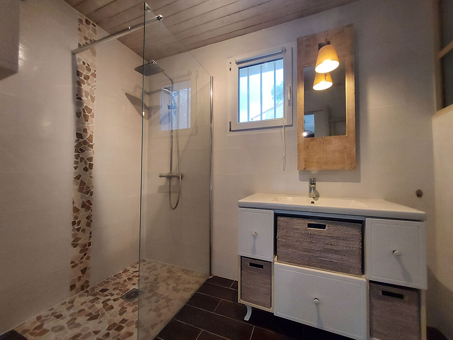 A 2 km de la plage et 800 m des commerces de Dolus, au calme en limite de zone agricole, MAISON en excellent état d'environ 140 m² habitables comprenant un séjour avec cuisine équipée et ouverte d'environ 49 m², un salon avec poêle à pellets de 33,20 m², un dégagement desservant une chambre avec placards et salle d'eau de 18,60 m², un cellier et WC séparés avec lave-mains - A l'étage, deux chambres avec placards de 10,30 et 10,50 m², une salle de bains avec WC - Auvent, stationnement et jardin clos - Accès par servitude de passage. (4.72 % honoraires TTC à la charge de l'acquéreur.)