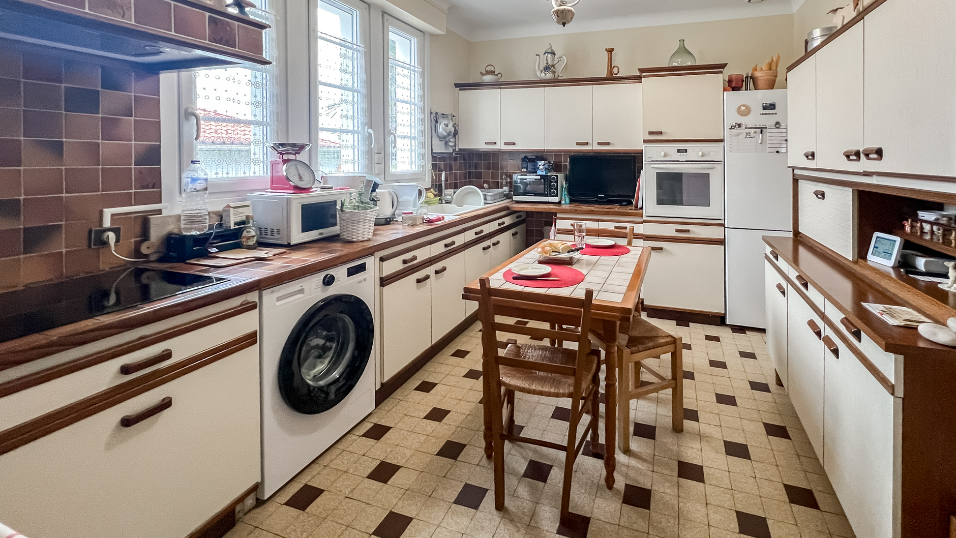Exclusivité Donzacq Immo, sur Anglet. Située dans le quartier trés recherché de Choisy / El Hogar / Place Lamothe, au calme et à deux pas de toutes les commodités, venez découvrir ce véritable petit bijou de plain-pied des années 1960. Cette maison développe 107 m² habitables et offre trois chambres ainsi qu'un bureau, idéal pour le télétravail ou une chambre d'appoint. Vous profiterez d'une belle cuisine indépendante équipée de 13 m² exposée plein sud, d'un double séjour lumineux de 27 m², d'une salle de bains, d'un WC, de deux vérandas et d'un second WC indépendant. Un sous-sol accessible depuis l'intérieur, avec belle hauteur sous plafond, fait office de vide sanitaire et offre un espace de stockage appréciable. Un garage indépendant complète l'ensemble. La parcelle de 629 m², agréablement répartie autour de la maison, permet d'envisager l'implantation d'une piscine côté sud même si vous en avez déjà une à deux pas, et en dix fois plus grand ! Un léger rafraîchissement révélera tout le cachet et le potentiel de cette maison au charme certain. On le sait : en immobilier, l'emplacement fait tout et ici, tout est réuni. Mais il n'y en aura pas pour tout le monde ! DPE : D Honoraires de 5 % à la charge de l'acquéreur. (5.00 % honoraires TTC à la charge de l'acquéreur.)