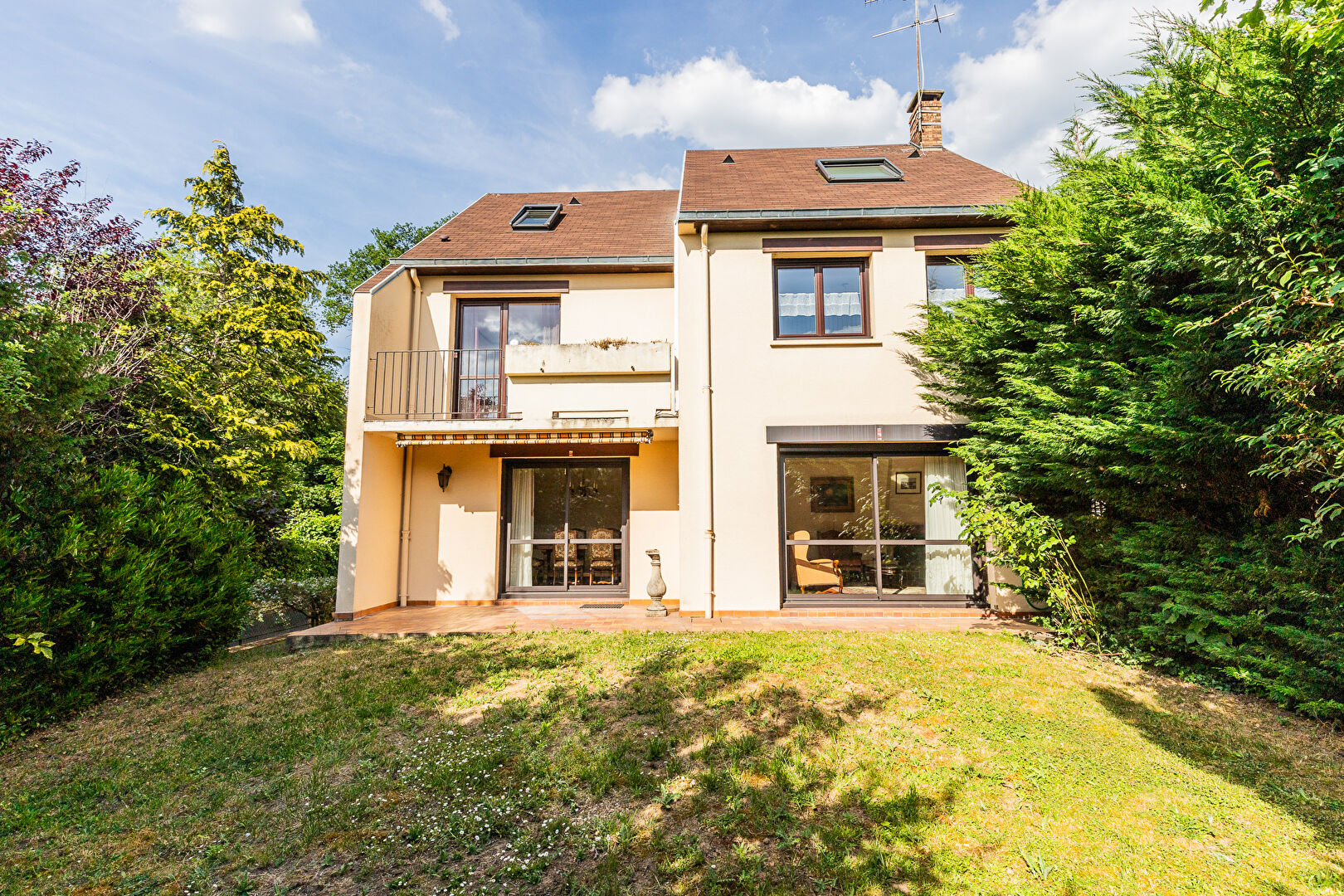 DRAVEIL, Centre-Ville- Villiers, proche du centre culturel, dans une impasse à proximité des écoles, des commerces et des transports, venez découvrir cette maison familiale d'architecte, spacieuse, atypique, construite dans un cadre boisé et reposant. Des demi niveaux ou demi étages de 7 marches desservent les chambres et autres pièces. Au rez-de-jardin : Un grand double séjour de 38m² avec cheminée, très lumineux, a 2 grandes baies vitrées s'ouvrant sur la terrasse et le jardin clos. Une cuisine indépendante de 14,70m² avec son cellier attenant, est aménagée, équipée avec un coin repas. Sa porte-fenêtre donne sur le jardin, face à un petit bois. Des WC avec lavabo. Au premier 1/2-niveau. Une belle entrée principale et une grande chambre de 15,52 m², vous accueillent. Le premier étage, vous séduira par son espace nuit offrant 2 grandes chambres de 15,59m² et de 15,43m², orientées Sud-Ouest, ayant chacune accès au balcon. Au même niveau, un dressing indépendant, des WC séparés de la salle de bains et de la salle d'eau, toutes deux, éclairées par des velux. Les combles ensoleillés par de grands velux, climatisées, sont aménagées en une belle chambre en duplex de 35 m² (20,30m² loi carrez). Une buanderie 21,44 m² (7m² loi carrez) ayant déjà un lavabo et des WC, pourrait être rénovée en salle de bains. Un garage de 19 m² et une cave complètent cette maison. Le tout édifié sur un terrain de 350m². Coup de coeur assuré pour cette maison fonctionnelle, familiale ! Les + : beaux volumes, rénovations récentes : toiture, radiateurs, ballon d'eau chaude, fenêtres double vitrage, volets électriques et solaires. Possibilité de faire une 5ème chambre dans le duplex. 2 Kms de la base de loisirs multiples activités - RER C et D. Point vérité : Maison en parfait état à mettre au gout du jour. Copropriété de 38 lots : 36 maisons mitoyennes par 2, 3 ou 4. Seulement 2 maisons individuelles, dont celle que vous allez visiter. Syndic bénévole; Aucune procédure en cours. Copropriété de 38 lots - dont 38 lots habitation. Charges annuelles : 663.22 euros.