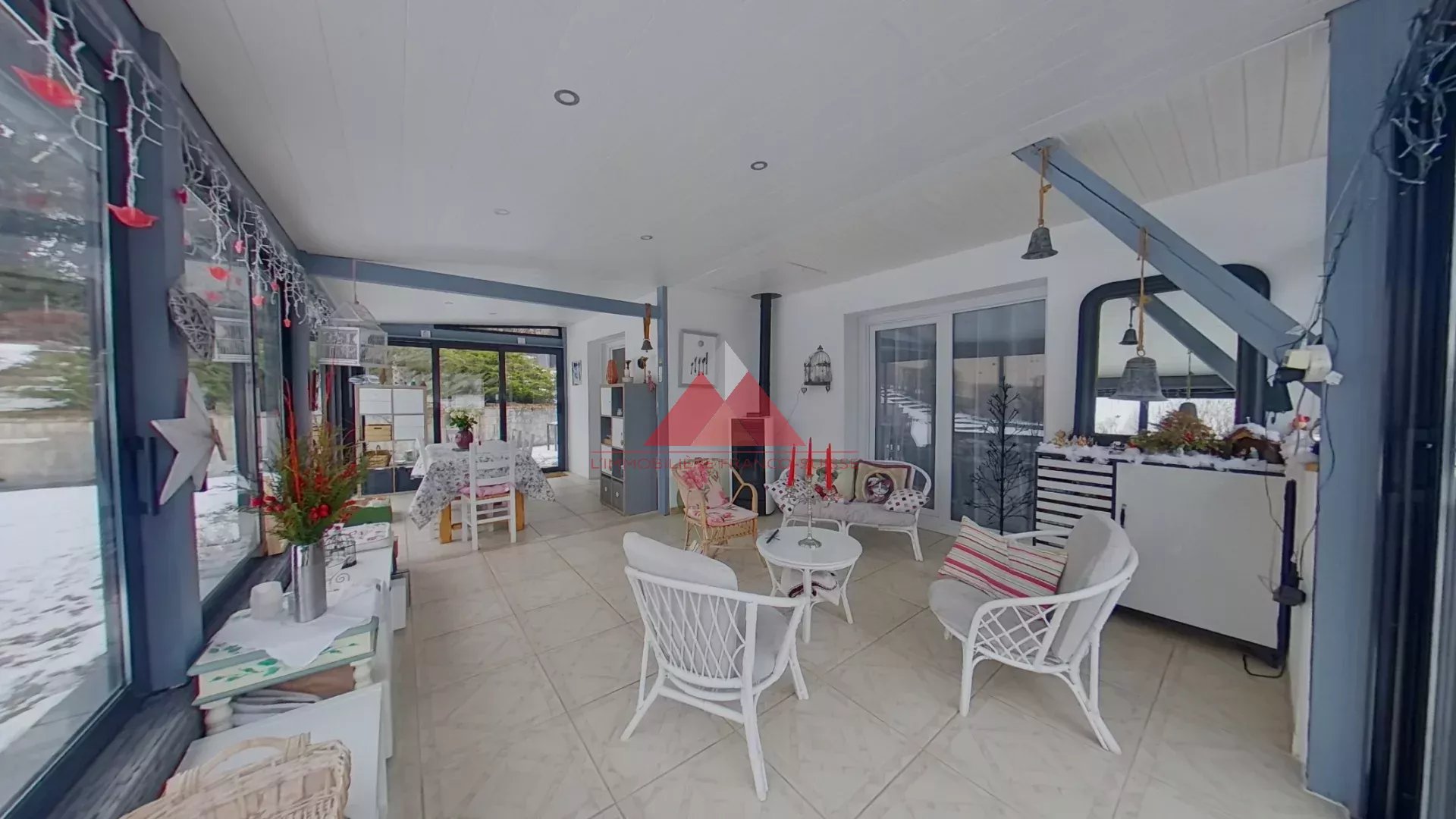 La véranda agrémentée d'un poêle à pellets récent vous permets de profiter toute l'année d'un espace de vie supplémentaire agréable et lumineux.