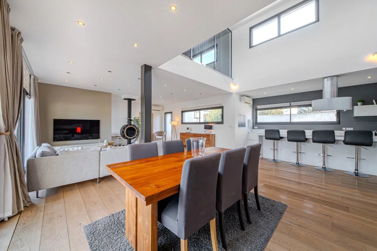 Côté extérieur, la propriété est implantée sur un terrain paysagé de 926 m² avec une élégante piscine à débordement, une grande terrasse en bois et un garage complètent ce bien rare sur le secteur, qui allie volumes généreux, architecture contemporaine et art de vivre.