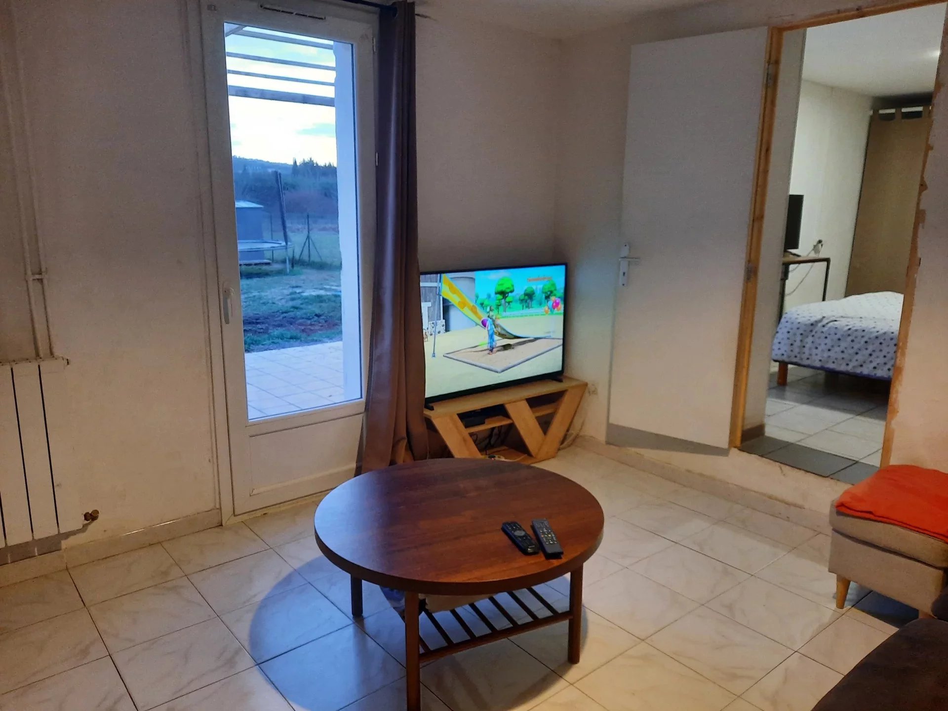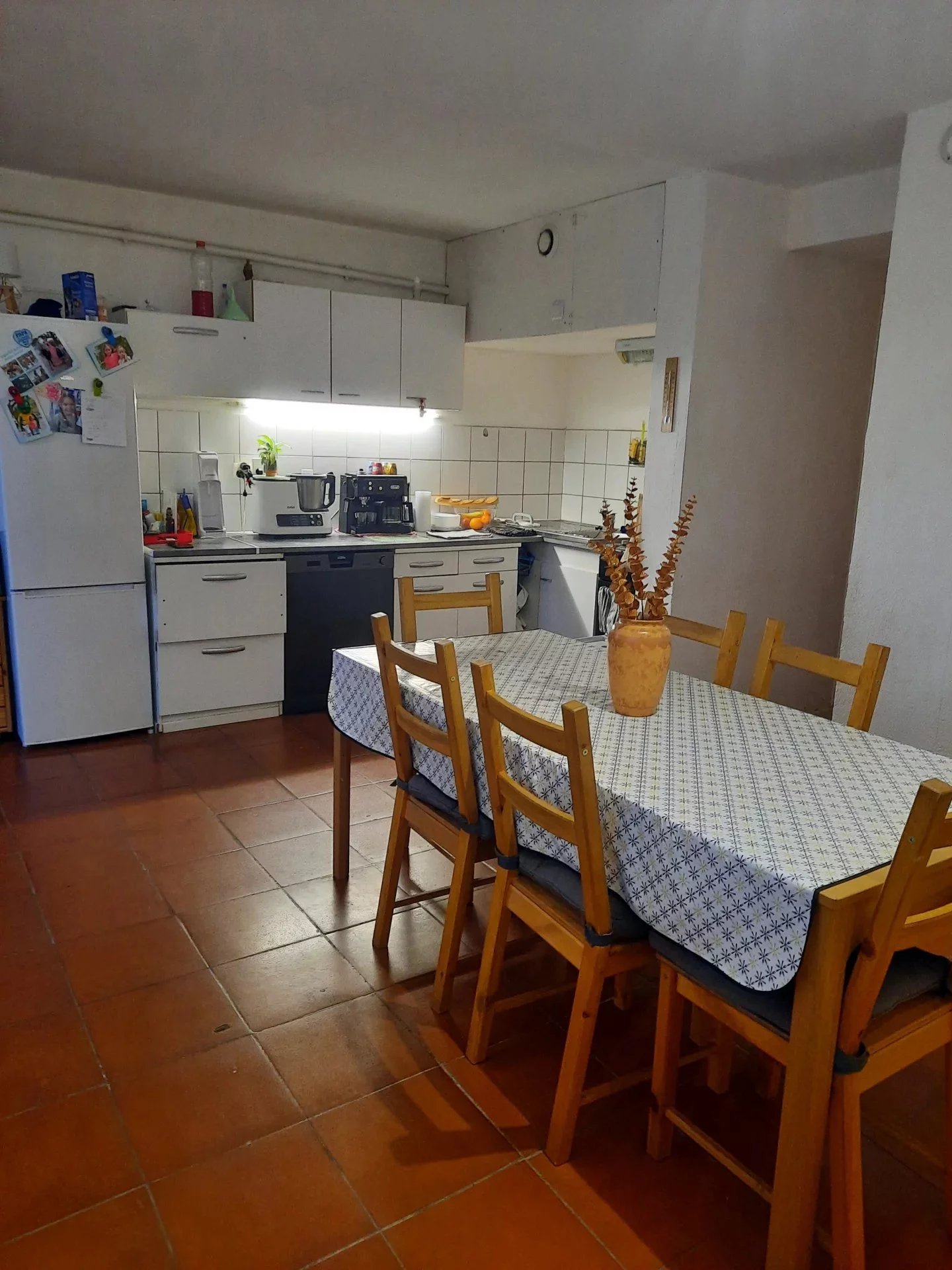 Le premier étage accueille un appartement de type 4 fonctionnel. Il se compose d'une pièce de vie, d'une cuisine indépendante et de trois chambres, offrant une vue dégagée sur le terrain.