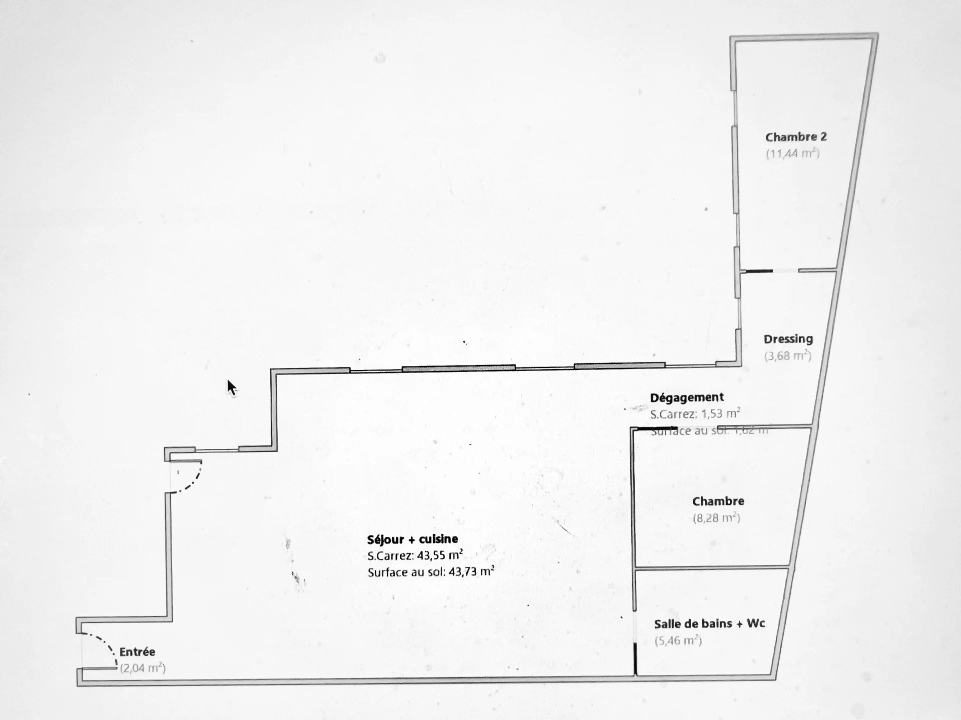 Il se compose d’une entrée, d’un vaste séjour de 44 m² avec cuisine ouverte entièrement équipée, d’une chambre, d’un dressing d'une 2e chambre ou bureau et d’une salle de bains avec WC, .