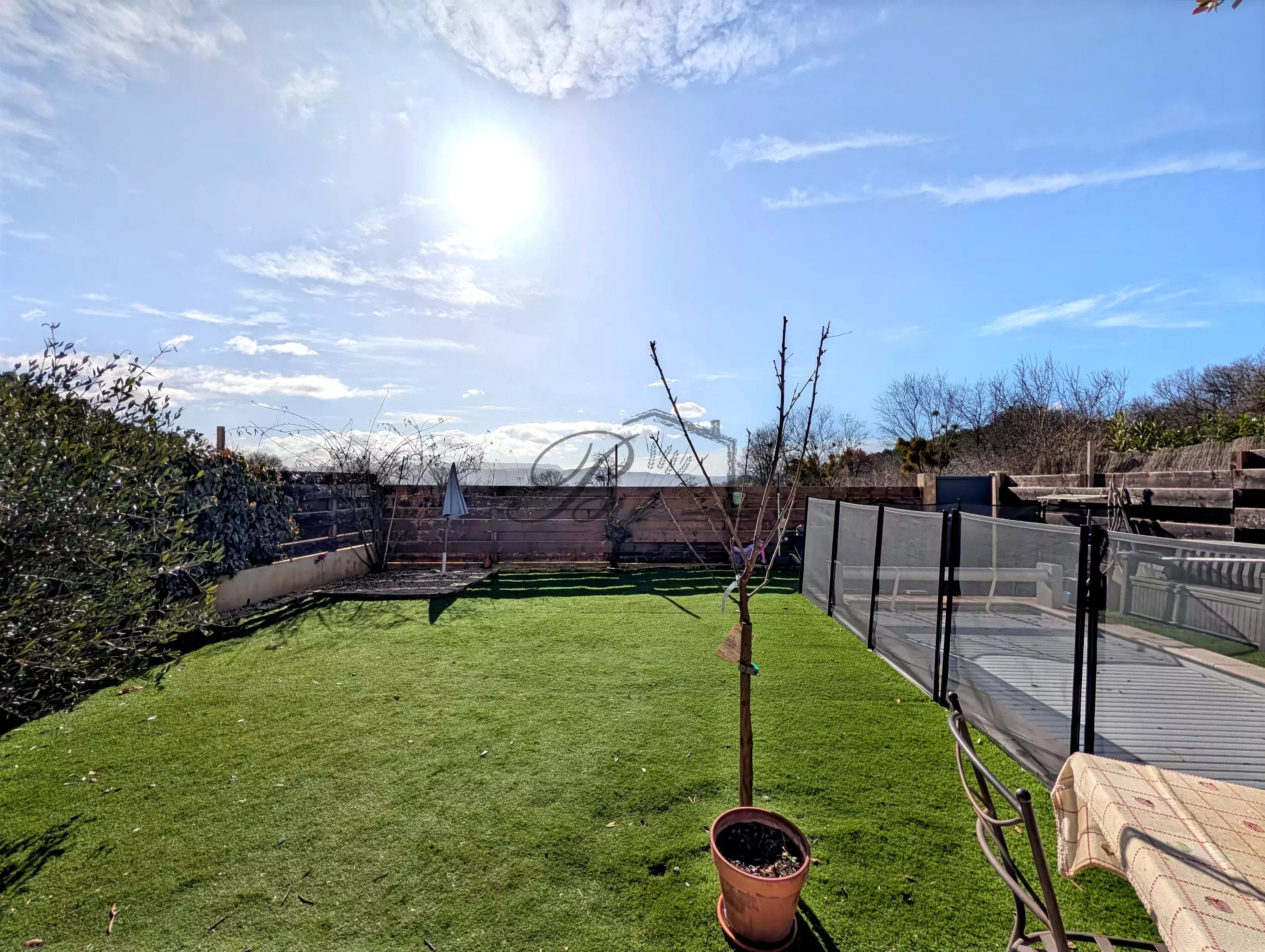 De plus, vous accèderez au jardin par les baies vitrée, où vous admirerez la vue depuis la terrasse et le coin piscine.