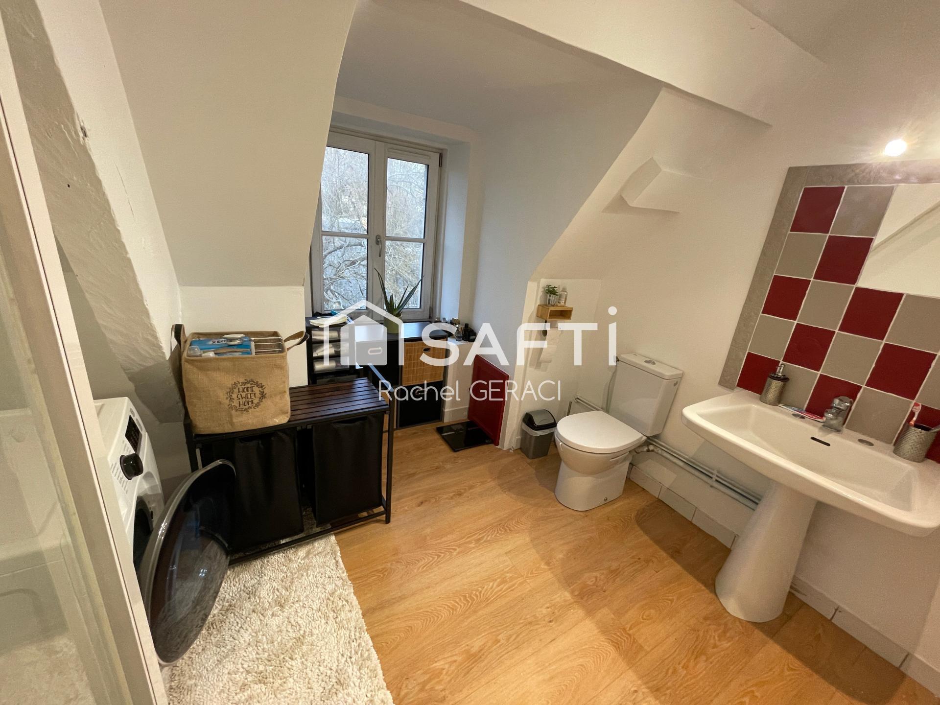À moins de 100 mètres des remparts proche de toutes commodités à pied, bâtiment du 17e siècle bien entretenu, cet appartement type T2 au 2e et dernier étage de 56 m² loi carrez (80 m² au sol) traversant et lumineux. Composé, d'une pièce de vie avec cuisine ouverte aménagée et équipée, une chambre, une salle de douche avec wc, un débarras et un espace jardin avec cabanon.