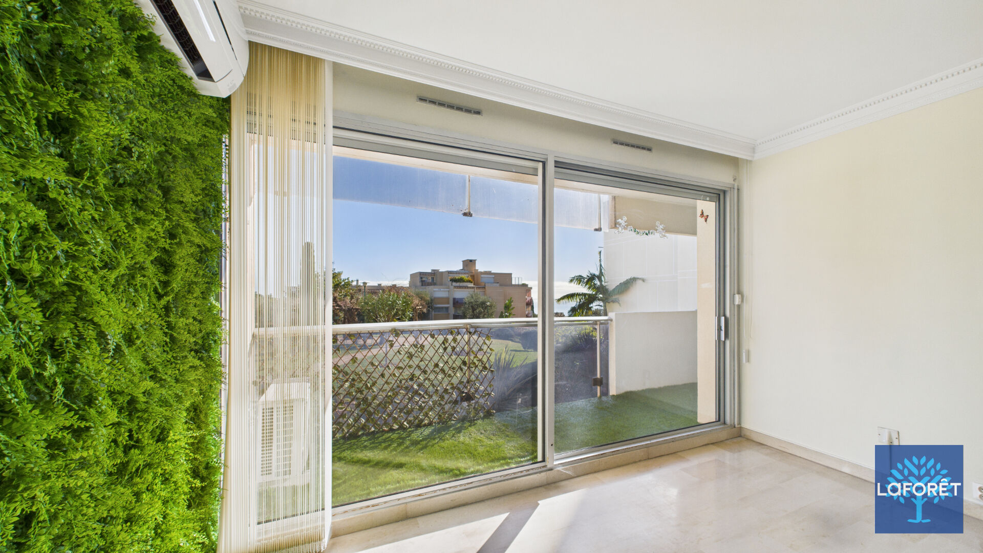 Le séjour et la cuisine ouvrent sur une terrasse offrant une vue dégagée sur les espaces verts de la résidence avec aperçu un mer. L'appartement est complété par une cave et dispose de la climatisation.