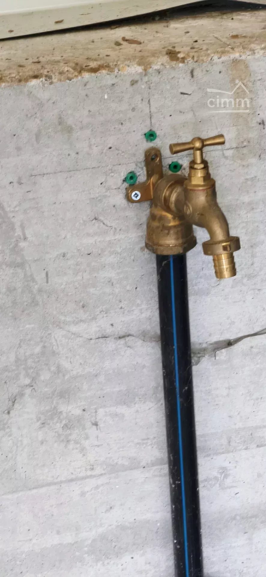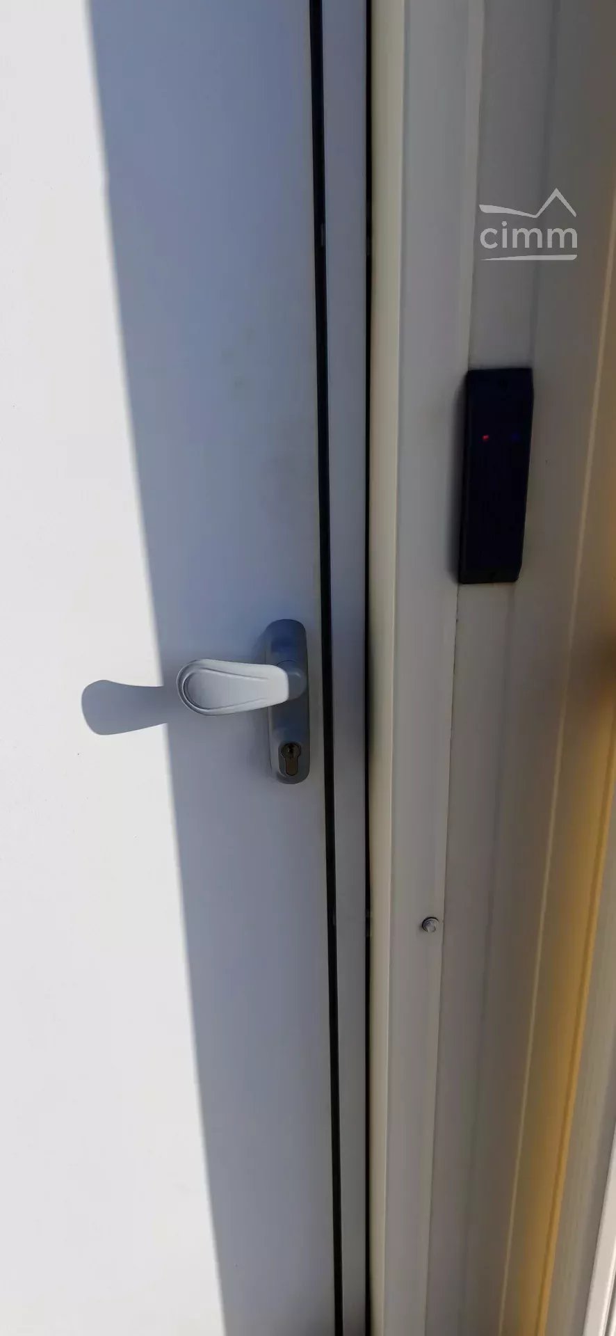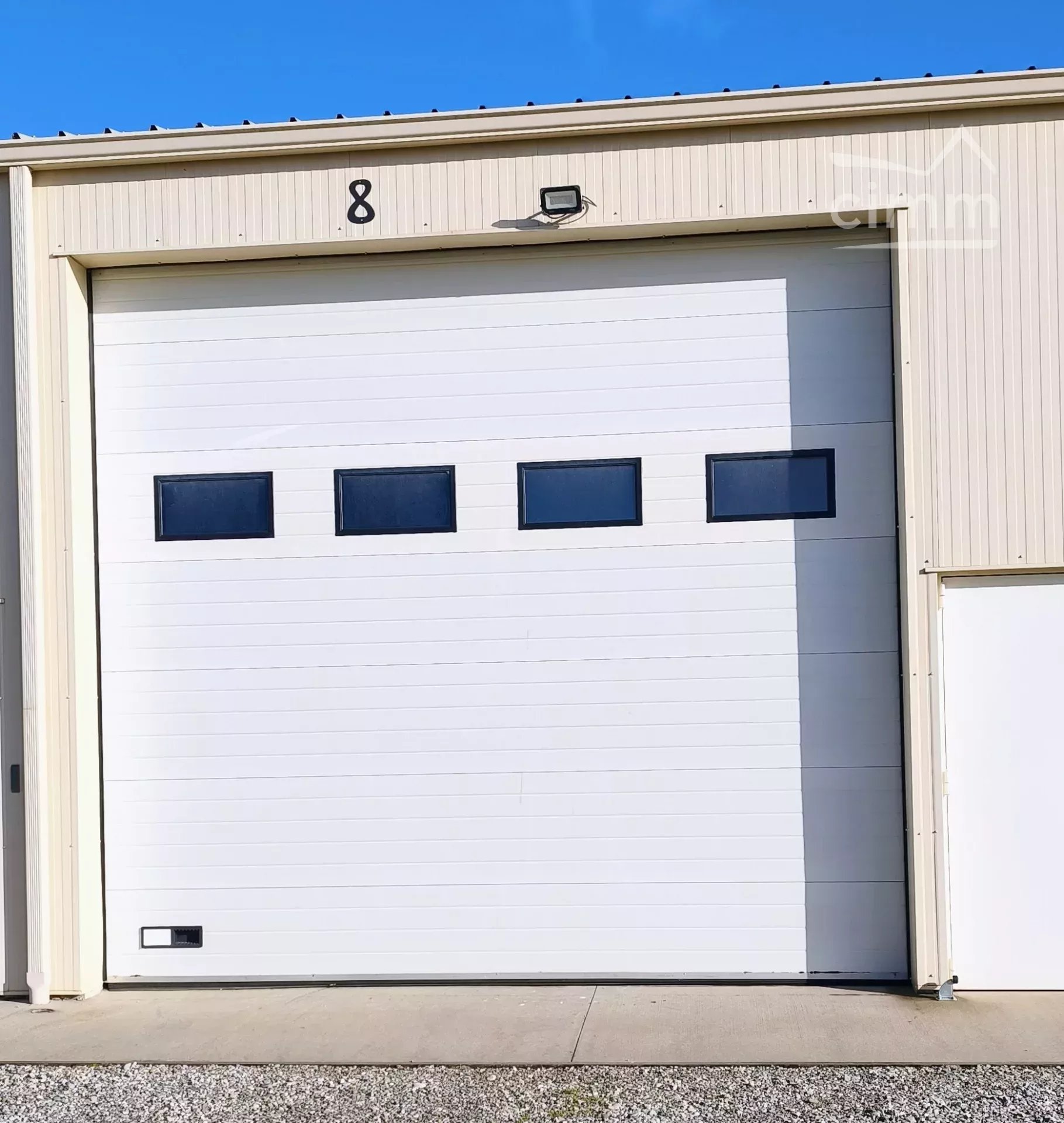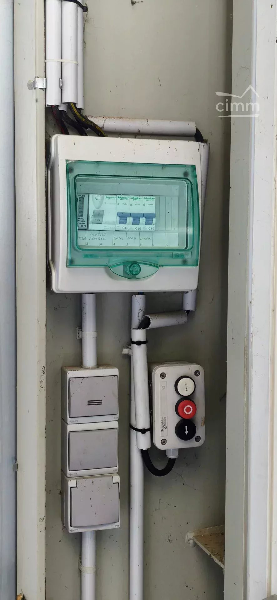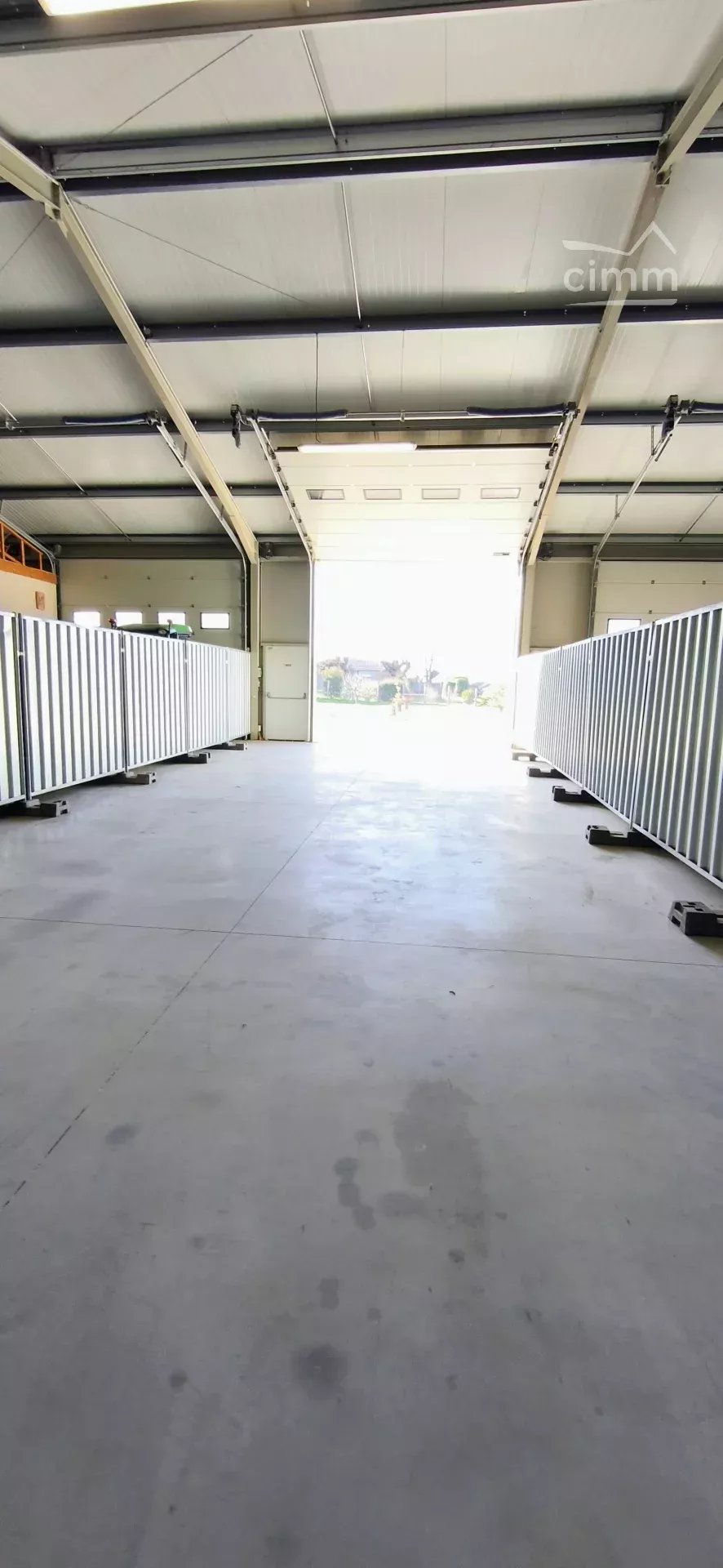 construction récente avec une large porte sectionnelle un point d'eau, un compteur électrique et une porte avec une serrure anti panique.