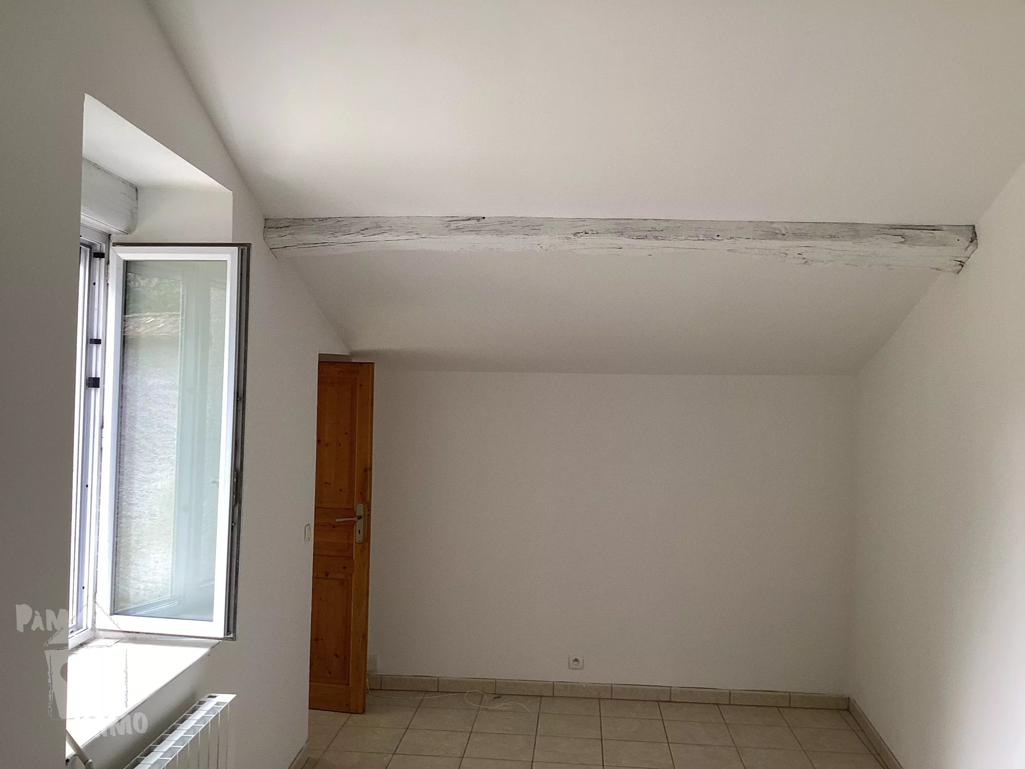 À l’étage, la maison propose une grande pièce de vie lumineuse avec cheminée, ouverte sur une cuisine semi-équipée et donnant directement accès à la terrasse.