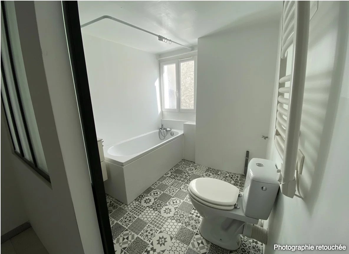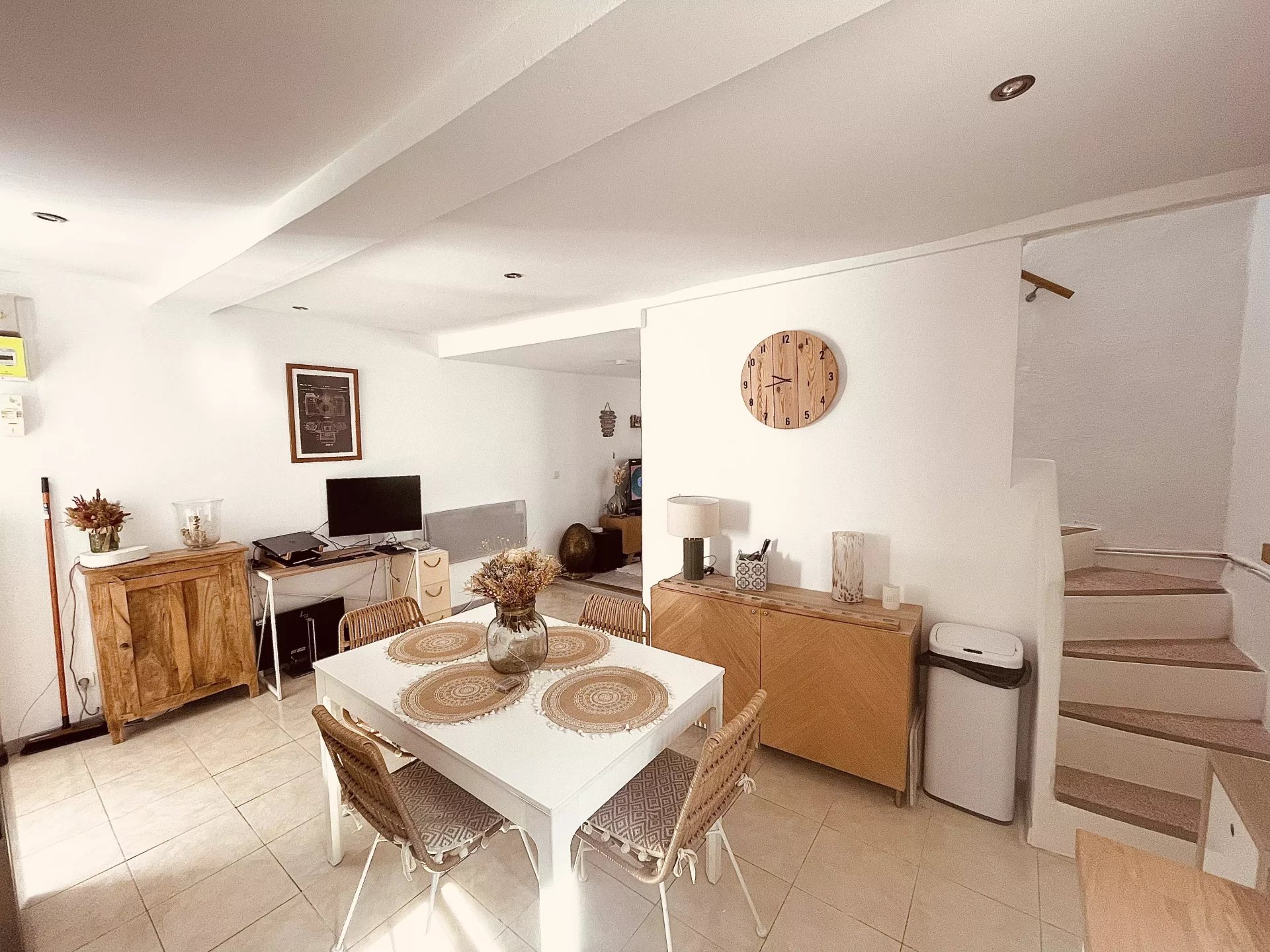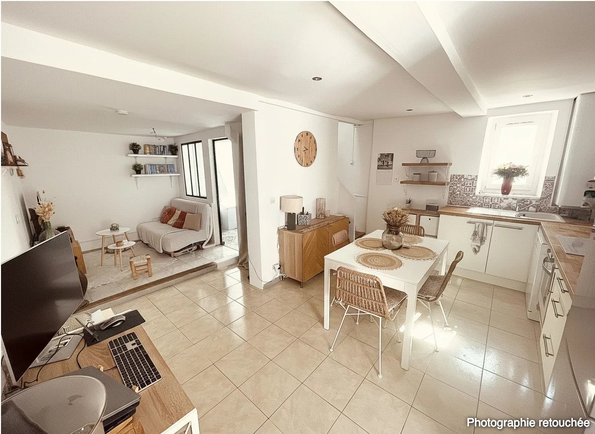 A vendre, Au coeur du village de Logis Neuf, maison de ville sur 2 niveaux avec extérieur. Au rdc, une grande pièce de vie en L distribue une cuisine avec salle à manger d'un côté et un salon de l'autre, ainsi qu'une salle de bains avec toilettes.