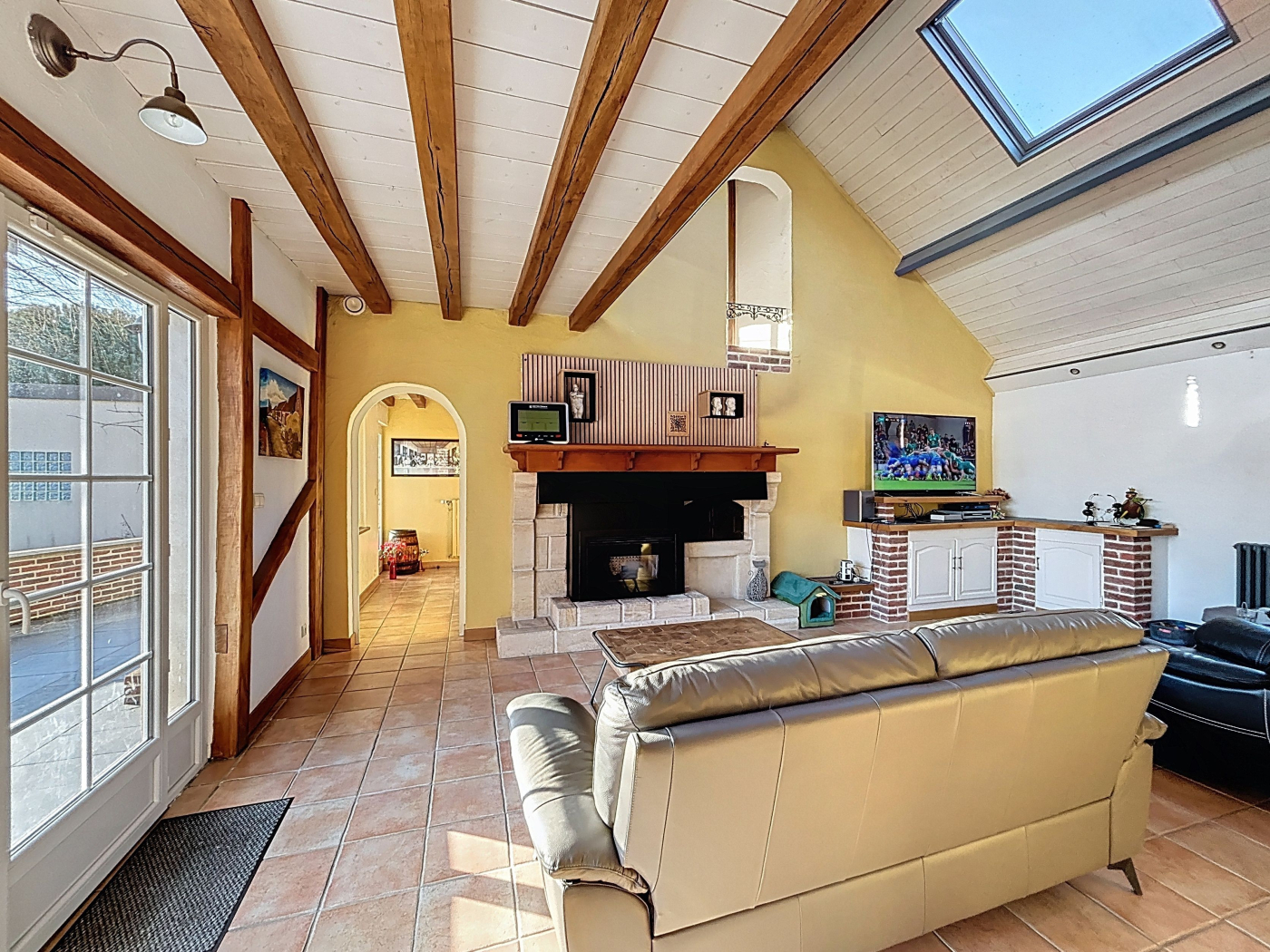 Au rez-de-chaussée : séjour cathédrale d'environ 60 m² avec poêle à granulés, cuisine ouverte aménagée et équipée, trois chambres dont une suite parentale (dressing, salle d'eau, WC), une salle d'eau avec WC, arrière-cuisine avec accès à la cave.