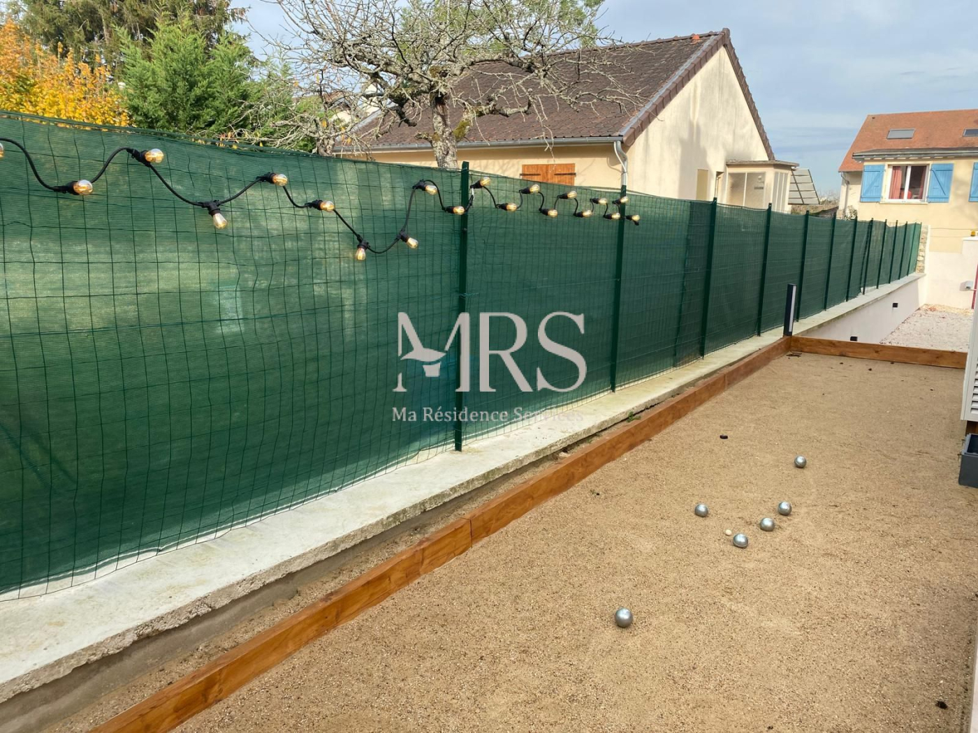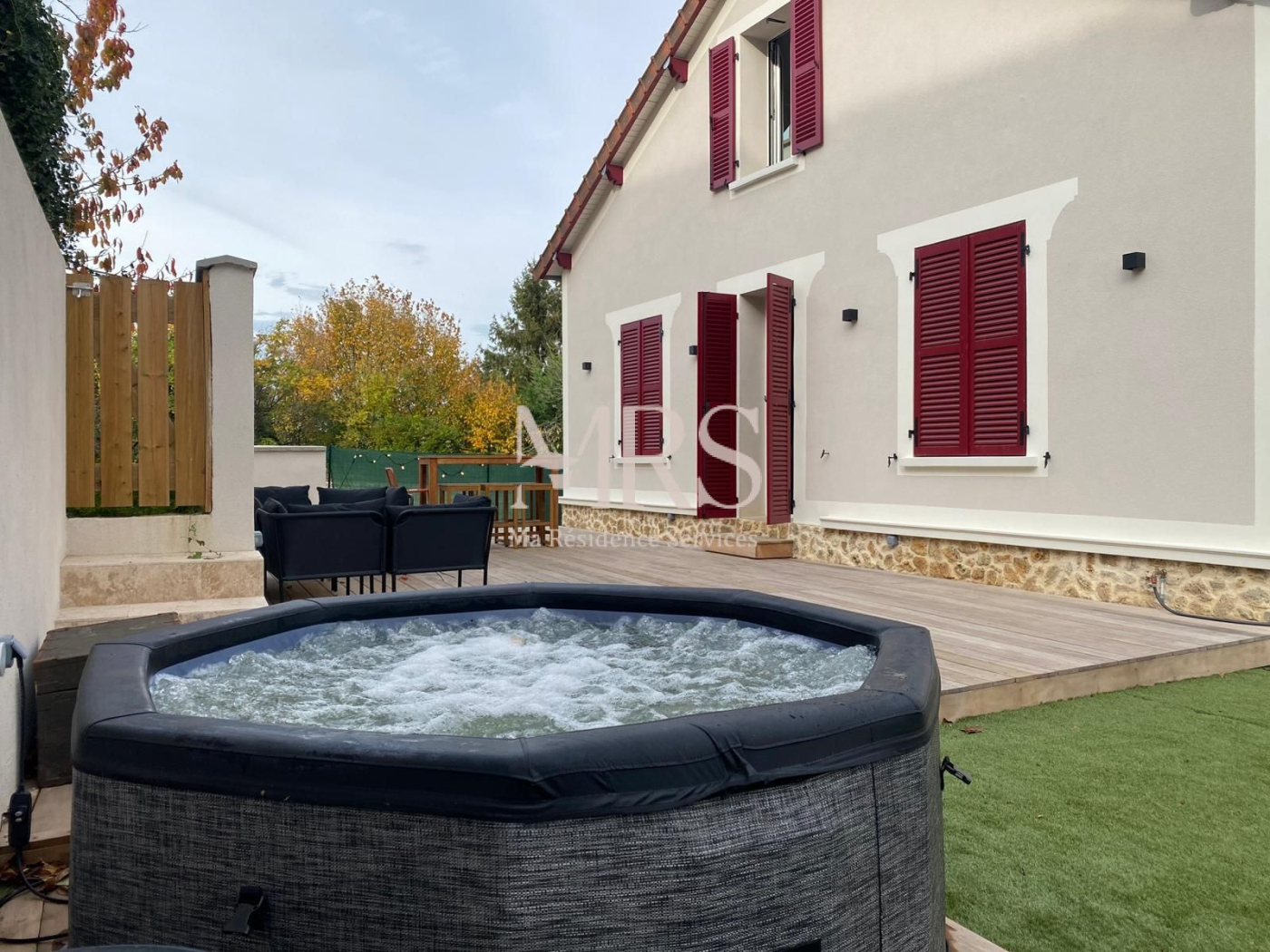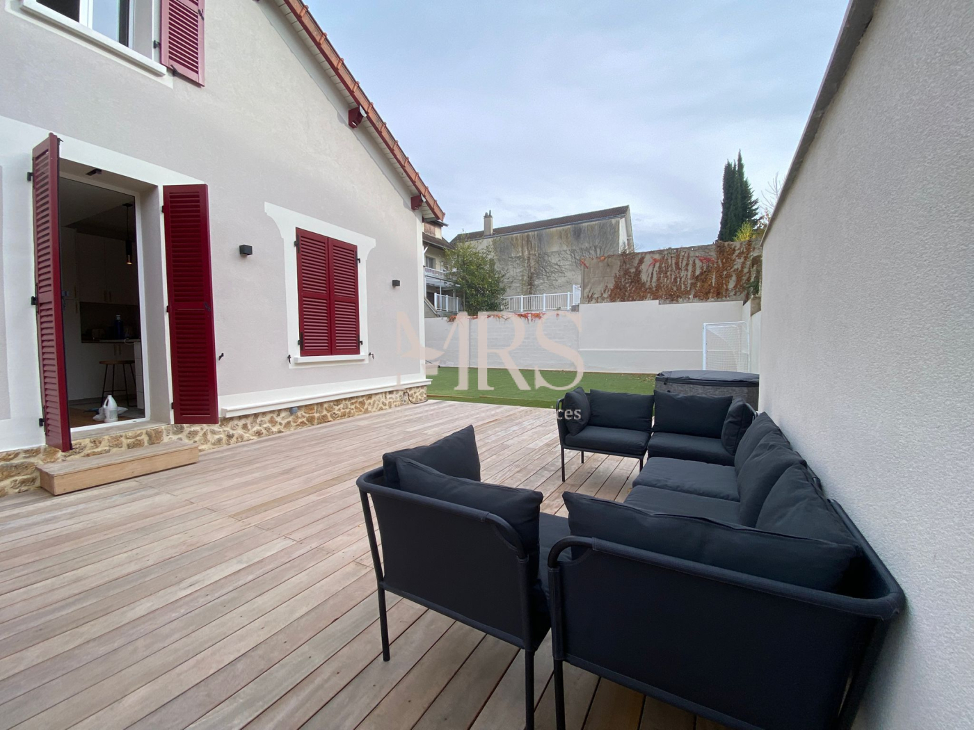 Terrain paysager de 800 m² avec gazon synthétique : mini terrain de foot, basketball, terrain de pétanque, jacuzzi extérieur.
