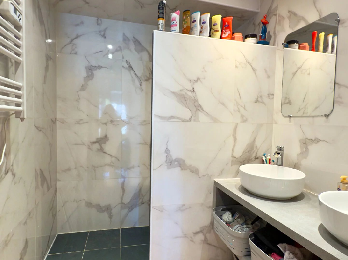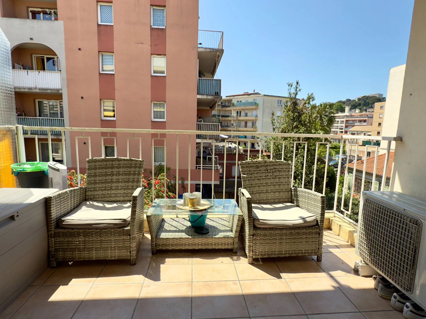 CENTRE CAGNES SUR MER : Proche commerces et commodités, au calme d'une rue peu passante, grand trois pièces d'env. 70m2, traversant, composé d'une entrée avec rangements, d'un vaste séjour exposé SUD/OUEST donnant sur terrasse couverte, d'une cuisine équipée, de deux chambres avec placard donnant sur balcon, d'une salle d'eau avec douche à l'italienne et double vasque et de WC indépendants suspendus. Vous apprécierez les espaces bien pensés, la luminosité des pièces et la proximité des transports et écoles. Possibilité parking à la location (71/mois) Copropriété de 30 lots - dont 15 lots habitation. (Pas de procédure en cours). Charges annuelles : 3299.00 euros.