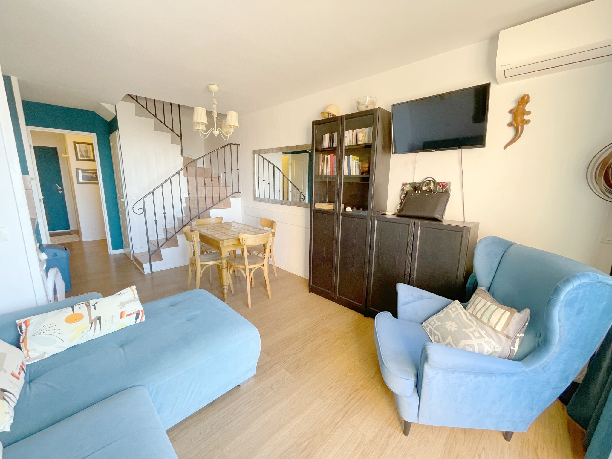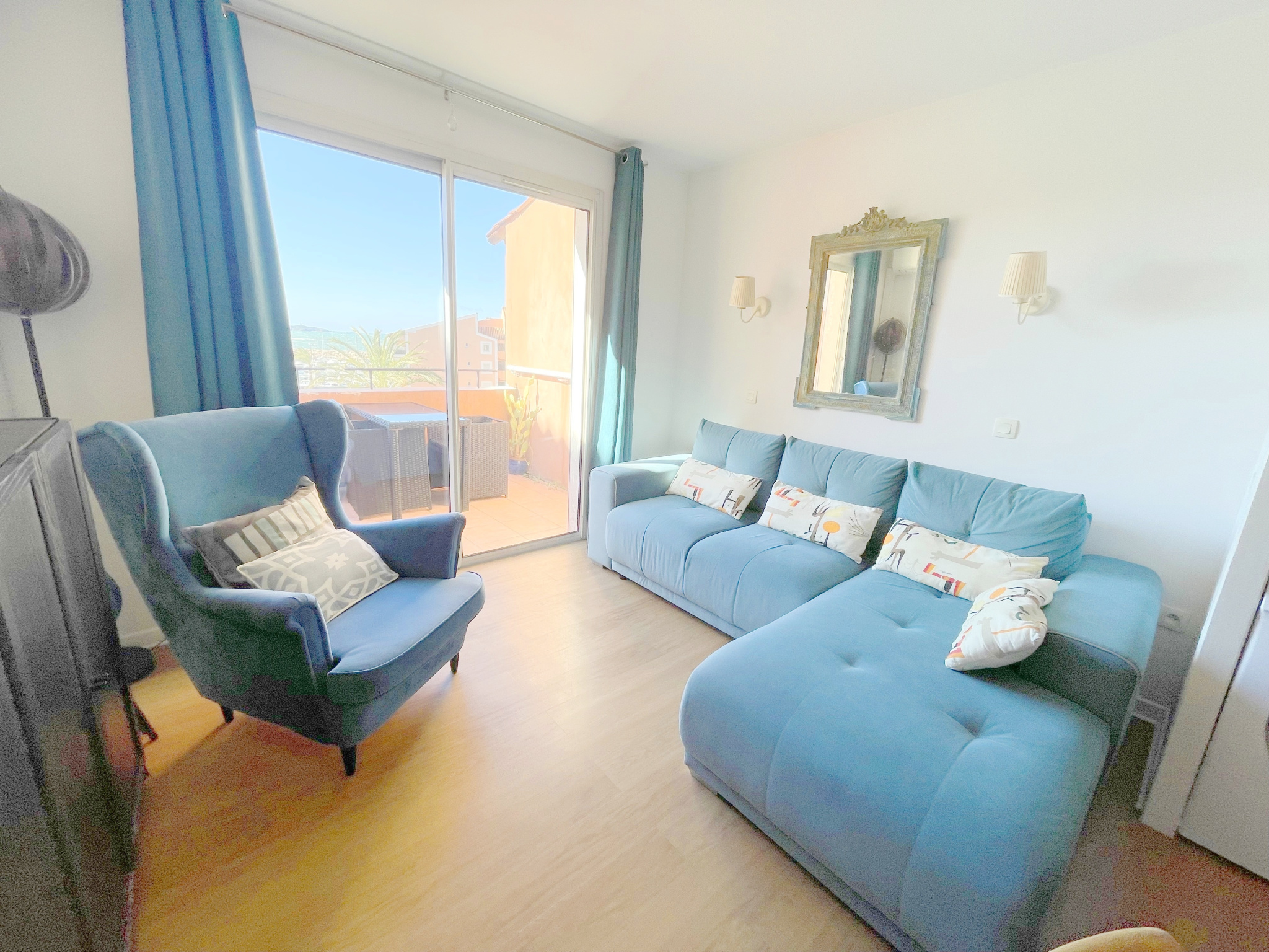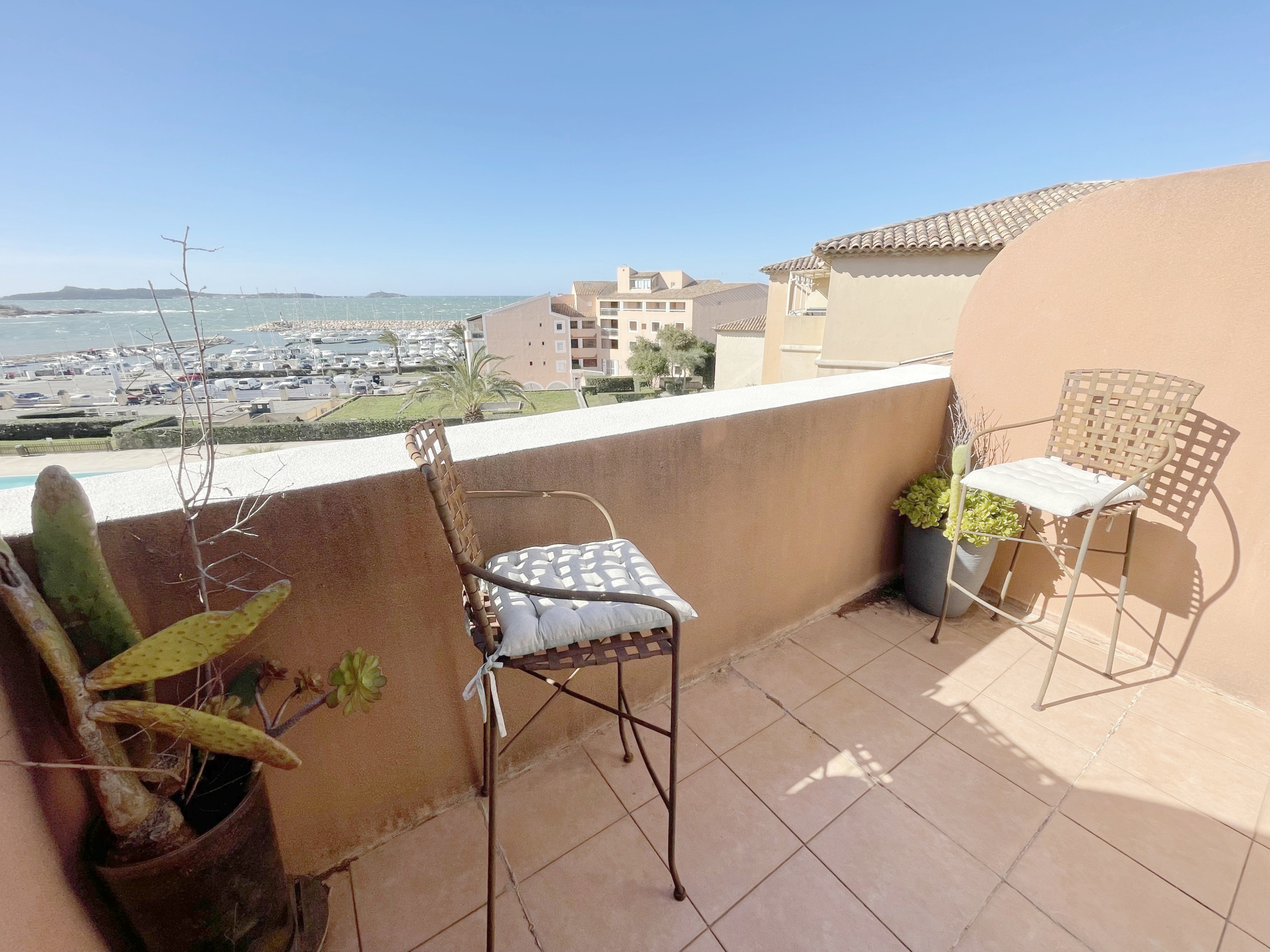 Exceptionnel duplex T3 de standing de 53 m2 au sol situé au dernier étage avec ascenseur avec vue mer exceptionnelle comprenant un hall d'entrée avec rangements ,une chambre cabine , une salle d'eau à l'italienne avec wc , une lumineuse pièce de vie salon-séjour climatisée et cuisine US équipée traversante donnant sur une terrasse exposée plein sud .