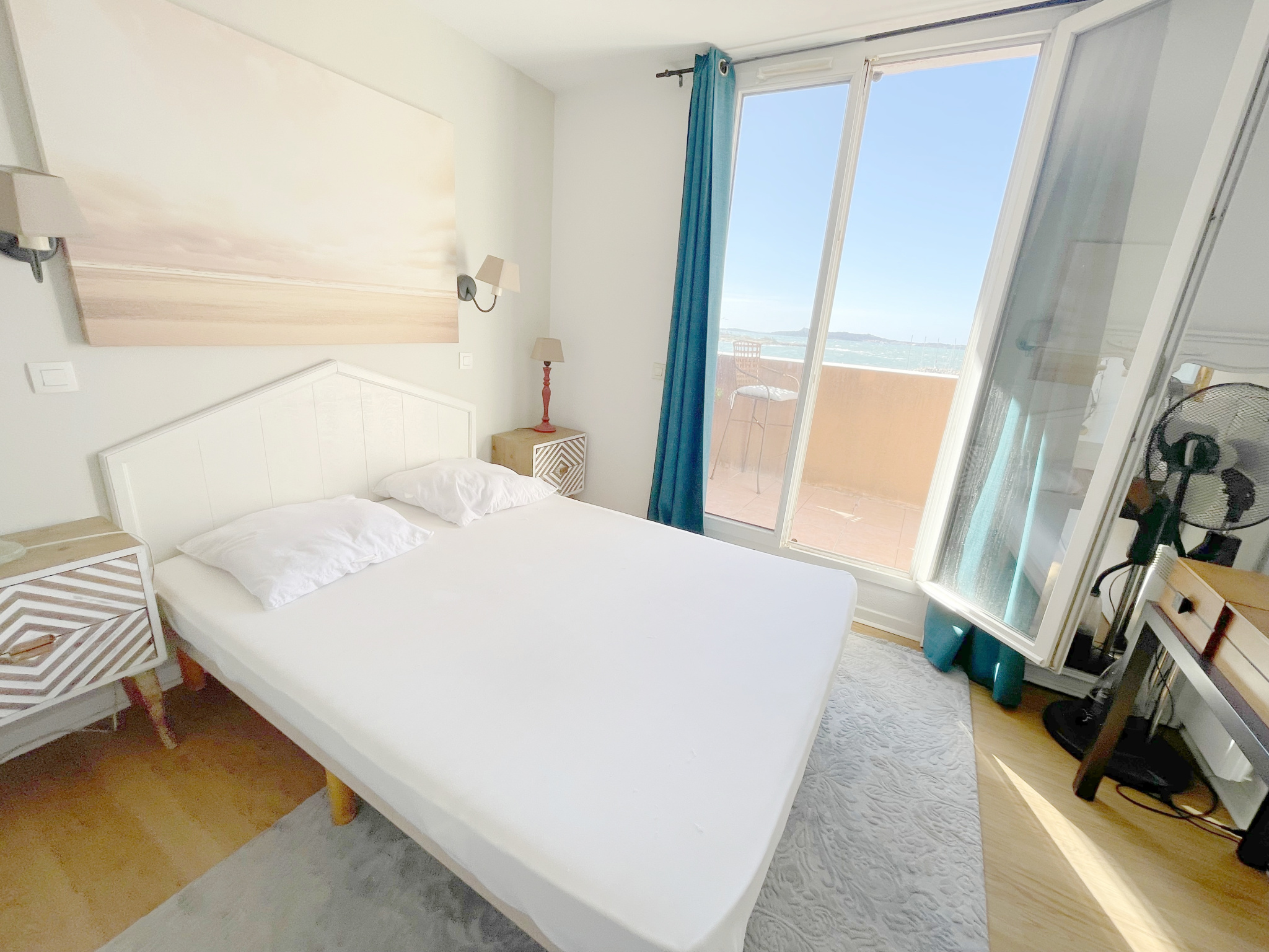 A l'étage , une chambre parentale avec rangements , une salle de bains avec wc et une terrasse tropézienne donnant sur la vue mer panoramique .