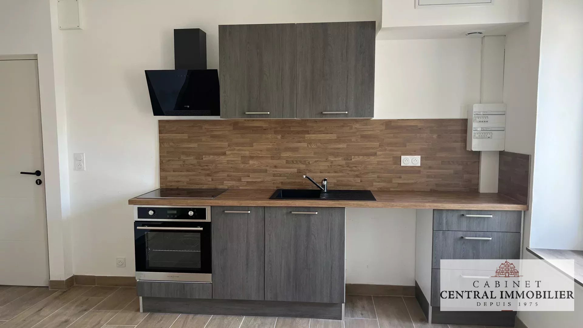 A louer 495€/mois C.C. Au centre ville Appartement au rdc, comprenant une pièce de vie carrelée avec cuisine aménagée et équipée de 17,21m², une salle d'eau carrelée de 4,71m² avec WC, une chambre carrelée de 11,83m². La cuisine est équipée d'un évier, de plaque de cuisson, d'une hotte et d'un four. Chauffage électrique. Double vitrage. Petit espace extérieur.