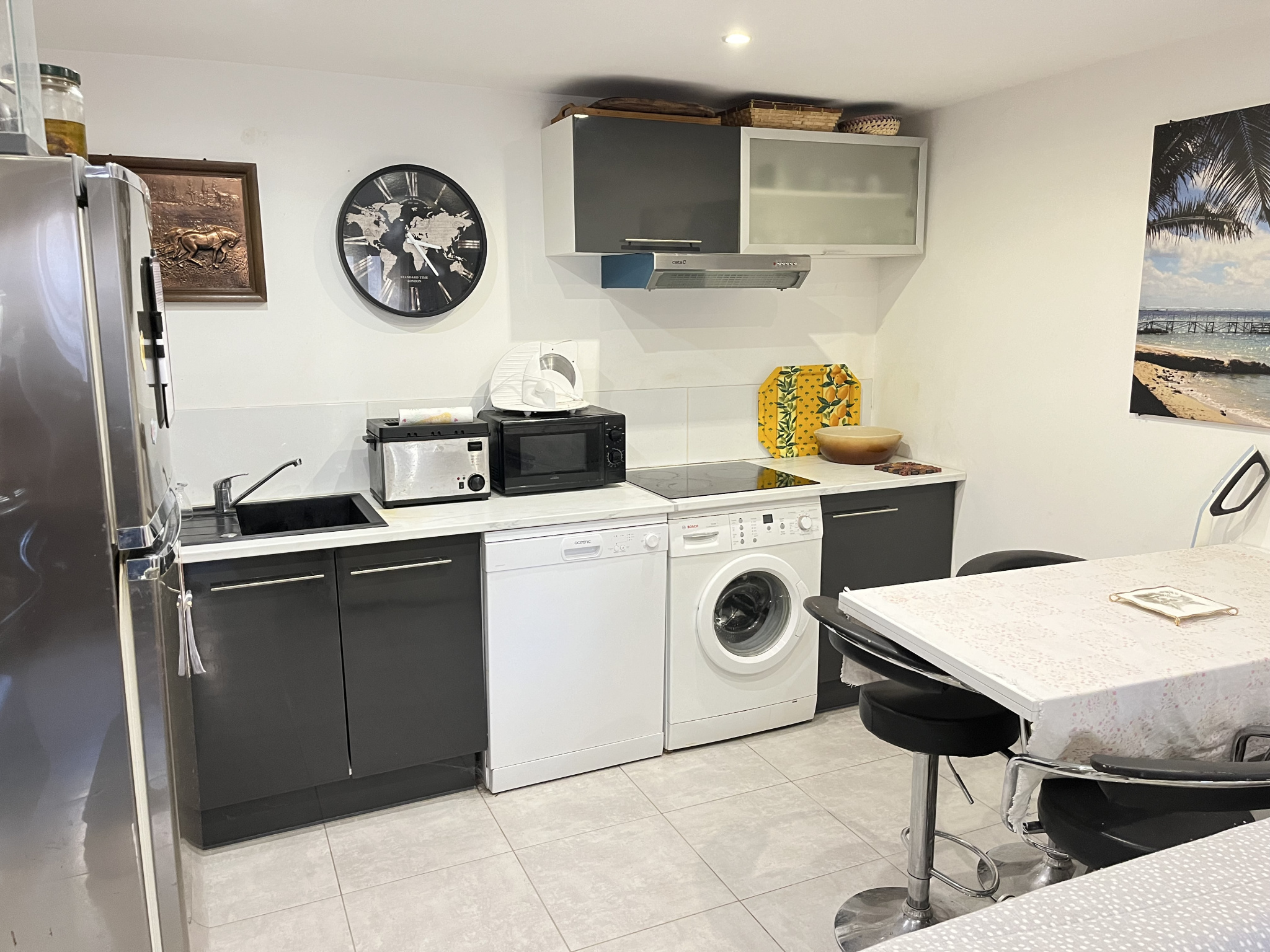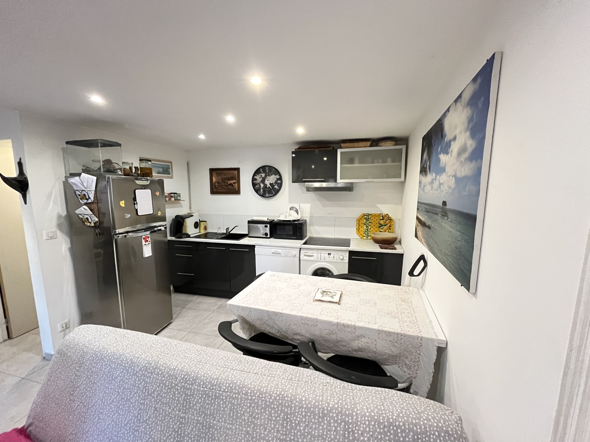 Elle se compose en rez-de-chaussée d'une pièce de vie avec cuisine aménagée et semi-équipée (plaque cuisson, hotte), et d'un wc séparé.