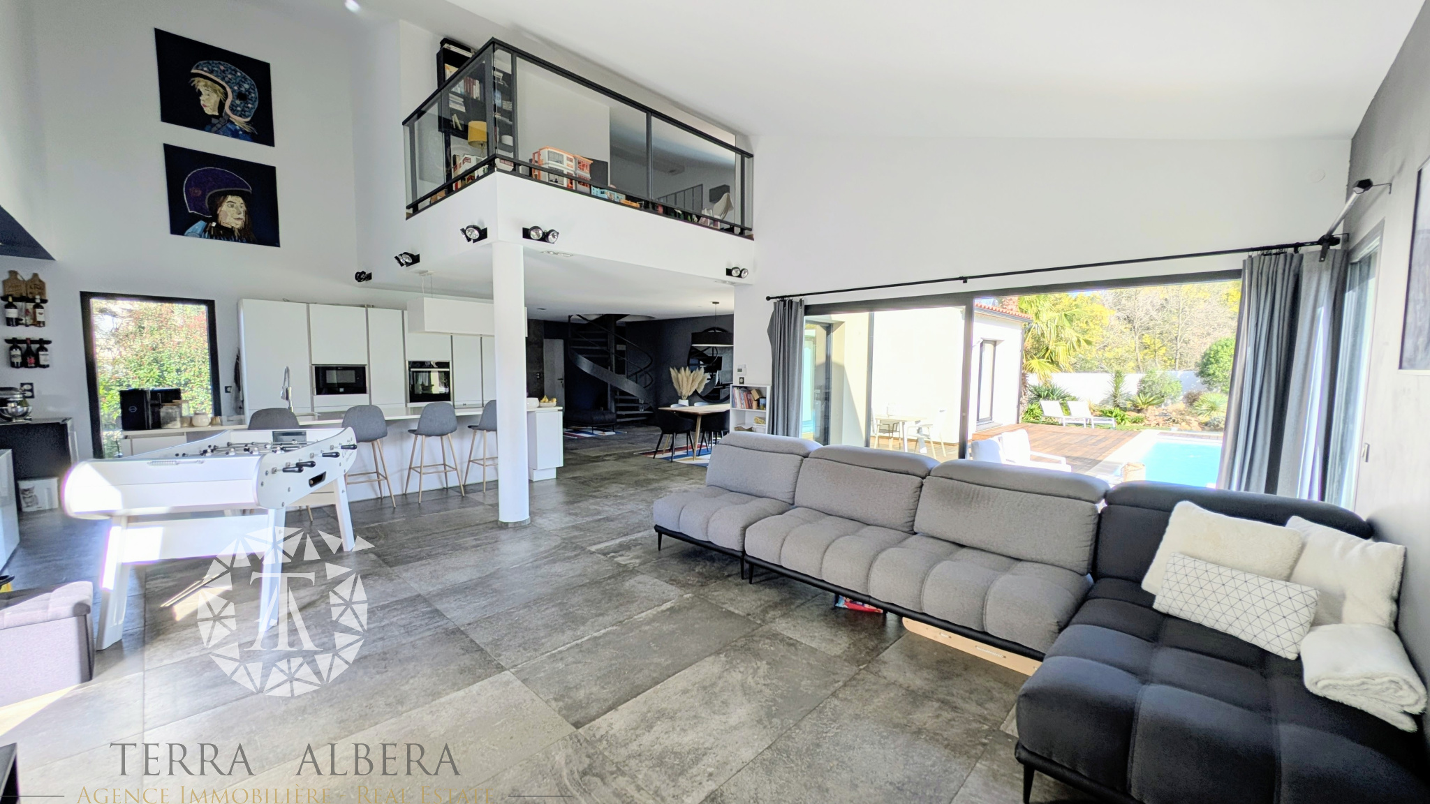 Sur plus de 1000 m2 de parcelle paysagée avec piscine, grande villa contemporaine de part son immense espace ouvert de lieu de vie et les prestations fournies, réparti sur 208 m2 hab plus de nombreuses surfaces utiles telque garage pour 2 véhicules, annexe indépendante de rangement ou pour 2 roues, cusine d'été.
