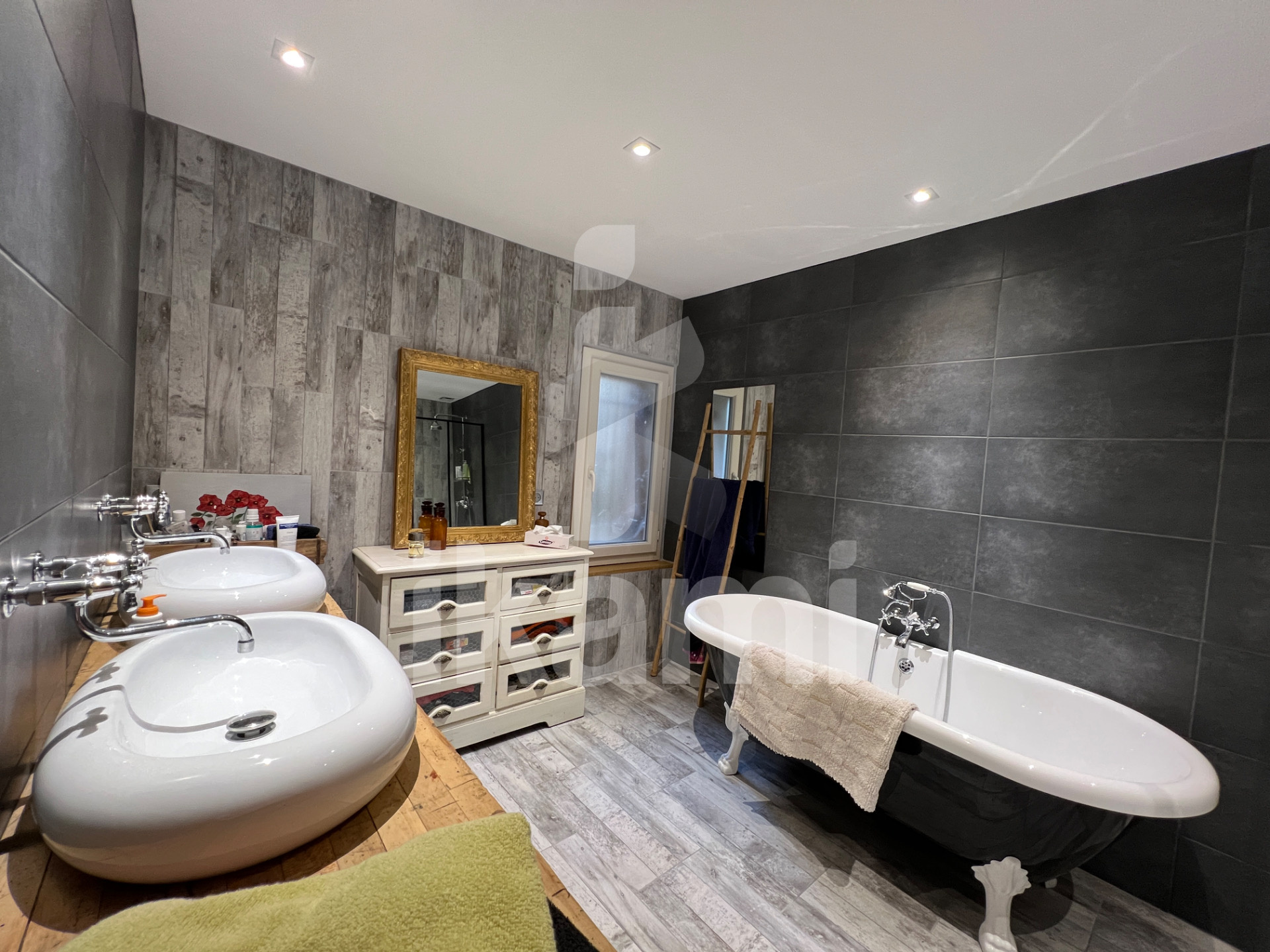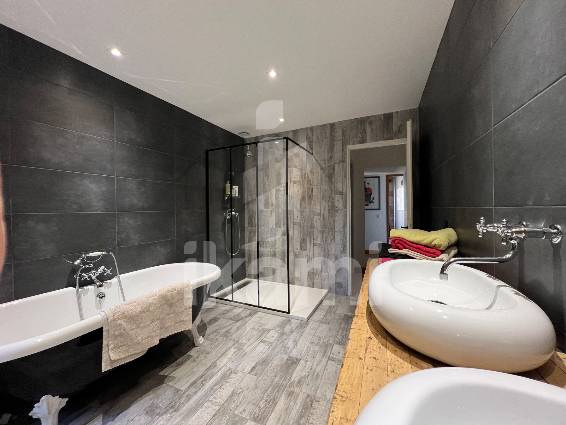 VOLUMES GÉNÉREUX PIÈCES DE VIE LUMINEUSES : Avec une surface habitable d'environ 216 m2, le bien dispose de quatre chambres dont une de plain-pied. La cuisine ouverte s'intègre harmonieusement au séjour et au vaste salon équipé d'une cheminée avec insert, formant un espace convivial et lumineux. Le rez-de-chaussée comprend également une salle de bain complète et des toilettes indépendantes. Une véranda prolonge les espaces vers un jardin entièrement clos, tandis qu'une petite terrasse indépendante attenante à la cuisine crée un lieu extérieur intime et agréable. À l'étage, une mezzanine dessert un palier, un bureau, deux chambres, un dressing ainsi qu'une salle d'eau avec douche à l'italienne et toilettes séparées.