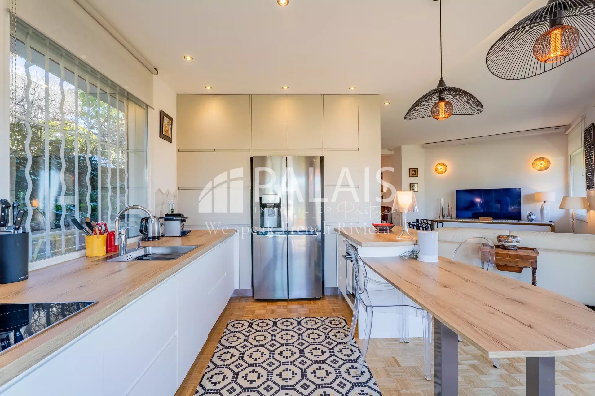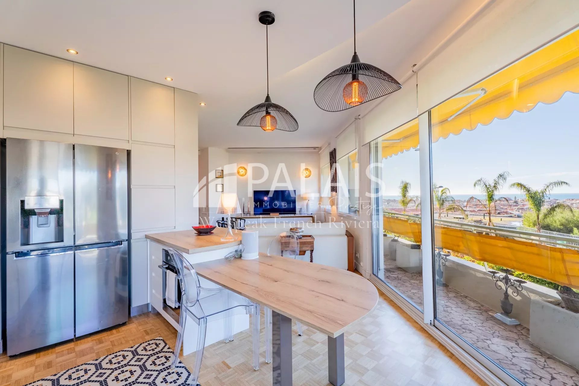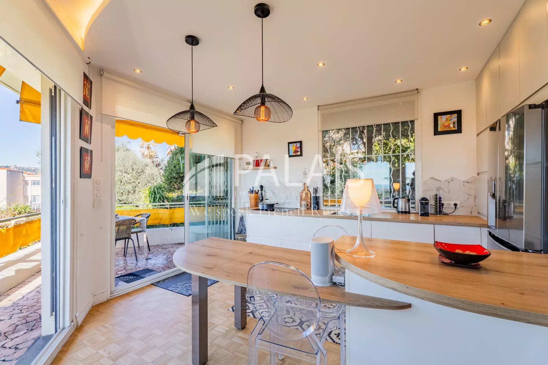 Grand espace de séjour avec sa cuisine américaine tout équipée. 2 chambres et salle de bains. Climatisation.