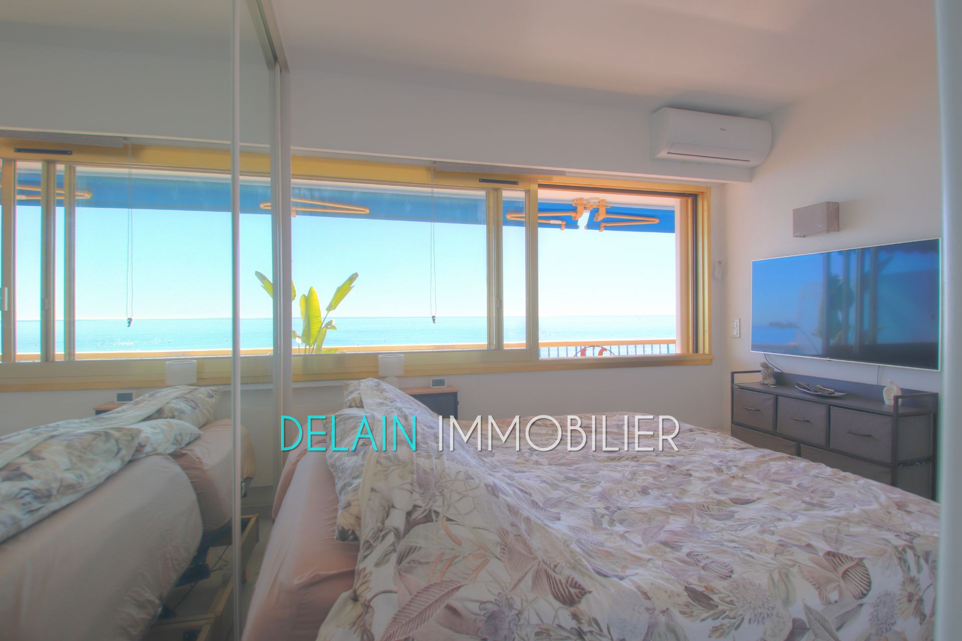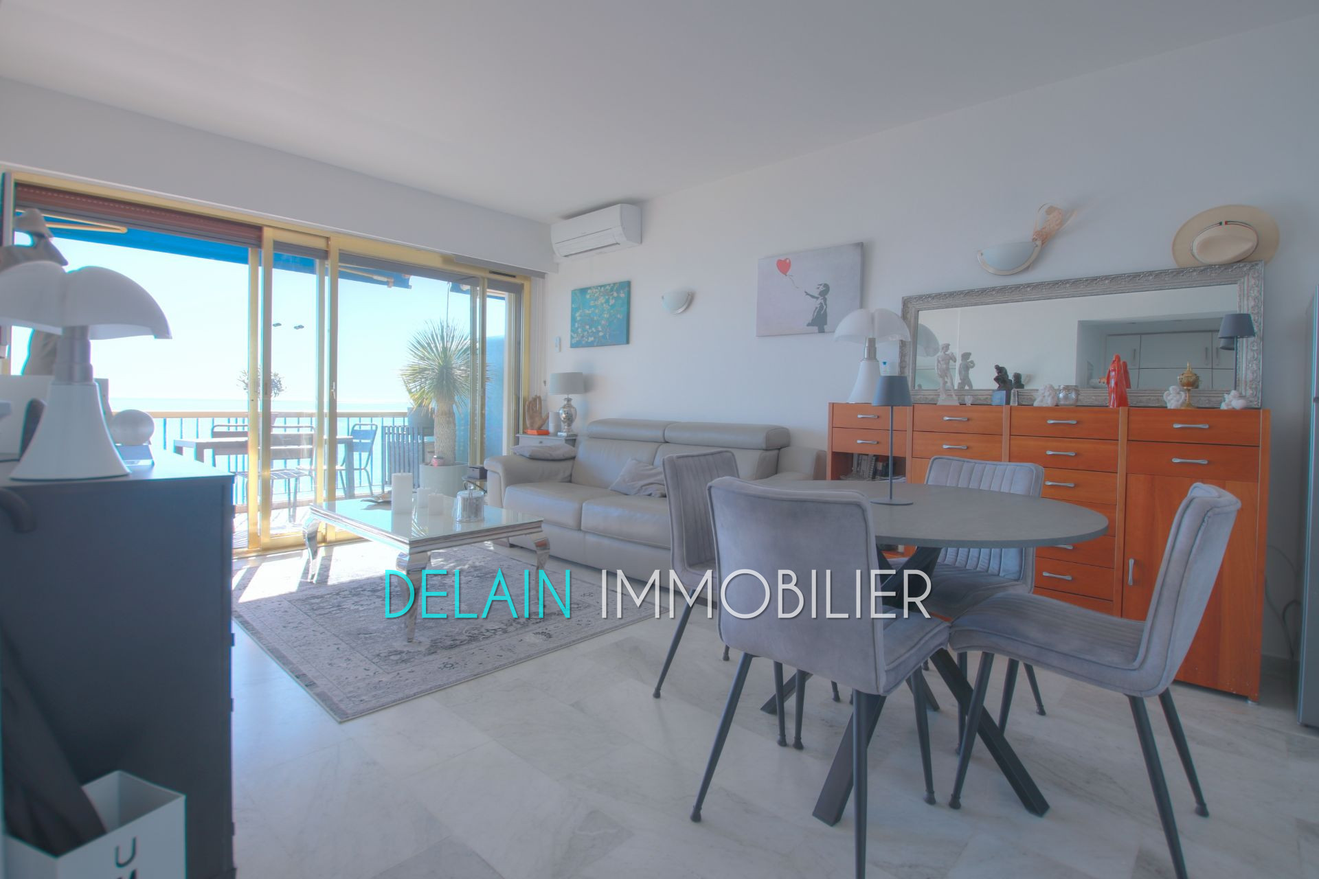 CAGNES SUR MER. En bord de mer, au 5ème étage, ce joli deux pièces de 38m² s'ouvre sur une terrasse de 16m² avec vue panoramique sur la mer du Cap d'Antibes au Cap de Nice. Il suit le plan suivant: entrée sur séjour avec petite cuisine dotée d'un équipement complet, séjour, chambre avec salle d'eau complète et coin buanderie., terrasse. L'appartement est vendu meublé et équipé.