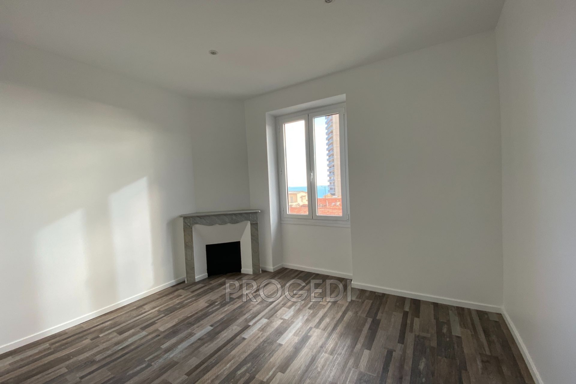 Beausoleil, proche centre-ville, deux pièces en dernier étage, loué vide, composé d'un séjour avec cuisine américaine aménagée, chambre, salle de douche, water-closet, et balcon. Appartement rénové avec climatisation.