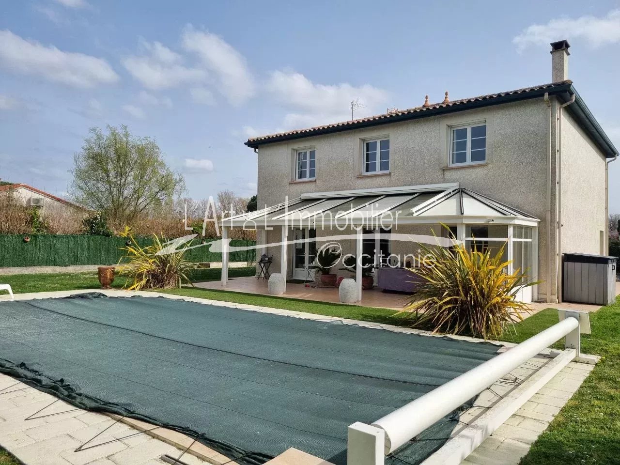 Belle Maison traditionnelle de type 6, édifiée sur 2 niveaux, offrant de belles prestations, de beaux espaces et volumes, hauteur sous plafond 2.70 m. Son intérieur est composé de sa belle entrée, placard, escalier de bois exotique. Séjour lumineux et traversant agrémenté de sa cheminée, cuisine équipée haut de gamme, cellier. Dégagement nuit, chambre, placard, salle d'eau, toilettes. A l'étage, palier, espace bureau ou salon intime, 3 chambres + chambre ou bureau, salle de bains, toilettes. Dressing. Double garage, indépendant 42 m². Puits, arrosage intégré. Piscine 8.80/4.60 + escalier. Fond diamant, 2 m de prof, 0.9 env. sur les bords. Traitement chlore. Présence de panneaux photovoltaïques, bonne rentabilité. L'ensemble édifié sur un beau terrain clos de 1414 m².