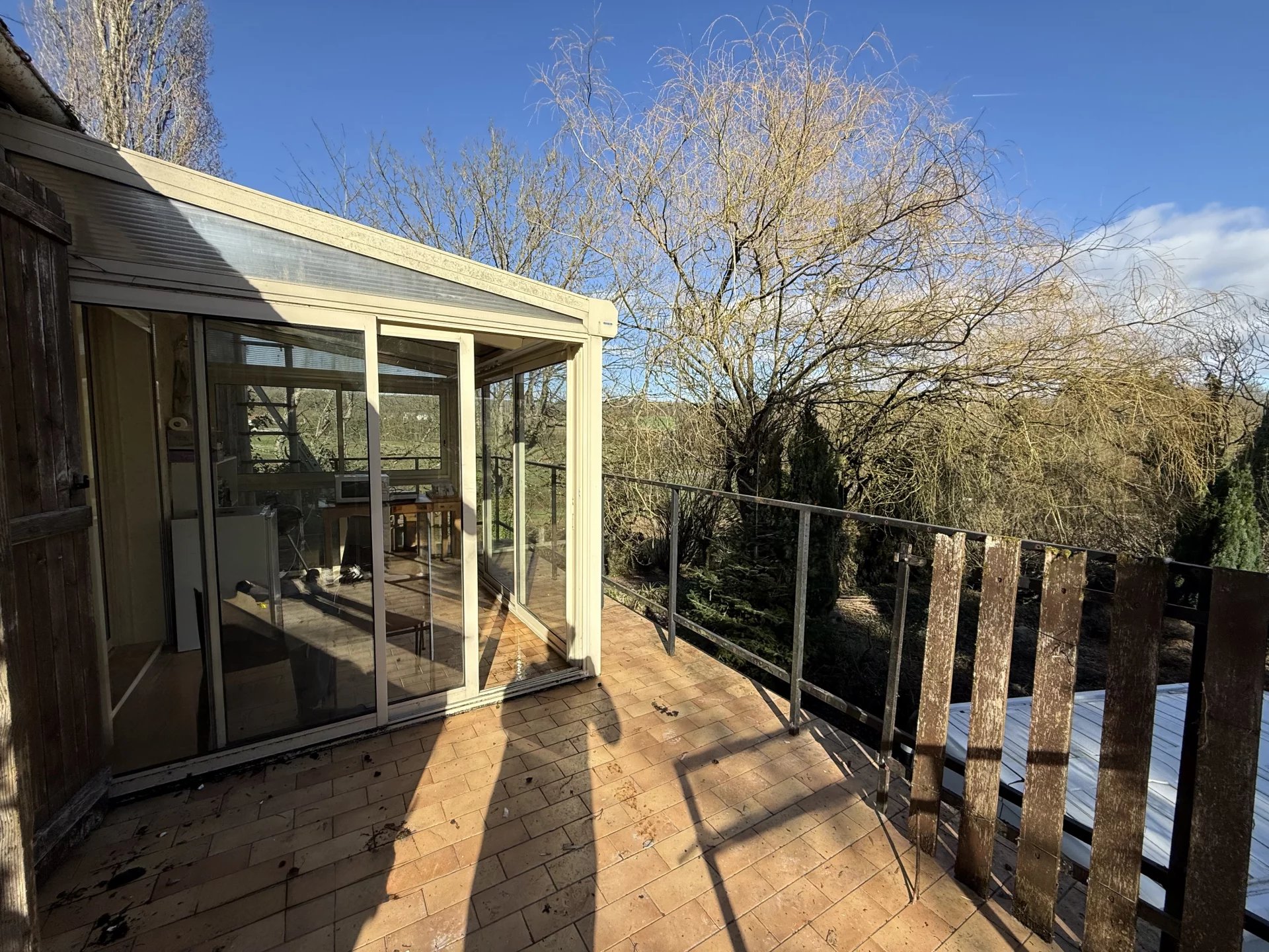 Cet espace dessert une véranda, prolongée par une terrasse offrant une vue imprenable sur le jardin.